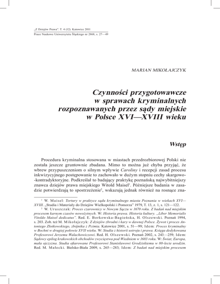„Z Dziejów Prawa”. T. 4 (12). Katowice 2011 Prace Naukowe Uniwersytetu Śląskiego nr 2868, s. 27—49 MARIAN MIKOŁAJCZYK Czynności przygotowawcze w sprawach kryminalnych rozpoznawanych przez sądy miejskie w Polsce XVI—XVIII wieku Wstęp Procedura kryminalna stosowana w miastach przedrozbiorowej Polski nie została jeszcze gruntownie zbadana. Mimo to można już chyba przyjąć, że wbrew przypuszczeniom o silnym wpływie Caroliny i recepcji zasad procesu inkwizycyjnego postępowanie to zachowało w dużym stopniu cechy skargowo-kontradyktoryjne. Podkreślał to badający praktykę poznańską najwybitniejszy znawca dziejów prawa miejskiego Witold Maisel. Późniejsze badania w zasadzie potwierdzają to spostrzeżenie, wskazują jednak również na rosnące zna W. M a i s el: Tortury w praktyce sądu kryminalnego miasta Poznania w wiekach XVI— XVIII. „Studia i Materiały do Dziejów Wielkopolski i Pomorza” 1979, T. 13, z. 1, s. 121—122. W. Ur u s z c z a k: Proces czarownicy w Nowym Sączu w 1670 roku. Z badań nad miejskim procesem karnym czasów nowożytnych. W: Historia prawa. Historia kultury. „Liber Memorialis Vitoldo Maisel dedicatus”. Red. E. B o r kow s k a - B a g ie ń s k a, H. Ol s z e w s k i. Poznań 1994, s. 203. Zob. też M. M i ko ł ajc z y k: Z dziejów zbrodni i kary w dawnej Polsce. Żywot i proces Antoniego Złotkowskiego, zbójnika z Pcimia. Katowice 2001, s. 51—99; Id e m: Proces kryminalny w Bochni w drugiej połowie XVII wieku. W: Studia z historii ustroju i prawa. Księga dedykowana Profesorowi Jerzemu Walachowiczowi. Red. H. Ol s z e w s k i. Poznań 2002, s. 243—259; Id e m: Sądowy epilog krakowskich obchodów zwycięstwa pod Wiedniem w 1683 roku. W: Świat, Europa, mała ojczyzna. Studia ofiarowane Profesorowi Stanisławowi Grodziskiemu w 80-lecie urodzin. Red. M. M a ł e c k i. Bielsko-Biała 2009, s. 265—283; Id e m: Z badań nad miejskim procesem 28 Marian Mikołajczyk czenie skargi publicznej jako podstawy wszczęcia postępowania przed sądem. Należałoby jednak zadać pytanie, czy wniesienie skargi było istotnie pierwszą czynnością w sprawie, czy też postępowanie sądowe poprzedzały czynności wstępne. Winniśmy też zadać pytanie o częstotliwość ich występowania, jak i o to, czy miały one charakter zorganizowanego postępowania przygotowawczego. Nie bez znaczenia może się okazać również kwestia, przez kogo owe czynności były inicjowane, kto je prowadził, czy w toku ich przeprowadzania kierowano się jakimiś regułami itd. Podstawowymi źródłami są w tym wypadku dokumenty praktyki. Badaniami objęto przede wszystkim zachowane księgi spraw kryminalnych (tzw. księgi czarne, smolne) miast Małopolski, np.: Krakowa, Biecza, Bochni, Nowego Sącza, Tarnowa. Wyjątkowo sięgano również do innych ksiąg sądowych — dokładnie przestudiowano zwłaszcza akta Nowej Góry, w której nie prowadzono odrębnych ksiąg spraw karnych. Protestacje, obdukcje i wizje Nawet pobieżne zapoznanie się z zawartością miejskich ksiąg sądowych pozwala stwierdzić, że przynajmniej w niektórych przypadkach wniesienie sprawy do sądu poprzedzały czynności o charakterze przygotowawczym. Wśród nich wyróżnia się grupa czynności bardzo podobnych do wstępnych stadiów postępowania w prawie polskim (ziemskim). W prawie tym wszczęcie postępowania karnego winno być poprzedzone manifestem zwanym też protestacją. Pokrzywdzony jak najszybciej udawał się do urzędu grodzkiego i zeznawał o popełnionym przestępstwie, poniesionych szkodach itp., wyrażając jednocześnie gotowość wniesienia oskarżenia. karnym w dawnej Polsce. Sprawa Konstancji Piotrowskiej o zabójstwo z roku 1776. W: „Z dziejów prawa”. Cz. 5. Red. A. Lit y ń s k i. Katowice 2004, s. 9—19. Por. jednak odmienne spostrzeżenia w M. M i ko ł ajc z y k: Proces kryminalny w Nowej Górze XVI—XVIII wieku. W: „Miscellanea Iuridica”. T. 7: Między I a III Rzecząpospolitą. Kształtowanie europejskiej kultury prawnej. Prace ofiarowane prof. zw. dr. hab. Adamowi Lityńskiemu w czterdziestolecie pracy naukowej. Red. M. M i ko ł ajc z y k, A. D r ogo ń. Tychy 2005, s. 176—217, a zwłaszcza Id e m: Proces kryminalny w Oświęcimiu w I połowie XVIII w. Z badań nad prawem miejskim dawnej Rzeczypospolitej. W: Dyplomacja. Polityka. Prawo. Księga pamiątkowa ofiarowana Profesorowi Henrykowi Kocójowi w siedemdziesiątą rocznicę urodzin. Red. I. Pa n ic. Katowice 2001, s. 234—242. Por. M. M i ko ł ajc z y k: Wszczęcie postępowania karnego przed sądami miejskimi w Polsce XVI—XVIII wieku. „Czasopismo Prawno-Historyczne” 2005, T. 57, z. 1, s. 57—82; zob. też przypis poprzedni. O. B a l z e r: Przewód sądowy polski w zarysie. (Wykład uniwersytecki). Wyd. W. He jn o s z. Lwów 1935, s. 45—46; S. K u t r z e b a: Dawne polskie prawo sądowe w zarysie. (I. Prawo karne. Czynności przygotowawcze w sprawach kryminalnych… 29 Tego typu wstępne działania nie były też obce prawu miejskiemu. Na przykład w 1686 r. w Nowej Górze zapisano protestację wniesioną przez Franciszka Świątkowskiego „naprzeciwko Piotrowi Cieckowi i jego kolegom”, w której skarżący się zarzucał im między innymi pobicie. W 1692 r. na krakowski ratusz przyszedł Michał Sercowicz i donosił o nocnym napadzie na jego dom. Znamy też przypadek oświadczenia złożonego na wszelki wypadek, by nie zostać posądzonym o popełnienie przestępstwa. Przykłady, którymi dysponujemy, są stosunkowo nieliczne; w rzeczywistości prawdopodobnie były wykorzystywane znacznie częściej, potrzebne są jednak w tym wypadku dalsze badania wykraczające poza księgi spraw kryminalnych. Z protestacją było w pewnym stopniu związane tzw. publikowanie przestępstwa. Oto w 1762 r. w Tarnowie, zanim rozpoczął się proces, „na instancyją starozakonnego Herslego” zostało „przez urząd wójtowski tarnowski nakazane II. Postępek sądowy). Lwów—W