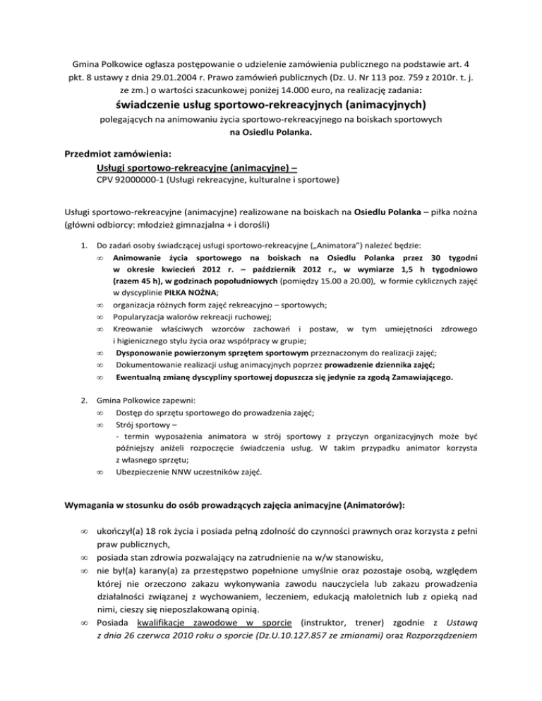 Gmina Polkowice ogłasza postępowanie o udzielenie zamówienia publicznego na podstawie art. 4 pkt. 8 ustawy z dnia 29.01.2004 r. Prawo zamówień publicznych (Dz. U. Nr 113 poz. 759 z 2010r. t. j. ze zm.) o wartości szacunkowej poniżej 14.000 euro, na realizację zadania: świadczenie usług sportowo-rekreacyjnych (animacyjnych) polegających na animowaniu życia sportowo-rekreacyjnego na boiskach sportowych na Osiedlu Polanka. Przedmiot zamówienia: Usługi sportowo-rekreacyjne (animacyjne) – CPV 92000000-1 (Usługi rekreacyjne, kulturalne i sportowe) Usługi sportowo-rekreacyjne (animacyjne) realizowane na boiskach na Osiedlu Polanka – piłka nożna (główni odbiorcy: młodzież gimnazjalna + i dorośli) 1. Do zadań osoby świadczącej usługi sportowo-rekreacyjne („Animatora”) należeć będzie: • Animowanie życia sportowego na boiskach na Osiedlu Polanka przez 30 tygodni w okresie kwiecień 2012 r. – październik 2012 r., w wymiarze 1,5 h tygodniowo (razem 45 h), w godzinach popołudniowych (pomiędzy 15.00 a 20.00), w formie cyklicznych zajęć w dyscyplinie PIŁKA NOŻNA; • organizacja różnych form zajęć rekreacyjno – sportowych; • Popularyzacja walorów rekreacji ruchowej; • Kreowanie właściwych wzorców zachowań i postaw, w tym umiejętności zdrowego i higienicznego stylu życia oraz współpracy w grupie; • Dysponowanie powierzonym sprzętem sportowym przeznaczonym do realizacji zajęć; • Dokumentowanie realizacji usług animacyjnych poprzez prowadzenie dziennika zajęć; • Ewentualną zmianę dyscypliny sportowej dopuszcza się jedynie za zgodą Zamawiającego. 2. Gmina Polkowice zapewni: • Dostęp do sprzętu sportowego do prowadzenia zajęć; • Strój sportowy – - termin wyposażenia animatora w strój sportowy z przyczyn organizacyjnych może być późniejszy aniżeli rozpoczęcie świadczenia usług. W takim przypadku animator korzysta z własnego sprzętu; • Ubezpieczenie NNW uczestników zajęć. Wymagania w stosunku do osób prowadzących zajęcia animacyjne (Animatorów): • • • • ukończył(a) 18 rok życia i posiada pełną zdolność do czynności prawnych oraz korzysta z pełni praw publicznych, posiada stan zdrowia pozwalający na zatrudnienie na w/w stanowisku, nie był(a) karany(a) za przestępstwo popełnione umyślnie oraz pozostaje osobą, względem której nie orzeczono zakazu wykonywania zawodu nauczyciela lub zakazu prowadzenia działalności związanej z wychowaniem, leczeniem, edukacją małoletnich lub z opieką nad nimi, cieszy się nieposzlakowaną opinią. Posiada kwalifikacje zawodowe w sporcie (instruktor, trener) zgodnie z Ustawą z dnia 26 czerwca 2010 roku o sporcie (Dz.U.10.127.857 ze zmianami) oraz Rozporządzeniem • • Ministra Sportu i Turystyki z dnia 18 lutego 2011 roku w sprawie szczegółowych warunków uzyskiwania kwalifikacji zawodowych w sporcie (Dz.U.11.44.233 ze zmianami) lub/oraz kwalifikacje zawodowe nauczyciela wychowania fizycznego zgodnie z obowiązującymi przepisami prawa lub/oraz uprawnienia do organizowania działalności w dziedzinie rekreacji ruchowej (obligatoryjne); Posiadanie przygotowanie pedagogiczne (mile widziane); Ukończony kurs udzielania pierwszej pomocy (mile widziane); Forma zlecenia usługi: • Umowa zlecenie Sposób przygotowania oferty: • • Ofertę należy złożyć na formularzu ofertowym; Do oferty należy dołączyć CV Animatora(ów) opatrzone klauzulą o zgodzie na przetwarzanie danych osobowych do celów rekrutacji/wyboru oferty o Nie należy dołączać dokumentów potwierdzających posiadane kwalifikacje zawodowe i uprawnienia. Dokumentów oznaczonych jako obligatoryjne zamawiający zażąda przed podpisaniem umowy. Termin i sposób składania ofert: • • Termin: 30 marca 2012 r. do godziny 10.00 Sposób: o Tradycyjnie: Wypełniony i podpisany formularz ofertowy oraz CV Animatora(ów) należy złożyć w kopercie z dopiskiem: „Oferta Animator” w kancelarii Urzędu Gminy, ul. Rynek 1, 59-100 Polkowice o Elektronicznie: Wypełniony formularz ofertowy oraz CV Animatora(ów) należy przesłać na adres e-mail: [email protected] wpisując temat widomości: „Oferta Animator”. W przypadku wyboru ofert Zamawiający wezwie wykonawcę do podpisania przesłanych dokumentów. Kryterium wyboru oferty: • Cena. Zamawiający podejmie negocjacje z wykonawcami, których oferty spełnią warunki określone w Zapytaniu ofertowym. Osoba do kontaktu: • Paweł Rudkowski Tel. (076) 84-74-152 e-mail: [email protected]