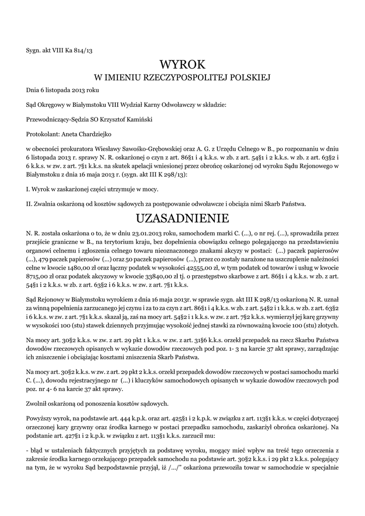 Sygn. akt VIII Ka 814/13 WYROK W IMIENIU RZECZYPOSPOLITEJ POLSKIEJ Dnia 6 listopada 2013 roku Sąd Okręgowy w Białymstoku VIII Wydział Karny Odwoławczy w składzie: Przewodniczący-Sędzia SO Krzysztof Kamiński Protokolant: Aneta Chardziejko w obecności prokuratora Wiesławy Sawośko-Grębowskiej oraz A. G. z Urzędu Celnego w B., po rozpoznaniu w dniu 6 listopada 2013 r. sprawy N. R. oskarżonej o czyn z art. 86§1 i 4 k.k.s. w zb. z art. 54§1 i 2 k.k.s. w zb. z art. 63§2 i 6 k.k.s. w zw. z art. 7§1 k.k.s. na skutek apelacji wniesionej przez obrońcę oskarżonej od wyroku Sądu Rejonowego w Białymstoku z dnia 16 maja 2013 r. (sygn. akt III K 298/13): I. Wyrok w zaskarżonej części utrzymuje w mocy. II. Zwalnia oskarżoną od kosztów sądowych za postępowanie odwoławcze i obciąża nimi Skarb Państwa. UZASADNIENIE N. R. została oskarżona o to, że w dniu 23.01.2013 roku, samochodem marki C. (...), o nr rej. (...), sprowadziła przez przejście graniczne w B., na terytorium kraju, bez dopełnienia obowiązku celnego polegającego na przedstawieniu organowi celnemu i zgłoszenia celnego towaru nieoznaczonego znakami akcyzy w postaci: (...) paczek papierosów (...), 479 paczek papierosów (...) oraz 50 paczek papierosów (...), przez co zostały narażone na uszczuplenie należności celne w kwocie 1480,00 zł oraz łączny podatek w wysokości 42555,00 zł, w tym podatek od towarów i usług w kwocie 8715,00 zł oraz podatek akcyzowy w kwocie 33840,00 zł tj. o przestępstwo skarbowe z art. 86§1 i 4 k.k.s. w zb. z art. 54§1 i 2 k.k.s. w zb. z art. 63§2 i 6 k.k.s. w zw. z art. 7§1 k.k.s. Sąd Rejonowy w Białymstoku wyrokiem z dnia 16 maja 2013r. w sprawie sygn. akt III K 298/13 oskarżoną N. R. uznał za winną popełnienia zarzucanego jej czynu i za to za czyn z art. 86§1 i 4 k.k.s. w zb. z art. 54§2 i 1 k.k.s. w zb. z art. 63§2 i 6 k.k.s. w zw. z art. 7§1 k.k.s. skazał ją, zaś na mocy art. 54§2 i 1 k.k.s. w zw. z art. 7§2 k.k.s. wymierzył jej karę grzywny w wysokości 100 (stu) stawek dziennych przyjmując wysokość jednej stawki za równoważną kwocie 100 (stu) złotych. Na mocy art. 30§2 k.k.s. w zw. z art. 29 pkt 1 k.k.s. w zw. z art. 31§6 k.k.s. orzekł przepadek na rzecz Skarbu Państwa dowodów rzeczowych opisanych w wykazie dowodów rzeczowych pod poz. 1- 3 na karcie 37 akt sprawy, zarządzając ich zniszczenie i obciążając kosztami zniszczenia Skarb Państwa. Na mocy art. 30§2 k.k.s. w zw. z art. 29 pkt 2 k.k.s. orzekł przepadek dowodów rzeczowych w postaci samochodu marki C. (...), dowodu rejestracyjnego nr (...) i kluczyków samochodowych opisanych w wykazie dowodów rzeczowych pod poz. nr 4- 6 na karcie 37 akt sprawy. Zwolnił oskarżoną od ponoszenia kosztów sądowych. Powyższy wyrok, na podstawie art. 444 k.p.k. oraz art. 425§1 i 2 k.p.k. w związku z art. 113§1 k.k.s. w części dotyczącej orzeczonej kary grzywny oraz środka karnego w postaci przepadku samochodu, zaskarżył obrońca oskarżonej. Na podstanie art. 427§1 i 2 k.p.k. w związku z art. 113§1 k.k.s. zarzucił mu: - błąd w ustaleniach faktycznych przyjętych za podstawę wyroku, mogący mieć wpływ na treść tego orzeczenia z zakresie środka karnego orzekającego przepadek samochodu na podstawie art. 30§2 k.k.s. i 29 pkt 2 k.k.s. polegający na tym, że w wyroku Sąd bezpodstawnie przyjął, iż /…/” oskarżona przewoziła towar w samochodzie w specjalnie przygotowanych do tego ściankach bocznych oraz oparciach siedzeń pojazdu a więc specjalnie wykonanych skrytkach, co dobitnie ukazuje materiał zdjęciowy /k. 39-41/”, podczas gdy w rzeczywistości nie ujawniono żadnych dowodów potwierdzających ową wersję o przystosowaniu samochodu, co w konsekwencji doprowadziło do błędnej subsumpcji prawa materialnego i bezzasadnego orzeczenia przepadku samochodu marki C. (...), - rażącą niewspółmierność orzeczonej kary grzywny do przypisanego czynu i możliwości majątkowej oskarżonej. Na podstawie art. 427§1 i 437§2 k.p.k. wniósł o zmianę wyroku w zaskarżonej części przez: a) uchylenie zawartego w pkt 3 wyroku orzeczenia o przepadku samochodu C. (...), dowodu rejestracyjnego nr (...) i kluczyków samochodowych opisanych w wykazie dowodów rzeczowych pod poz. Nr 4-6 na karcie 37 akt sprawy. b) wydatne obniżenie wymiaru orzeczonej kary grzywny. Sąd Okręgowy zważył, co następuje: Apelacja obrońcy oskarżonego, chociaż w pewnym aspekcie nie pozbawiona słuszności, nie zasługuje na uwzględnienie. Należy zgodzić się z apelującym, że Sąd I instancji przyjmując, iż oskarżona N. R. przewoziła wyroby tytoniowe w samochodzie C. (...) „w specjalnie przygotowanych do tego ściankach bocznych oraz oparciach siedzeń pojazdu, a więc specjalnie wykonanych skrytkach”, dopuścił się błędu w ustaleniach faktycznych. Błąd ten był wynikiem nieprawidłowej oceny dowodu w postaci materiału zdjęciowego znajdującego się na kartach nr 39 – 41 oraz nieuwzględnienia innych zgromadzonych w tym zakresie dowodów. Jak słusznie podniósł apelujący, stanowiska Sądu I instancji w omawianej kwestii nie uzasadnia analiza w/w zdjęć (na marginesie, Sąd Rejonowy nie wskazał, na czym miałoby polegać „przerobienie” w/w samochodu). Wprost przeciwnie dowodzi ona, że samochód był w oryginalnym stanie technicznym. Papierosy odnaleziono wprawdzie (oprócz umieszczonych w bagażach) w ściankach bocznych oraz oparciach siedzeń (vide nadto zeznania W. K. i J. F. oraz protokół oględzin samochodu /k. 34 – 36/). Z zeznań w/w świadków nie wynika, aby ścianki boczne i oparcia siedzeń były skrytkami „specjalnie wykonanymi” dla potrzeb przewożenia papierosów. Z w/w dowodami korespondują nadto zeznania U. S., kierującego pojazdem, który podał m.in., że w oparciach siedzeń jest wstawka, którą łatwo zdjąć (k. 89). Omówione wyżej uchybienia (obraza art. 7 k.p.k., a w jej konsekwencji błąd w ustaleniach 
