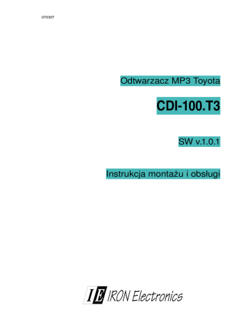 070307 Odtwarzacz MP3 Toyota CDI100.T3 SW v.1.0.1 Instrukcja montażu i obsługi 070307 Odtwarzacz MP3 Toyota © 2007 IRON Electronics Wszelkie prawa zastrzeżone. Żadna część tej publikacji nie może być kopiowana, powielana ani wykorzystywana w innych publikacjach bez uprzedniej pisemnej zgody firmy IRON Electronics. Informacje zawarte w niniejszej publikacji mogą zawierać nieścisłości techniczne lub błędy drukarskie. Informacje te są okresowo aktualizowane, a zmiany zamieszczane w następnych wydaniach tej publikacji. IRON Electronics zastrzega sobie prawo do wprowadzania ulepszeń i/lub zmian w produktach i/lub programach opisanych w tej publikacji w dowolnym czasie, bez wcześniejszego powiadomienia. Wszelkie marki obce wymieniane w niniejszej publikacji zostały użyte jedynie w celach identyfikacyjnych i należą do ich właścicieli. Aktualna wersja niniejszej publikacji dostępna jest w internecie pod adresem: http://mp3.iron.from.pl IRON Electronics ul. Mikołaja Gomółki 6 01-604 Warszawa tel./fax (48).22.839.77.87 http://www.iron.from.pl 2 070307 Odtwarzacz MP3 Toyota Spis treści Zanim zaczniesz..............................................................................4 Wygląd odtwarzacza.......................................................................5 Podłączenie urządzenia..................................................................5 Podłączenie do systemu audio.......................................................................5 Mocowanie odtwarzacza.................................................................................6 Zakończenie instalacji.....................................................................................6 Przygotowanie kart z muzyką.........................................................6 Obsługa odtwarzacza......................................................................7 Uruchamianie odtwarzacza.............................................................................7 Wybieranie utworów........................................................................................7 Tryby automatycznego wybierania utworów....................................................8 Sygnalizacja błędów........................................................................................8 Aktualizacja oprogramowania........................................................9 Wybór nowej wersji oprogramowania.............................................................9 Zapis nowej wersji oprogramowania.............................................................10 Dane techniczne............................................................................11 Indeks alfabetyczny.......................................................................13 3 070307 Odtwarzacz MP3 Toyota Zanim zaczniesz Wybierz miejsce instalacji odtwarzacza gwarantujące swobodny dostęp do gniazda karty pamięci. Decydując o miejscu instalacji odtwarzacza pamiętaj: - urządzenie nie może ograniczać pola widzenia kierowcy ani zasłaniać wskaźników deski rozdzielczej; - montaż urządzenia nie może kolidować z działaniem poduszki powietrznej ani innych systemów bezpieczeństwa; - urządzenie nie może rozpraszać uwagi kierowcy podczas jazdy. System poduszek powietrznych jest wyposażony w awaryjne źródło zasilania, które jest blokowane po upływie 90s od wyłączenia zasilania. Przed instalacją odtwarzacza wyjmij kluczyk ze stacyjki i odłącz ujemny biegun akumulatora pojazdu. Po odczekaniu 90 sekund możesz przystąpić do montażu urządzenia. W momencie odłączenia akumulatora ustawienia systemu audio, zegar radioodbiornika oraz ustawienia elektrycznie regulowanych siedzeń tylnych nie są zapamiętywane i ulegają skasowaniu. Po zakończeniu instalacji ustaw ponownie utracone ustawienia. Pozycja kierowcy (położenie siedzenia, kolumny kierownicy, lusterek etc) są zapamiętywane i nie wymagają ponownego ustawiania po odłączeniu zasilania. Uważaj, aby kabel odtwarzacza nie kolidował z ruchomymi elementami konstrukcji samochodu jak pedały czy kolumna kierownicy. Nie montuj urządzenia w miejscach narażonych na wysoką wilgotność, brud lub wysoką temperaturę. Może spowodować to uszkodzenie urządzenia niepodlegające gwarancji. Używaj tylko podanych w instrukcji materiałów i narzędzi. Użycie niewłaściwych elementów mocujących może spowodować uszkodzenie urządzenia. Postępuj zgodnie z instrukcją montażu. W razie kłopotów w trakcie eksploatacji urządzenia skontaktuj się z dystrybutorem lub działem serwisu producenta: [email protected] 4 070307 Odtwarzacz MP3 Toyota Wygląd odtwarzacza Podłączenie urządzenia Podłączenie do systemu audio Uzyskaj dostęp do tylnej ścianki radioodbiornika i zlokalizuj 12-stykowe gniazdo sterowania zmieniarką. Rys.1 Złącze starego typu Rys.2 Złącze nowego typu W samochodach Toyota występują dwa typy złącz zmieniarki przy czym złącze starego typu jest stopniowo wycofywane z użycia. Odtwarzacz CDI100.T3 jest przystosowany do nowego typu złącza. 5 070307 Odtwarzacz MP3 Toyota Jeśli radio jest wyposażone w złącze zmieniarki starego typu konieczne jest wykorzystanie dodatkowej wiązki (rozgałęźnika) W-YTS. Jeśli radio posiada złącze nowego typu, które jest już wykorzystywane (podłączona wiązka fabryczna) należy zastosować dodatkowy rozgałęźnik W-YTN. Mocowanie odtwarzacza Wybrane miejsce mocowania odtwarzacza oczyść z kurzu i środków konserwujących. Oczyść dolną powierzchnię odtwarzacza i przyklej do niej taśmę mocującą. Usuń zabezpieczenie drugiej części taśmy mocującej (bez rozczepiania obu stron taśmy). Przyłóż odtwarzacz wraz z taśmą mocującą do przygotowanej powierzchni i lekko przyciśnij. Zdejmij odtwarzacz rozczepiając taśmę, dociśnij część przylegającą do zabudowy wnętrza pojazdu i ponownie przyczep odtwarzacz dokładnie ustawiając jego położenie. Zakończenie instal