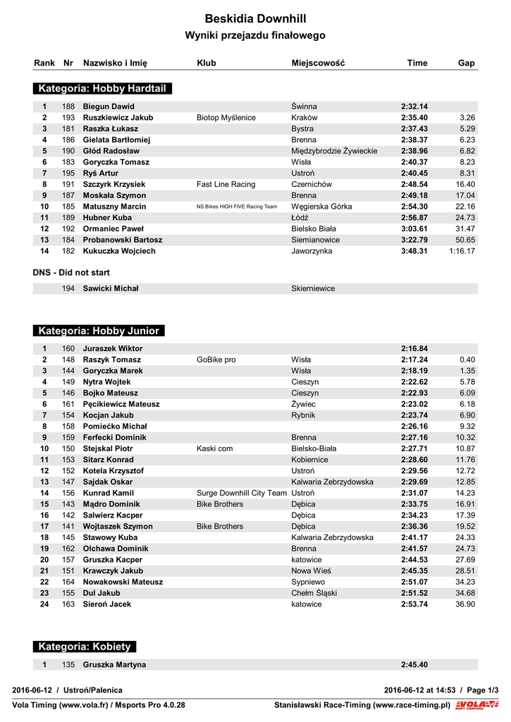 Beskidia Downhill Wyniki przejazdu finałowego Rank Nr Nazwisko i Imię Klub Miejscowość Time Gap 2:32.14 2:35.40 2:37.43 2:38.37 2:38.96 2:40.37 2:40.45 2:48.54 2:49.18 2:54.30 2:56.87 3:03.61 3:22.79 3:48.31 3.26 5.29 6.23 6.82 8.23 8.31 16.40 17.04 22.16 24.73 31.47 50.65 1:16.17 2:16.84 2:17.24 2:18.19 2:22.62 2:22.93 2:23.02 2:23.74 2:26.16 2:27.16 2:27.71 2:28.60 2:29.56 2:29.69 2:31.07 2:33.75 2:34.23 2:36.36 2:41.17 2:41.57 2:44.53 2:45.35 2:51.07 2:51.52 2:53.74 0.40 1.35 5.78 6.09 6.18 6.90 9.32 10.32 10.87 11.76 12.72 12.85 14.23 16.91 17.39 19.52 24.33 24.73 27.69 28.51 34.23 34.68 36.90 Kategoria: Hobby Hardtail 1 2 3 4 5 6 7 8 9 10 11 12 13 14 188 193 181 186 190 183 195 191 187 185 189 192 184 182 Biegun Dawid Ruszkiewicz Jakub Raszka Łukasz Gielata Bartłomiej Głód Radosław Goryczka Tomasz Ryś Artur Szczyrk Krzysiek Moskała Szymon Matuszny Marcin Hubner Kuba Ormaniec Paweł Probanowski Bartosz Kukuczka Wojciech Biotop Myślenice Fast Line Racing NS Bikes HIGH FIVE Racing Team Świnna Kraków Bystra Brenna Międzybrodzie Żywieckie Wisła Ustroń Czernichów Brenna Węgierska Górka Łódź Bielsko Biała Siemianowice Jaworzynka DNS - Did not start 194 Sawicki Michał Skierniewice Kategoria: Hobby Junior 1 2 3 4 5 6 7 8 9 10 11 12 13 14 15 16 17 18 19 20 21 22 23 24 160 148 144 149 146 161 154 158 159 150 153 152 147 156 143 142 141 145 162 157 151 164 155 163 Juraszek Wiktor Raszyk Tomasz Goryczka Marek Nytra Wojtek Bojko Mateusz Pęcikiewicz Mateusz Kocjan Jakub Pomiećko Michał Ferfecki Dominik Stejskal Piotr Sitarz Konrad Kotela Krzysztof Sajdak Oskar Kunrad Kamil Mądro Dominik Salwierz Kacper Wojtaszek Szymon Stawowy Kuba Olchawa Dominik Gruszka Kacper Krawczyk Jakub Nowakowski Mateusz Dul Jakub Sieroń Jacek GoBike pro Wisła Wisła Cieszyn Cieszyn Żywiec Rybnik Brenna Bielsko-Biała Kobiernice Ustroń Kalwaria Zebrzydowska Surge Downhill City Team Ustroń Bike Brothers Dębica Dębica Bike Brothers Dębica Kalwaria Zebrzydowska Brenna katowice Nowa Wieś Sypniewo Chełm Śląski katowice Kaski com Kategoria: Kobiety 1 135 Gruszka Martyna 2016-06-12 / Ustroń/Palenica Vola Timing (www.vola.fr) / Msports Pro 4.0.28 2:45.40 2016-06-12 at 14:53 / Page 1/3 VolaSoftControlPdf Stanisławski Race-Timing (www.race-timing.pl) Beskidia Downhill Wyniki przejazdu finałowego Rank Nr 2 3 4 5 132 133 131 134 Nazwisko i Imię Klub Miejscowość Wojtas Laura Waliczek Emanuela Domagała Anna Gaszczyk Monika Biotop Bielsko-Biala Górki Wielkie Sosnowiec Lędziny Time Gap 2:46.37 3:02.42 3:08.96 4:09.77 0.97 17.02 23.56 1:24.37 2:16.36 2:17.07 2:17.85 2:18.52 2:20.39 2:20.76 2:21.52 2:22.12 2:23.57 2:23.97 2:25.36 2:26.04 2:26.42 2:26.52 2:26.96 2:27.18 2:27.19 2:29.61 2:29.84 2:30.81 2:31.27 2:32.36 2:33.56 2:33.64 2:33.98 2:34.40 2:37.67 2:41.12 2:41.94 2:42.31 2:42.61 2:43.32 2:45.64 2:45.89 2:46.42 2:48.86 0.71 1.49 2.16 4.03 4.40 5.16 5.76 7.21 7.61 9.00 9.68 10.06 10.16 10.60 10.82 10.83 13.25 13.48 14.45 14.91 16.00 17.20 17.28 17.62 18.04 21.31 24.76 25.58 25.95 26.25 26.96 29.28 29.53 30.06 32.50 Kategoria: Hobby Full 1 2 3 4 5 6 7 8 9 10 11 12 13 14 15 16 17 18 19 20 21 22 23 24 25 26 27 28 29 30 31 32 33 34 35 36 59 84 73 55 77 46 48 74 63 65 62 58 57 64 56 72 66 60 69 61 78 80 71 52 54 47 75 76 50 51 53 70 85 81 67 68 Seidler Petr Kołodziej Filip Wojtas Łukasz Olejnik Krzysztof Oślizło Adam Raszka Szymon Gardoń Jacek Gabzdyl Józef Gronkiewicz Łukasz Papierz Jakub Węgierek Krzysztof Roh Vojtech Goszyc Robert Łukasik Piotr Cieślik Konrad Karpus Krzysztof Lorek Adrian Gamża Kamil Arabski Piotr Pyszny Michał Oślizło Tomasz Pstuś Michał Masiak Mateusz Maćkowiak Mateusz Gardawski Sebastian Biały Piotr Plewnia Mateusz Gaszczyk Grzegorz Troszok Bartłomiej Krzykawski Kamil Błaszczak Piotr Młynarczyk Wojciech Musioł Damian Gawlik Kamil Woźniak Paweł Sorek Piotr Opava Tychy Bielsko Biała Świętochłowice Mitko MTB Jastrzębie-Zdrój Bystra Wierchomla Simoradz Kobiernice Rabka-Zdrój Inowrocław GravityRacingCZE Ostrava Surge Downhill City Team Ustroń Energy Riders Team Sosnowiec Wisłą eskimo Rabka Zdrój Cieszyn Mitko MTB Skrzyszów Jaworzno GoBikePro Rybnik Mitko MTB Jastrzębie-Zdrój Funbikes Kraków Warszawa Nowa Dęba Świętochłowice BiP Family Suicide Gravity Team Janusze Downhillu cherry hill raiders Janusze Downhillu Wodzisław Sląski Lędziny Cieszyn Dąbie Cieszyn Jaworzno Wodzisław Śląski Rybnik Skierniewice Jaworzno DNS - Did not start 49 83 Ufniarz Mateusz Gwizdała Grzegorz Erkado racing team Kraśnik Gliwice 3racing Group Zgierz Kategoria: Masters 1 30 Miśkiewicz Artur 2016-06-12 / Ustroń/Palenica Vola Timing (www.vola.fr) / Msports Pro 4.0.28 2:18.01 2016-06-12 at 14:53 / Page 2/3 VolaSoftControlPdf Stanisławski Race-Timing (www.race-timing.pl) Beskidia Downhill Wyniki przejazdu finałowego Rank Nr 2 3 4 5 6 7 8 9 10 11 12 33 23 28 31 29 24 34 26 22 25 21 Nazwisko i Imię Reclik Piotr Gembalik Piotr Woźniak Piotr Włodarski Jan Kaszubski Dominik Pechnik Petr Mołas Tomasz Kalnins Kaspars Kołodziej Arek Waliczek Konrad Polaczek Grzegorz Klub Miejscowość Gołkowice Sanok Skierniewice Bielsko-Biała Skierniewice Sportovni Kurzy Dh team Opava Sosnowiec Coach Lapsins DH Team Ragaciems Piła Górki Wielkie Opole SYNDROME RACING SSR TEAM Time Gap 2:18.19 2:22.54 2:24.16 2:27.71 2:28.14 2:28.75 2:29.37 2:29.80 2:30.75 2:34.89 3:15.20 0.18 4.53 6.15 9.70 10.13 10.74 11.36 11.79 12.74 16.88 57.19 2:12.93 2:13.29 2:13.37 2:15.48 2:18.12 2:19.12 2:19.28 2:19.37 2:22.16 0.36 0.44 2.55 5.19 6.19 6.35 6.44 9.23 DNS - Did not start 27 Skubisz Łukasz Chełm Śląski Kategoria: Elita 1 2 3 4 5 6 7 8 9 4 3 1 9 7 6 5 8 2 Hryszko Artur Konstanty Damian Macura Sebastian Giemza Bartosz Sokalski Adrian Madzia Mateusz Liepins Talis Dzięcioł Andrzej Kasperek Mateusz 2016-06-12 / Ustroń/Palenica Vola Timing (www.vola.fr) / Msports Pro 4.0.28 SDT Syndrome Racing Sanok Gravity Revolt Nowy Sącz Surge Downhill City Team Cieszyn Rybnik Chełm 