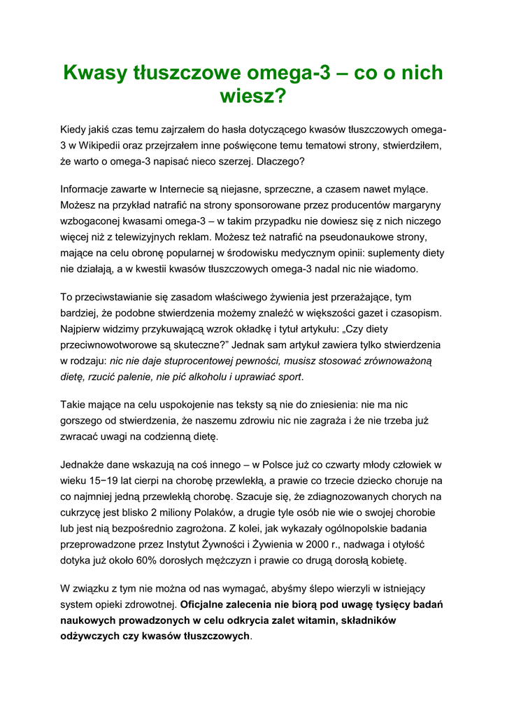 Kwasy tłuszczowe omega-3 – co o nich wiesz? Kiedy jakiś czas temu zajrzałem do hasła dotyczącego kwasów tłuszczowych omega3 w Wikipedii oraz przejrzałem inne poświęcone temu tematowi strony, stwierdziłem, że warto o omega-3 napisać nieco szerzej. Dlaczego? Informacje zawarte w Internecie są niejasne, sprzeczne, a czasem nawet mylące. Możesz na przykład natrafić na strony sponsorowane przez producentów margaryny wzbogaconej kwasami omega-3 – w takim przypadku nie dowiesz się z nich niczego więcej niż z telewizyjnych reklam. Możesz też natrafić na pseudonaukowe strony, mające na celu obronę popularnej w środowisku medycznym opinii: suplementy diety nie działają, a w kwestii kwasów tłuszczowych omega-3 nadal nic nie wiadomo. To przeciwstawianie się zasadom właściwego żywienia jest przerażające, tym bardziej, że podobne stwierdzenia możemy znaleźć w większości gazet i czasopism. Najpierw widzimy przykuwającą wzrok okładkę i tytuł artykułu: „Czy diety przeciwnowotworowe są skuteczne?” Jednak sam artykuł zawiera tylko stwierdzenia w rodzaju: nic nie daje stuprocentowej pewności, musisz stosować zrównoważoną dietę, rzucić palenie, nie pić alkoholu i uprawiać sport. Takie mające na celu uspokojenie nas teksty są nie do zniesienia: nie ma nic gorszego od stwierdzenia, że naszemu zdrowiu nic nie zagraża i że nie trzeba już zwracać uwagi na codzienną dietę. Jednakże dane wskazują na coś innego – w Polsce już co czwarty młody człowiek w wieku 15−19 lat cierpi na chorobę przewlekłą, a prawie co trzecie dziecko choruje na co najmniej jedną przewlekłą chorobę. Szacuje się, że zdiagnozowanych chorych na cukrzycę jest blisko 2 miliony Polaków, a drugie tyle osób nie wie o swojej chorobie lub jest nią bezpośrednio zagrożona. Z kolei, jak wykazały ogólnopolskie badania przeprowadzone przez Instytut Żywności i Żywienia w 2000 r., nadwaga i otyłość dotyka już około 60% dorosłych mężczyzn i prawie co drugą dorosłą kobietę. W związku z tym nie można od nas wymagać, abyśmy ślepo wierzyli w istniejący system opieki zdrowotnej. Oficjalne zalecenia nie biorą pod uwagę tysięcy badań naukowych prowadzonych w celu odkrycia zalet witamin, składników odżywczych czy kwasów tłuszczowych. Wiemy, że witamina D chroni przed nowotworami. Wiemy także, że organizm nie jest w stanie samodzielnie wytwarzać niektórych niezbędnych kwasów tłuszczowych takich jak kwasy omega-3. Jeżeli w Twojej diecie brakuje tych kwasów tłuszczowych, to z powodu ich niedoboru zaczynasz chorować. Niedobór ten prowadzi nieuchronnie do w komórkach Twojego ciała zahamowania potrzebnych reakcji chemicznych zachodzących oraz do powstawania uszkodzeń prowadzących do poważnych chorób przewlekłych takich jak cukrzyca, choroby układu sercowo-naczyniowego, artroza, osteoporoza, depresja, choroba Alzheimera i nowotwory. Działanie tych czynników zostało udokumentowane badaniami naukowymi o takiej samej wiarygodności, jaką mają badania służące wspieraniu medycyny konwencjonalnej. Celowe ich ignorowanie prowadzi do setek tysięcy zgonów rocznie, nie mówiąc o cierpieniu, którego można byłoby uniknąć, stosując się do odpowiednich zaleceń. Pozwól więc, że przedstawię Ci dziś wszystko, co musisz wiedzieć o kwasach tłuszczowych omega-3. Kwasy omega-3 nazywane są „niezbędnymi” nienasyconymi kwasami tłuszczowymi, ponieważ nasze ciało nie jest ich w stanie syntetyzować. Wpływają one pozytywnie na błony komórkowe oraz wiele procesów biochemicznych zachodzących w organizmie, w szczególności tych związanych z ciśnieniem krwi, elastycznością naczyń krwionośnych, reakcjami immunologicznymi i przeciwzapalnymi, a także sklejaniem się płytek krwi. Kwasy tłuszczowe pochodzenia zwierzęcego i roślinnego Istnieją dwa rodzaje kwasów omega-3: pochodzenia roślinnego i pochodzenia zwierzęcego. Kwasem omega-3 pochodzenia roślinnego jest kwas alfa-linolenowy (w skrócie: ALA). Cząsteczka kwasu alfa-linolenowego zawiera osiemnaście atomów węgla (to brzmi dość skomplikowanie, ale warto, abyś zapamiętał tę informację, gdyż jeszcze Ci się przyda). W idealnym świecie byłby to jedyny rodzaj kwasu omega-3, jakiego byśmy potrzebowali. Kwas alfa-linolenowy możesz zażywać pod wieloma postaciami, ale przede wszystkim znajduje się on w siemieniu lnianym. Aby zapewnić optymalne działanie kwasów omega-3, pamiętaj o tym, aby stosować świeże, nieutlenione i niedawno tłoczone oleje. Kiedy jesz siemię lniane, nasiona lnu przechodzą przez Twój układ pokarmowy najczęściej w niezmienionej formie, ponieważ są malutkie i mają twardą łuskę – ciężko więc je pogryźć. Dlatego warto je przed spożyciem zemleć. Jeżeli kupujesz oleje roślinne produkowane na skalę przemysłową, pamiętaj, aby przechowywać je w odpowiedni sposób (w ciemnym i chłodnym miejscu). Wiąże się to z tym, że kwasy omega-3 mają podwójne wiązania chemiczne (nadające im odpowiednie właściwości biologiczne), które są niezwykle wrażliwe na działanie utleniaczy oraz wysokich temperatur. Oleje łatwo jełczeją (ulegają utlenieniu), stają się toksyczne i przestają przynosić korzyści zdrowotne. Wszyscy potrzebujemy kwasów omega-3 pochodzenia roślinnego – koniecznie używaj więc świeżych olejów. Większość ekspertów twierdzi, że kwasy tłuszczowe omega-3 pochodzenia roślinnego w zupełności wystarczają nam do zachowania zdrowia, jednakże nie do końca jest to prawdą. W rzeczywistości, choć kwas alfa-linolenowy odgrywa niezwykle ważną rolę, Twoje ciało musi przekształcać go w inne podobne związki, które mają nieco inne zastosowanie. Dzięki dodaniu dwóch atomów węgla do kwasu alfa-linolenowego w Twoim organizmie wytwarza się kwas eikozapentaenowy (EPA). Z kolei EPA przekształcany jest w eikozanoidy należące do serii III, czyli subst