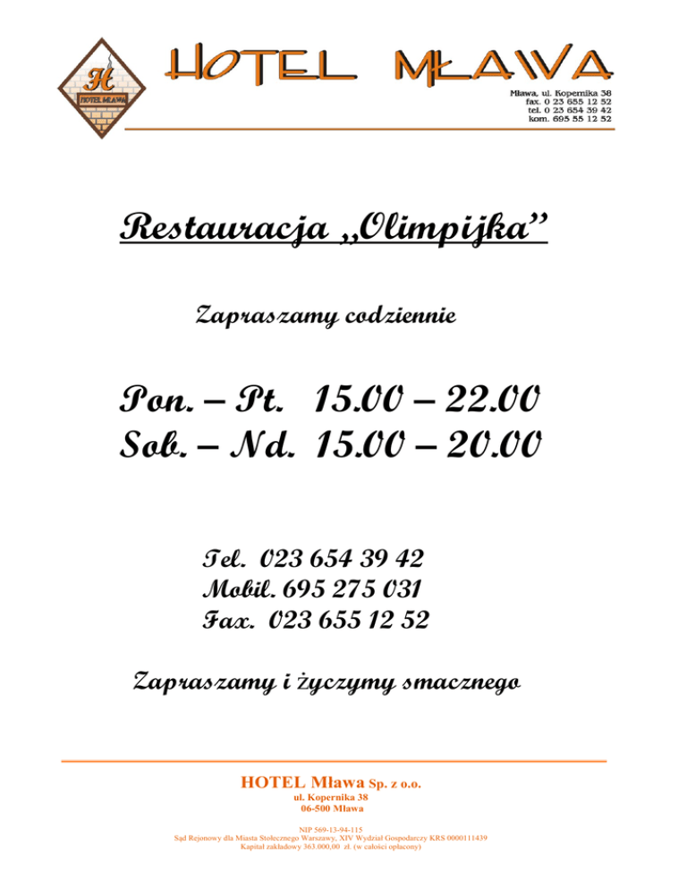 Restauracja „Olimpijka” Zapraszamy codziennie Pon. – Pt. 15.00 – 22.00 Sob. – Nd. 15.00 – 20.00 Tel. 023 654 39 42 Mobil. 695 275 031 Fax. 023 655 12 52 Zapraszamy i życzymy smacznego HOTEL Mława Sp. z o.o. ul. Kopernika 38 06-500 Mława NIP 569-13-94-115 Sąd Rejonowy dla Miasta Stołecznego Warszawy, XIV Wydział Gospodarczy KRS 0000111439 Kapitał zakładowy 363.000,00 zł. (w całości opłacony) Dania obiadowe Schabowy tradycyjny (schab panierowany + dodatki) 17,00 zł Schabowy saute ( schab bez panierki + dodatki) 17,00 zł Szwajcar ( kieszeń ze schabu panierowanego z serem + dodatki) 25,00 zł Stek wieprzowy ( schab saute, pieczarki, cebula + dodatki ) 26,00 zł Stek z kurczaka ( panierowana pierś z kurczaka + dodatki ) 18,00 zł Kurczak grillowany ( pierś z kurczaka + dodatki) 18,00 zł Kurczak w sosie słodko – kwaśnym ( smażone kawałki piersi z kurczaka + sos + dodatki) 15,00 zł Gyros 16,00 zł ( smażone kawałki piersi z kurczaka w przyprawie gyros + dodatki ) HOTEL Mława Sp. z o.o. ul. Kopernika 38 06-500 Mława NIP 569-13-94-115 Sąd Rejonowy dla Miasta Stołecznego Warszawy, XIV Wydział Gospodarczy KRS 0000111439 Kapitał zakładowy 363.000,00 zł. (w całości opłacony) Nugetsy ( panierowane polędwiczki drobiowe + dodatki) 16,00 zł Filet smażony ( panierowany filet z ryby miruny + dodatki ) 17,00 zł Placek po węgierski ( placek ziemniaczany, gulasz + dodatki) 16,00 zł Gulasz wieprzowy ( kawałki mięsa w sosie + dodatki) 15,00 zł Gołąbki w sosie pomidorowym ( + dodatki ) 15,00 zł Zupa dnia 4,00 zł Danie dnia ( zupa + II danie ) Dodatki : ziemniaki opiekane ziemniaki z wody frytki puree kluski śląskie 15,00 zł + zestaw surówek HOTEL Mława Sp. z o.o. ul. Kopernika 38 06-500 Mława NIP 569-13-94-115 Sąd Rejonowy dla Miasta Stołecznego Warszawy, XIV Wydział Gospodarczy KRS 0000111439 Kapitał zakładowy 363.000,00 zł. (w całości opłacony) Sałatki - grecka 12,00 zł ( sałata lodowa, ogórek, pomidor, cebula, oliwki, ser feta, sos ) - wiosenna ( kapusta pekińska, ogórek, pomidor, sos ) 10,00 zł - gyros 15,00 zł ( kawałki kurczaka, kapusta pekińska, kukurydza, ogórek, papryka, majonez, ketchup) - mix sałatkowy ( + pomidor, cebula, ogórek, sos ) 10,00 zł - mix sałatkowy z łososiem ( + pomidor, cebula, ogórek, sos ) 15,00 zł - mix sałatkowy z grilowanym kurczakiem ( + pomidor, cebula, ogórek, sos ) 15,00 zł HOTEL Mława Sp. z o.o. ul. Kopernika 38 06-500 Mława NIP 569-13-94-115 Sąd Rejonowy dla Miasta Stołecznego Warszawy, XIV Wydział Gospodarczy KRS 0000111439 Kapitał zakładowy 363.000,00 zł. (w całości opłacony) Naleśniki - z serem 10,00 zł - z dżemem 10,00 zł - z kremem czekoladowym 10,00 zł Krokiety ( 2 szt. ) - z mięsem 8,00 zł - ze szpinakiem 8,00 zł - z pieczarkami i serem 8,00 zł - ze szpinakiem i parówką HOTEL Mława Sp. z o.o. ul. Kopernika 38 06-500 Mława NIP 569-13-94-115 Sąd Rejonowy dla Miasta Stołecznego Warszawy, XIV Wydział Gospodarczy KRS 0000111439 Kapitał zakładowy 363.000,00 zł. (w całości opłacony) 10,00 zł Pierogi - ze szpinakiem z kapustą i grzybami z kaszą gryczaną i boczkiem wędzonym z serem ruskie 12,00 zł 12,00 zł 12,00 zł 12,00 zł 10,00 zł Naleśniki - z serem - z dżemem - z kremem czekoladowym 10,00 zł 10,00 zł 10,00 zł Krokiety ( 2 szt. ) - z mięse ze szpinakie z pieczarkami i serem ze szpinakiem i parówką HOTEL Mława Sp. z o.o. ul. Kopernika 38 06-500 Mława NIP 569-13-94-115 Sąd Rejonowy dla Miasta Stołecznego Warszawy, XIV Wydział Gospodarczy KRS 0000111439 Kapitał zakładowy 363.000,00 zł. (w całości opłacony) 8,00 zł 8,00 zł 8,00 zł 10,00 zł Dania na wcześniejsze zamówienie Golonka opiekana + dodatki 28,00 zł Karczek wieprzowy w sosie + dodatki 25,00 zł Zrazy wołowe w sosie + dodatki 30,00 zł Żeberka zapiekane w miodzie + dodatki 25,00 zł Roladki wieprzowe w sosie + dodatki 22,00 zł Roladki drobiowe ze szpinakiem + dodatki 20,00 zł Roladki drobiowe z suszonymi pomidorami + dodatki 20,00 zł Kartacze z mięsem + dodatki 15,00 zł Naleśniki ruskie + dodatki 13,00 zł Naleśniki meksykańskie + dodatki 15,00 zł Dodatki : ziemniaki opiekane lub z wody frytki, puree, kluski śląskie + zestaw surówek HOTEL Mława Sp. z o.o. ul. Kopernika 38 06-500 Mława NIP 569-13-94-115 Sąd Rejonowy dla Miasta Stołecznego Warszawy, XIV Wydział Gospodarczy KRS 0000111439 Kapitał zakładowy 363.000,00 zł. (w całości opłacony)