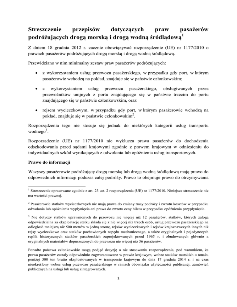 Streszczenie przepisów dotyczących praw pasażerów podróżujących drogą morską i drogą wodną śródlądową1 Z dniem 18 grudnia 2012 r. zacznie obowiązywać rozporządzenie (UE) nr 1177/2010 o prawach pasażerów podróżujących drogą morską i drogą wodną śródlądową. Przewidziano w nim minimalny zestaw praw pasażerów podróżujących: z wykorzystaniem usług przewozu pasażerskiego, w przypadku gdy port, w którym pasażerowie wchodzą na pokład, znajduje się w państwie członkowskim; z wykorzystaniem usług przewozu pasażerskiego, obsługiwanych przez przewoźników unijnych z portu znajdującego się w państwie trzecim do portu znajdującego się w państwie członkowskim, oraz rejsem wycieczkowym, w przypadku gdy port, w którym pasażerowie wchodzą na pokład, znajduje się w państwie członkowskim2. Rozporządzenia tego nie stosuje się jednak do niektórych kategorii usług transportu wodnego3. Rozporządzenie (UE) nr 1177/2010 nie wyklucza prawa pasażerów do dochodzenia odszkodowania przed sądami krajowymi zgodnie z prawem krajowym w odniesieniu do indywidualnych szkód wynikających z odwołania lub opóźnienia usług transportowych. Prawo do informacji Wszyscy pasażerowie podróżujący drogą morską lub drogą wodną śródlądową mają prawo do odpowiednich informacji podczas całej podróży. Prawo to obejmuje prawo do otrzymywania 1 Streszczenie opracowane zgodnie z art. 23 ust. 2 rozporządzenia (UE) nr 1177/2010. Niniejsze streszczenie nie ma wartości prawnej. 2 Pasażerowie statków wycieczkowych nie mają prawa do zmiany trasy podróży i zwrotu kosztów w przypadku odwołania lub opóźnienia wypłynięcia ani prawa do zwrotu ceny biletu w przypadku opóźnienia przypłynięcia. 3 Nie dotyczy statków uprawnionych do przewozu nie więcej niż 12 pasażerów, statków, których załoga odpowiedzialna za eksploatację statku składa się z nie więcej niż trzech osób, usług przewozu pasażerskiego na odległość mniejszą niż 500 metrów w jedną stronę, rejsów wycieczkowych i rejsów krajoznawczych innych niż rejsy wycieczkowe oraz statków pozbawionych napędu mechanicznego, a także oryginalnych i pojedynczych replik historycznych statków pasażerskich zaprojektowanych przed 1965 r. i zbudowanych głównie z oryginalnych materiałów dopuszczonych do przewozu nie więcej niż 36 pasażerów. Ponadto państwa członkowskie mogą podjąć decyzję o nie stosowaniu rozporządzenia, pod warunkiem, że prawa pasażerów zostały odpowiednio zagwarantowane w prawie krajowym, wobec statków morskich o tonażu poniżej 300 ton brutto eksploatowanych w transporcie krajowym do dnia 17 grudnia 2014 r. i na czas nieokreślony wobec usług przewozu pasażerskiego w ramach obowiązku użyteczności publicznej, zamówień publicznych na usługi lub usług zintegrowanych. 1 informacji na temat praw pasażerów i danych kontaktowych krajowych organów odpowiedzialnych za egzekwowanie przepisów, oraz na temat warunków dostępu do transportu dla osób niepełnosprawnych i osób o ograniczonej sprawności ruchowej. W razie odwołania lub opóźnienia wypłynięcia, pasażerowie mają prawo do informacji o opóźnieniu lub odwołaniu rejsu przez przewoźnika lub operatora terminalu nie później niż 30 minut po planowym czasie wypłynięcia i o spodziewanym czasie wypłynięcia i dopłynięcia z chwilą, gdy informacja taka stają się dostępna. Prawo do niedyskryminacyjnych warunków umownych Każda osoba ma prawo do tego, aby nie być dyskryminowaną, bezpośrednio lub pośrednio, ze względu na swoją przynależność państwową lub miejsce prowadzenia działalności przez przewoźnika lub sprzedawcę biletów w Unii przy zakupie biletów na usługi wodnego transportu pasażerskiego i rejsy wycieczkowe. Prawo do opieki i pomocy W przypadku opóźnienia przekraczającego 90 minut lub odwołania usługi przewozu pasażerskiego lub rejsu wycieczkowego, i o ile to możliwe, pasażerom oferuje się bezpłatne przekąski, posiłki lub napoje, w rozsądnej relacji do długości czasu oczekiwania. W przypadkach, gdy opóźnienie lub odwołanie wypłynięcia związane jest z koniecznością przedłużenia pobytu przez pasażera o jedną lub więcej dodatkowych nocy, przewoźnik zapewnia mu odpowiednie nieodpłatne zakwaterowanie na pokładzie albo na lądzie oraz przewóz w obu kierunkach między terminalem portowym a miejscem zakwaterowania. Jeżeli przewoźnik udowodni, że odwołanie lub opóźnienie zostało spowodowane warunkami pogodowymi zagrażającymi bezpiecznej eksploatacji statku, jest on zwolniony z obowiązku zapewnienia zakwaterowania. Pasażer nie ma prawa do pomocy przewoźnika, jeśli został poinformowany o odwołaniu lub opóźnieniu przed zakupem biletu, lub jeżeli odwołanie lub opóźnienie wynikły z winy pasażera. Prawo do zmiany trasy podróży i zwrotu ceny biletu w przypadku odwołania lub opóźnienia wypłynięcia W przypadku opóźnienia przekraczającego 90 minut w stosunku do planowanego czasu wypłynięcia lub odwołania usługi przewozu pasażerskiego, podróżni mają prawo do wyboru między: zmianą trasy podróży do miejsca docelowego bez dodatkowych kosztów, w najwcześniejszym możliwym terminie i w porównywalnych warunkach, a 2 zwrotem ceny biletu w połączeniu, w odpowiednich przypadkach, z bezpłatną powrotną usługą przewozu do punktu rozpoczęcia podróży, określonego w umowie przewozu, w najwcześniejszym możliwym terminie. Prawo do zażądania częściowego zwrotu ceny biletu w przypadku opóźnienia przypłynięcia do miejsca przeznaczenia Pasażerowie mogą domagać się zwrotu 25% ceny biletu od przewoźnika, jeżeli opóźnienie przypłynięcia do miejsca przeznaczenia przekroczy: godzinę w przypadku rejsu rozkładowego trwającego do czterech godzin; dwie godziny w przypadku rejsu rozkładowego trwającego dłużej niż cztery godziny, ale nieprzekraczającego ośmiu godzin; trzy go