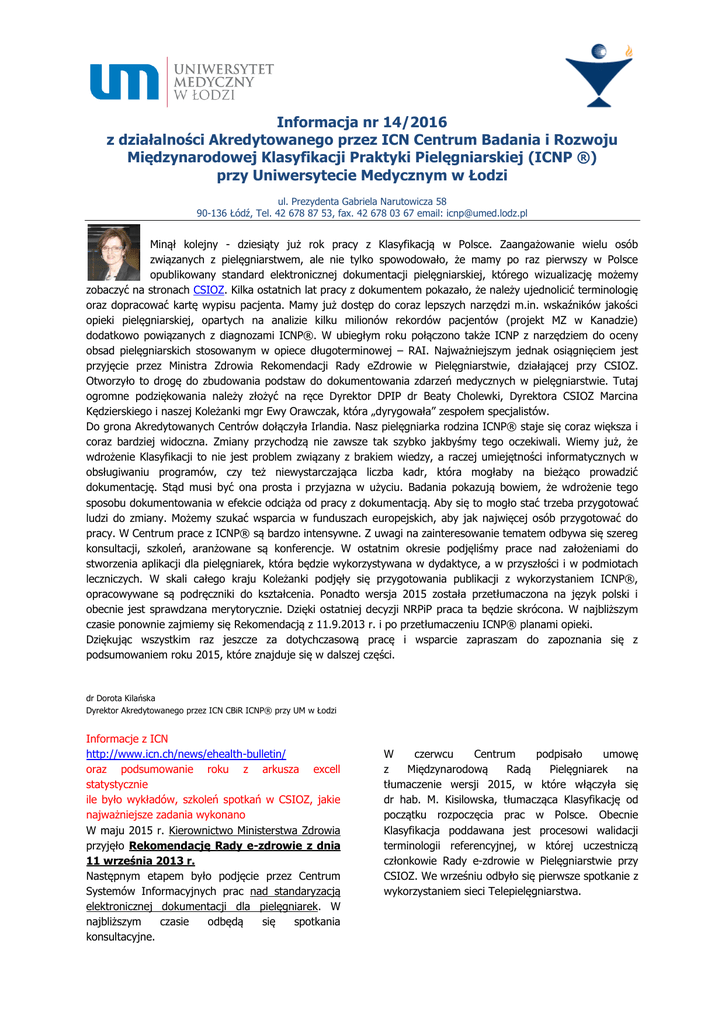 Informacja nr 14/2016 z działalności Akredytowanego przez ICN Centrum Badania i Rozwoju Międzynarodowej Klasyfikacji Praktyki Pielęgniarskiej (ICNP ®) przy Uniwersytecie Medycznym w Łodzi ul. Prezydenta Gabriela Narutowicza 58 90-136 Łódź, Tel. 42 678 87 53, fax. 42 678 03 67 email: [email protected] Minął kolejny - dziesiąty już rok pracy z Klasyfikacją w Polsce. Zaangażowanie wielu osób związanych z pielęgniarstwem, ale nie tylko spowodowało, że mamy po raz pierwszy w Polsce opublikowany standard elektronicznej dokumentacji pielęgniarskiej, którego wizualizację możemy zobaczyć na stronach CSIOZ. Kilka ostatnich lat pracy z dokumentem pokazało, że należy ujednolicić terminologię oraz dopracować kartę wypisu pacjenta. Mamy już dostęp do coraz lepszych narzędzi m.in. wskaźników jakości opieki pielęgniarskiej, opartych na analizie kilku milionów rekordów pacjentów (projekt MZ w Kanadzie) dodatkowo powiązanych z diagnozami ICNP®. W ubiegłym roku połączono także ICNP z narzędziem do oceny obsad pielęgniarskich stosowanym w opiece długoterminowej – RAI. Najważniejszym jednak osiągnięciem jest przyjęcie przez Ministra Zdrowia Rekomendacji Rady eZdrowie w Pielęgniarstwie, działającej przy CSIOZ. Otworzyło to drogę do zbudowania podstaw do dokumentowania zdarzeń medycznych w pielęgniarstwie. Tutaj ogromne podziękowania należy złożyć na ręce Dyrektor DPIP dr Beaty Cholewki, Dyrektora CSIOZ Marcina Kędzierskiego i naszej Koleżanki mgr Ewy Orawczak, która „dyrygowała” zespołem specjalistów. Do grona Akredytowanych Centrów dołączyła Irlandia. Nasz pielęgniarka rodzina ICNP® staje się coraz większa i coraz bardziej widoczna. Zmiany przychodzą nie zawsze tak szybko jakbyśmy tego oczekiwali. Wiemy już, że wdrożenie Klasyfikacji to nie jest problem związany z brakiem wiedzy, a raczej umiejętności informatycznych w obsługiwaniu programów, czy też niewystarczająca liczba kadr, która mogłaby na bieżąco prowadzić dokumentację. Stąd musi być ona prosta i przyjazna w użyciu. Badania pokazują bowiem, że wdrożenie tego sposobu dokumentowania w efekcie odciąża od pracy z dokumentacją. Aby się to mogło stać trzeba przygotować ludzi do zmiany. Możemy szukać wsparcia w funduszach europejskich, aby jak najwięcej osób przygotować do pracy. W Centrum prace z ICNP® są bardzo intensywne. Z uwagi na zainteresowanie tematem odbywa się szereg konsultacji, szkoleń, aranżowane są konferencje. W ostatnim okresie podjęliśmy prace nad założeniami do stworzenia aplikacji dla pielęgniarek, która będzie wykorzystywana w dydaktyce, a w przyszłości i w podmiotach leczniczych. W skali całego kraju Koleżanki podjęły się przygotowania publikacji z wykorzystaniem ICNP®, opracowywane są podręczniki do kształcenia. Ponadto wersja 2015 została przetłumaczona na język polski i obecnie jest sprawdzana merytorycznie. Dzięki ostatniej decyzji NRPiP praca ta będzie skrócona. W najbliższym czasie ponownie zajmiemy się Rekomendacją z 11.9.2013 r. i po przetłumaczeniu ICNP® planami opieki. Dziękując wszystkim raz jeszcze za dotychczasową pracę i wsparcie zapraszam do zapoznania się z podsumowaniem roku 2015, które znajduje się w dalszej części. dr Dorota Kilańska Dyrektor Akredytowanego przez ICN CBiR ICNP® przy UM w Łodzi Informacje z ICN http://www.icn.ch/news/ehealth-bulletin/ oraz podsumowanie roku z arkusza excell statystycznie ile było wykładów, szkoleń spotkań w CSIOZ, jakie najważniejsze zadania wykonano W maju 2015 r. Kierownictwo Ministerstwa Zdrowia przyjęło Rekomendację Rady e-zdrowie z dnia 11 września 2013 r. Następnym etapem było podjęcie przez Centrum Systemów Informacyjnych prac nad standaryzacją elektronicznej dokumentacji dla pielęgniarek. W najbliższym czasie odbędą się spotkania konsultacyjne. W czerwcu Centrum podpisało umowę z Międzynarodową Radą Pielęgniarek na tłumaczenie wersji 2015, w które włączyła się dr hab. M. Kisilowska, tłumacząca Klasyfikację od początku rozpoczęcia prac w Polsce. Obecnie Klasyfikacja poddawana jest procesowi walidacji terminologii referencyjnej, w której uczestniczą członkowie Rady e-zdrowie w Pielęgniarstwie przy CSIOZ. We wrześniu odbyło się pierwsze spotkanie z wykorzystaniem sieci Telepielęgniarstwa. Informacje z działalności ACBiR ICNP ® przewodników do praktyki w poszczególnych krajach UE. W ostatnim okresie odbyło się XXI i XXII posiedzenie Rady e-zdrowie przy CSIOZ. Podczas spotkań ustalono harmonogram prac nad Klasyfikacją. Podjęto także decyzję, że do systemów informatycznych wdrażana będzie wersja 2015. W dniach 3-6.8.2015 r. 16 pielęgniarek z uczelni medycznych, szpitali, podmiotów opieki długoterminowej i hospicyjnej oraz przedstawiciele Departamentu Pielęgniarek i Położnych w MZ uczestniczyło w wizycie studyjnej w Porto, w Portugalii. Byli to przedstawiciele ośrodków, które współpracują z Akredytowanym Przez ICN Centrum Badania i Rozwoju ICNP® przy UM w Łodzi. Celem wyjazdu było zapoznanie się ze sposobem nauczania Klasyfikacji ICNP® wykorzystaniu jej w praktyce i w dokumentacji pielęgniarskiej, w podmiotach leczniczych i uczelniach. Uczestnicy odwiedzili także placówki realizujące świadczenia zdrowotne w podstawowej opiece zdrowotnej, opiece jednego dnia, intensywnej terapii, czy chirurgii. Więcej >>> Projekt ENS4CARE Europejskiej Federacji Stowarzyszeń Pielęgniarek zbliża się do końca. W projekcie wypracowano rekomendację dla wdrożenia do systemów informatycznych słowników rekomendowanych przez WHO - niezbędnych dla zapewnienia praw pacjentom w transgranicznej opiece zdrowotnej. Efektem prac w projekcie są przewodniki przygotowane na podstawie dobrych praktyk, wykorzystujące rozwiązania informatyczne do: wdrażania Zaawansowanej Praktyki Pielęgniarskiej (APN), wypisywania recept przez pielęgniarki, zintegrowanej o