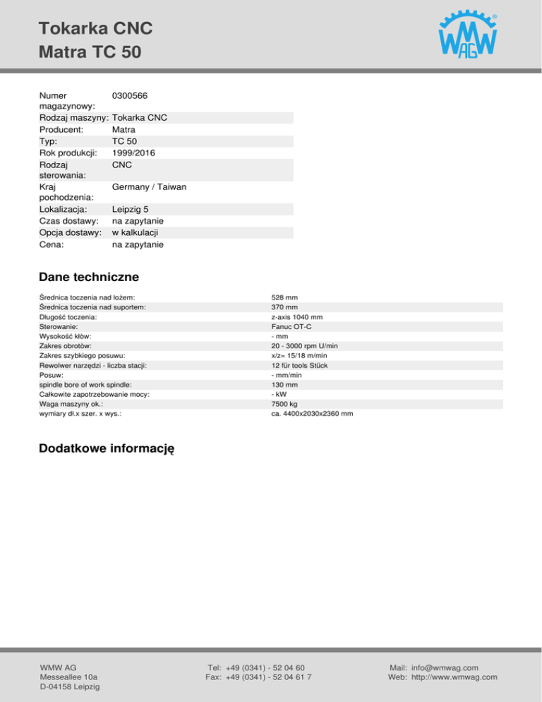 Tokarka CNC Matra TC 50 Numer magazynowy: Rodzaj maszyny: Producent: Typ: Rok produkcji: Rodzaj sterowania: Kraj pochodzenia: Lokalizacja: Czas dostawy: Opcja dostawy: Cena: 0300566 Tokarka CNC Matra TC 50 1999/2016 CNC Germany / Taiwan Leipzig 5 na zapytanie w kalkulacji na zapytanie Dane techniczne Średnica toczenia nad łożem: Średnica toczenia nad suportem: Długość toczenia: Sterowanie: Wysokość kłòw: Zakres obrotòw: Zakres szybkiego posuwu: Rewolwer narzędzi - liczba stacji: Posuw: spindle bore of work spindle: Całkowite zapotrzebowanie mocy: Waga maszyny ok.: wymiary dł.x szer. x wys.: 528 mm 370 mm z-axis 1040 mm Fanuc OT-C - mm 20 - 3000 rpm U/min x/z= 15/18 m/min 12 für tools Stück - mm/min 130 mm - kW 7500 kg ca. 4400x2030x2360 mm Dodatkowe informację WMW AG Messeallee 10a D-04158 Leipzig Powered by TCPDF (www.tcpdf.org) Tel: +49 (0341) - 52 04 60 Fax: +49 (0341) - 52 04 61 7 Mail: [email protected] Web: http://www.wmwag.com