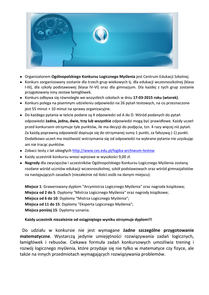 Organizatorem Ogólnopolskiego Konkursu Logicznego Myślenia jest Centrum Edukacji Szkolnej. Konkurs zorganizowany zostanie dla trzech grup wiekowych tj. dla edukacji wczesnoszkolnej (klasa I-III), dla szkoły podstawowej (klasa IV-VI) oraz dla gimnazjum. Dla każdej z tych grup zostanie przygotowany inny zestaw łamigłówek. Konkurs odbywa się równolegle we wszystkich szkołach w dniu 17-03-2015 roku (wtorek). Konkurs polega na pisemnym udzieleniu odpowiedzi na 26 pytań testowych, na co przeznaczone jest 55 minut + 10 minut na sprawy organizacyjne. Do każdego pytania w teście podane są 4 odpowiedzi od A do D. Wśród podanych do pytań odpowiedzi żadna, jedna, dwie, trzy lub wszystkie odpowiedzi mogą być prawidłowe. Każdy uczeń przed konkursem otrzymuje tyle punktów, ile ma decyzji do podjęcia, tzn. 4 razy więcej niż pytań. Za każdą poprawną odpowiedź dopisuje się do otrzymanej sumy 1 punkt, za fałszywą (-1) punkt. Dodatkowo uczeń ma możliwość wstrzymania się od odpowiedzi na wybrane pytania nie uzyskując ani nie tracąc punktów. Zobacz testy z lat ubiegłych http://www.ces.edu.pl/logika-archiwum-testow Każdy uczestnik konkursu wnosi wpisowe w wysokości 9,00 zł. Nagrody dla zwycięzców i uczestników Ogólnopolskiego Konkursu Logicznego Myślenia zostaną rozdane wśród uczniów edukacji wczesnoszkolnej, szkół podstawowych oraz wśród gimnazjalistów na następujących zasadach (niezależnie od ilości osób na danym miejscu): Miejsce 1: Grawerowany dyplom "Arcymistrza Logicznego Myślenia" oraz nagroda książkowa; Miejsca od 2 do 5: Dyplomy "Mistrza Logicznego Myślenia" oraz nagrody książkowe; Miejsca od 6 do 10: Dyplomy "Mistrza Logicznego Myślenia"; Miejsca od 11 do 15: Dyplomy "Eksperta Logicznego Myślenia"; Miejsca poniżej 15: Dyplomy uznania. Każdy uczestnik niezależnie od osiągniętego wyniku otrzymuje dyplom!!! Do udziału w konkursie nie jest wymagane żadne szczególne przygotowanie matematyczne. Wystarczą jedynie umiejętności rozwiązywania zadań logicznych, łamigłówek i rebusów. Ciekawa formuła zadań konkursowych umożliwia trening i rozwój logicznego myślenia, które przydaje się nie tylko w matematyce czy fizyce, ale także na innych przedmiotach wymagających rozwiązywania problemów.