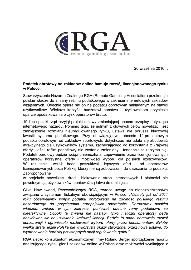 20 września 2016 r. Podatek obrotowy od zakładów online hamuje rozwój licencjonowanego rynku w Polsce. Stowarzyszenie Hazardu Zdalnego RGA (Remote Gambling Association) przekonuje polskie władze do zmiany reżimu podatkowego w zakresie internetowych zakładów wzajemnych. Obecnie opiera się on na podatku obrotowym nakładanym na stawki użytkowników. Większe korzyści budżetowi państwa i użytkownikom przyniesie oparcie opodatkowania o zysk operatorów brutto. 19 lipca polski rząd przyjął projekt ustawy zmieniającej obecne przepisy dotyczące internetowego hazardu. Pomimo tego, że jednym z głównych celów nowelizacji jest zmniejszenie rozmiaru nieuregulowanego rynku, ustawa nie porusza kluczowej kwestii systemu podatkowego. Przy obowiązującym obecnie 12-procentowym podatku obrotowym od zakładów sportowych, dotychczas nie udało się zbudować atrakcyjnego dla użytkowników systemu, zachęcającego do korzystania z krajowej oferty. Jeżeli reżim podatkowy nie zostanie zmieniony, tendencja ta utrzyma się. Podatek obrotowy będzie wciąż uniemożliwiał zapewnienie przez licencjonowanych operatorów korzystnej oferty i możliwości wyboru dla polskich użytkowników. W rezultacie, wciąż będą poszukiwali lepszych ofert od operatorów licencjonowanych poza Polską, którzy nie są zobowiązani do uiszczania tu podatku. Zaproponowane w projekcie nowelizacji środki blokowania stron internetowych i płatności nie powstrzymają użytkowników, ponieważ są łatwe do ominięcia. Clive Hawkswood, Przewodniczący RGA, zwraca uwagę na niebezpieczeństwa związane z systemem fiskalnym obowiązującym w Polsce: „Niestety już od 2011 roku obserwujemy wpływ podatku obrotowego na zdolność polskiego reżimu hazardowego do przyciągania europejskich operatorów. Doradzamy polskim władzom zmianę w tym zakresie, ponieważ obecne ramy podatkowe są nieefektywne. Dopóki ta zmiana nie nastąpi, tylko nieliczni operatorzy będą decydować się na uzyskanie krajowej licencji. Będzie to nadal hamowało rozwój konkurencji i ograniczało możliwości wyboru oferty przez konsumentów. Byłoby wielką stratą, jeżeli Polska nie wykorzysta okazji stworzonej przez nową ustawę, do wypracowania bardziej przystępnych opcji regulowania rynku.” RGA zleciło konsultantom ekonomicznym firmy Roland Berger sporządzenie raportu analizującego rynek gier i zakładów online w Polsce oraz możliwości wynikające z dwóch reżimów podatkowych: podatku obrotowego oraz podatku od przychodów operatorów brutto. Raport wyraźnie wskazuje, że scenariusz oparty na opodatkowaniu przychodów operatorów przyczyniłby się do skuteczniejszego osiągnięcia celów wyznaczonych przez rząd w porównaniu do obecnego systemu, m.in. poprzez zapewnienie wyższego poziomu kierowania użytkowników do regulowanej lokalnie oferty, wyższych wpływów do budżetu państwa, większej ochrony użytkowników. Clive Hawkswood dodaje, że "Ma nadzieję, iż polskie władze rozważą wnioski z raportu Roland Berger w związku z rozpoczętym w Sejmie procesem legislacyjnym. Niepowodzenie w kwestii zmiany reżimu podatkowego pozostawi ustawę nieefektywną, ponieważ operatorzy nie podejmą się inwestowania na polskim rynku, gdzie ich oferta nie będzie mogła być konkurencyjna i korzystna dla konsumentów. Odpowiedni model podatku od przychodów operatora umożliwiłby natomiast przyciągnięcie dużych, renomowanych firm do Polski i zapewniłby atrakcyjne i konkurencyjne produkty użytkownikom, a tym samym przychody dla budżetu państwa. Ogromnym rozczarowaniem dla wszystkich stron byłoby natomiast utrzymanie niedziałającego systemu podatkowego zamiast wprowadzenia nowoczesnego i skutecznego reżimu”. *** 1. Raport Roland Berger zatytułowany „Regulacje w zakresie rynku zakładów wzajemnych online w Polsce” (uwzględniający alternatywne scenariusze dla określenia najbardziej korzystnego modelu regulacyjnego dla zakładów wzajemnych online w Polsce – wrzesień 2016 2. RGA to największa organizacja branżowa, reprezentująca wiodących światowych operatorów hazardu zdalnego i dostawców oprogramowania, notowanych na światowych giełdach (pełną listę członków można uzyskać na www.rga.eu.com). Stowarzyszenie występuje w imieniu branży przed regulatorami, ustawodawcami i kluczowymi decydentami na całym świecie. Dodatkowych informacji udzielają: Pierre Tournier, Dyrektor RGA ds. Government Relations – [email protected] Iga Wilczyńska, Grayling (agencja PR) – [email protected]