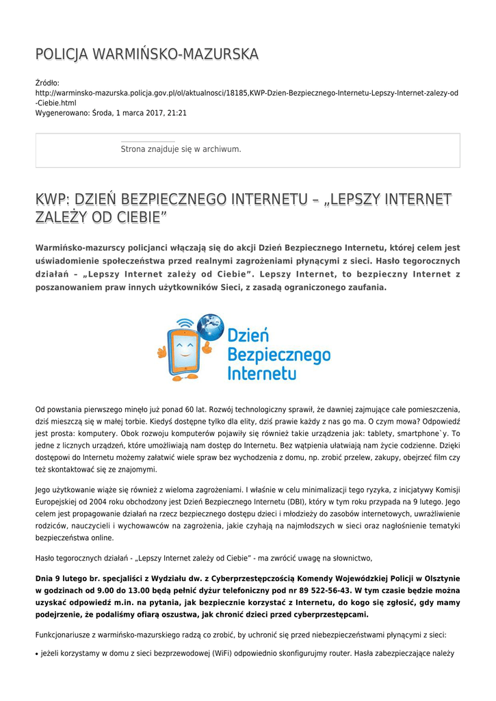 POLICJA WARMIŃSKO-MAZURSKA Źródło: http://warminsko-mazurska.policja.gov.pl/ol/aktualnosci/18185,KWP-Dzien-Bezpiecznego-Internetu-Lepszy-Internet-zalezy-od -Ciebie.html Wygenerowano: Środa, 1 marca 2017, 21:21 Strona znajduje się w archiwum. KWP: DZIEŃ BEZPIECZNEGO INTERNETU – „LEPSZY INTERNET ZALEŻY OD CIEBIE” Warmińsko-mazurscy policjanci włączają się do akcji Dzień Bezpiecznego Internetu, której celem jest uświadomienie społeczeństwa przed realnymi zagrożeniami płynącymi z sieci. Hasło tegorocznych działań – „Lepszy Internet zależy od Ciebie”. Lepszy Internet, to bezpieczny Internet z poszanowaniem praw innych użytkowników Sieci, z zasadą ograniczonego zaufania. Od powstania pierwszego minęło już ponad 60 lat. Rozwój technologiczny sprawił, że dawniej zajmujące całe pomieszczenia, dziś mieszczą się w małej torbie. Kiedyś dostępne tylko dla elity, dziś prawie każdy z nas go ma. O czym mowa? Odpowiedź jest prosta: komputery. Obok rozwoju komputerów pojawiły się również takie urządzenia jak: tablety, smartphone`y. To jedne z licznych urządzeń, które umożliwiają nam dostęp do Internetu. Bez wątpienia ułatwiają nam życie codzienne. Dzięki dostępowi do Internetu możemy załatwić wiele spraw bez wychodzenia z domu, np. zrobić przelew, zakupy, obejrzeć film czy też skontaktować się ze znajomymi. Jego użytkowanie wiąże się również z wieloma zagrożeniami. I właśnie w celu minimalizacji tego ryzyka, z inicjatywy Komisji Europejskiej od 2004 roku obchodzony jest Dzień Bezpiecznego Internetu (DBI), który w tym roku przypada na 9 lutego. Jego celem jest propagowanie działań na rzecz bezpiecznego dostępu dzieci i młodzieży do zasobów internetowych, uwrażliwienie rodziców, nauczycieli i wychowawców na zagrożenia, jakie czyhają na najmłodszych w sieci oraz nagłośnienie tematyki bezpieczeństwa online. Hasło tegorocznych działań - „Lepszy Internet zależy od Ciebie” - ma zwrócić uwagę na słownictwo, Dnia 9 lutego br. specjaliści z Wydziału dw. z Cyberprzestępczością Komendy Wojewódzkiej Policji w Olsztynie w godzinach od 9.00 do 13.00 będą pełnić dyżur telefoniczny pod nr 89 522-56-43. W tym czasie będzie można uzyskać odpowiedź m.in. na pytania, jak bezpiecznie korzystać z Internetu, do kogo się zgłosić, gdy mamy podejrzenie, że podaliśmy ofiarą oszustwa, jak chronić dzieci przed cyberprzestępcami. Funkcjonariusze z warmińsko-mazurskiego radzą co zrobić, by uchronić się przed niebezpieczeństwami płynącymi z sieci: ● jeżeli korzystamy w domu z sieci bezprzewodowej (WiFi) odpowiednio skonfigurujmy router. Hasła zabezpieczające należy tworzyć, używając cyfr, małych i dużych liter oraz znaków specjalnych. Przy wyborze kupna routera sugerujmy się nie tyle ceną, co możliwością szyfrowania WPA czy WPA2, ● używajmy programów antywirusowych, które uchronią nas przed niepożądanymi wirusami i innymi niebezpieczeństwami. Nie zapomnijmy o systematycznej aktualizacji, ● uważajmy na e-maile niewiadomego pochodzenia, które zawierają podejrzane załączniki, nigdy ich nie otwierajmy, ● nie odpisujmy na spamy, ponieważ nasz e-mail zostanie uznany za aktywny i będą do nas przysyłane kolejne wiadomości z podejrzana treścią. Szczególnie narażone na treści zawarte w Internecie są dzieci i młodzież, które częściej korzystają z komputera, częściej podejmują ryzyko, przez zwykłą ciekawość, wchodzą na różnego rodzaju strony o treści mogącej wpłynąć na zachowanie. Często treści te są nieadekwatne do wieku przeglądających. Ważną rolę w procesie uświadamiania najmłodszych odgrywają rodzice. To oni jako pierwsi powinni poinformować swoje pociechy o możliwych zagrożeniach. Rady dla rodziców: ● porozmawiaj ze swoim dzieckiem, omów kwestie bezpiecznego korzystania z komputera i Internetu, ● kontroluj, co twoje dziecko robi w sieci, na jakie strony zagląda, jakich szuka informacji. Pamiętaj o poszanowaniu prywatności, ● w przypadku napotkania w Internecie nielegalnych treści nie zastanawiaj się i zgłoś ten fakt na Policję, ● porozmawiaj z informatykiem o możliwości blokady niektórych stron. Często rodziców nurtuje pytanie: „co powiedzieć dzieciom, na co powinny uważać, do kogo mają zwrócić się o pomoc, w przypadku problemów w sieci”. Odpowiedz jest prosta. Oto kilka rad przygotowanych dla dzieci: ● pamiętaj, że przyjaciele poznani w Internecie mogą nie być tymi, za których się podają – w rzeczywistości możesz rozmawiać z osobą, która ma wobec ciebie złe zamiary, ● nie podawaj w Internecie swojego nazwiska, wieku, numeru telefonu – najlepiej jest posiadać swój nick, internetową ksywkę, ● nie umawiaj się z osobami poznanymi przez Internet, ● uważaj na e-maile otrzymane od nieznajomych, nigdy nie otwieraj podejrzanych załączników i nie otwieraj linków przesłanych ci przez nieznaną osobę – mogą zawierać wirusy, ● traktuj innych z szacunkiem, nie wyzywaj, nie strasz, nie obrażaj, ● rozmawiaj z rodzicami o Internecie, zaproś ich na twoje ulubione strony, pokaż im jak szukać w Internecie informacji – zostań ich nauczycielem, ● w razie zagrożenia szukaj pomocy u dorosłych – rodziców, pedagoga, policjanta. Komputery i urządzenia cyfrowe oraz Internet odgrywają coraz większą rolę w prowadzeniu nielegalnej działalności lub też w znaczny sposób pomagają w jej prowadzeniu, poprzez możliwości, które oferuje, tj: nielegalny handel w sieci, pirackie oprogramowanie, różnego rodzaju oszustwa (aukcje internetowe, ogłoszenia, oferty zarobkowania, usługi medialne) oraz przestępczość z wykorzystaniem elektronicznych instrumentów płatniczych. To wszystko czyni z komputerów i globalnej sieci Internet potężne narzędzie do popełniania przestępstw. Policjanci z Wydziału do walki z Cyberprzestępczością Komendy Wo