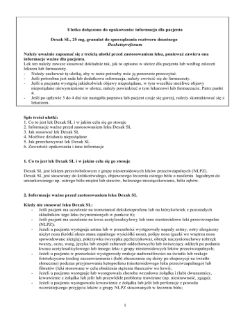 Ulotka dołączona do opakowania: informacja dla pacjenta Dexak SL, 25 mg, granulat do sporządzania roztworu doustnego Dexketoprofenum Należy uważnie zapoznać się z treścią ulotki przed zastosowaniem leku, ponieważ zawiera ona informacje ważne dla pacjenta. Lek ten należy zawsze stosować dokładnie tak, jak to opisano w ulotce dla pacjenta lub według zaleceń lekarza lub farmaceuty. - Należy zachować tę ulotkę, aby w razie potrzeby móc ją ponownie przeczytać. - Jeśli potrzebna jest rada lub dodatkowa informacja, należy zwrócić się do farmaceuty. - Jeśli u pacjenta wystąpią jakiekolwiek objawy niepożądane, w tym wszelkie możliwe objawy niepożądane niewymienione w ulotce, należy powiedzieć o tym lekarzowi lub farmaceucie. Patrz punkt 4. - Jeśli po upływie 3 do 4 dni nie nastąpiła poprawa lub pacjent czuje się gorzej, należy skontaktować się z lekarzem. Spis treści ulotki: 1. Co to jest lek Dexak SL i w jakim celu się go stosuje 2. Informacje ważne przed zastosowaniem leku Dexak SL 3. Jak stosować lek Dexak SL 4. Możliwe działania niepożądane 5. Jak przechowywać lek Dexak SL 6. Zawartość opakowania i inne informacje 1. Co to jest lek Dexak SL i w jakim celu się go stosuje Dexak SL jest lekiem przeciwbólowym z grupy niesteroidowych leków przeciwzapalnych (NLPZ). Dexak SL jest stosowany do krótkotrwałego, objawowego leczenia ostrego bólu o nasileniu łagodnym do umiarkowanego np. ostrego bólu mięśni lub stawów, bolesnego miesiączkowania, bólu zębów. 2. Informacje ważne przed zastosowaniem leku Dexak SL Kiedy nie stosować leku Dexak SL: - Jeśli pacjent ma uczulenie na trometamol deksketoprofenu lub na którykolwiek z pozostałych składników tego leku (wymienionych w punkcie 6); - Jeśli pacjent ma uczulenie na kwas acetylosalicylowy lub inne niesteroidowe leki przeciwzapalne (NLPZ); - Jeżeli u pacjenta występuje astma lub w przeszłości występowały napady astmy, ostry alergiczny nieżyt nosa (krótki okres stanu zapalnego wyściółki nosa), polipy nosa (guzki we wnętrzu nosa spowodowane alergią), pokrzywka (wysypka pęcherzykowa), obrzęk naczynioruchowy (obrzęk twarzy, oczu, warg, języka lub zespół zaburzeń oddechowych) lub świszczący oddech po podaniu kwasu acetylosalicylowego lub innego leku z grupy niesteroidowych leków przeciwzapalnych; - Jeżeli u pacjenta w przeszłości występowały reakcje nadwrażliwości na światło lub reakcje fototoksyczne (rodzaj zaczerwienienia i (lub) złuszczania się skóry po ekspozycji na światło słoneczne) podczas przyjmowania ketoprofenu (niesteroidowego leku przeciwzapalnego) lub fibratów (leki stosowane w celu obniżenia stężenia tłuszczów we krwi); - Jeżeli u pacjenta występuje lub występowała choroba wrzodowa żołądka i (lub) dwunastnicy, krwawienie z żołądka lub jelit lub przewlekłe problemy trawienne (np. niestrawność, zgaga); - Jeżeli u pacjenta występowało krwawienie z żołądka lub jelit lub perforacje z powodu wcześniejszego przyjęcia leków z grupy NLPZ stosowanych w leczeniu bólu; 1 - Jeżeli u pacjenta występują choroby jelit przebiegające z przewlekłym stanem zapalnym (choroba Leśniowskiego-Crohna lub wrzodziejące zapalenie jelita grubego); Jeżeli u pacjenta występuje ciężka niewydolność serca, umiarkowana lub ciężka niewydolność nerek lub ciężka niewydolność wątroby; Jeżeli u pacjenta występuje nadmierna skłonność do krwawień lub zaburzenia krzepnięcia; Jeżeli pacjent jest w stanie ciężkiego odwodnienia (duża utrata płynów) z powodu wymiotów, biegunki lub niewystarczającej ilości przyjętych płynów; Jeżeli pacjentka jest w trzecim trymestrze ciąży lub karmi piersią; U osób poniżej 18 lat. Ostrzeżenia i środki ostrożności: Przed rozpoczęciem stosowania leku Dexak SL należy omówić to z lekarzem lub farmaceutą. - Jeżeli u pacjenta występuje alergia lub jeśli u pacjenta występowały problemy z alergią w przeszłości; - Jeżeli u pacjenta występują zaburzenia czynności nerek, wątroby lub serca (nadciśnienie i (lub) niewydolność serca) jak również zatrzymywanie płynów lub, jeśli którykolwiek z powyższych problemów wystąpił u pacjenta w przeszłości; - U pacjentów otrzymujących leki moczopędne lub u pacjentów, u których występuje obniżone nawodnienie i zmniejszona objętość krwi spowodowane nadmierną utratą płynów (np. zbyt częste oddawanie moczu, biegunka lub wymioty); - Jeżeli pacjent ma choroby serca, przebyty udar lub podejrzenie, iż należy do grupy ryzyka związanego z tymi stanami (np. w przypadku występowania podwyższonego ciśnienia krwi, cukrzycy, podwyższonego stężenia cholesterolu lub palenia tytoniu). W takich przypadkach przed zastosowaniem leku Dexak SL należy skonsultować się z lekarzem. Przyjmowanie takich leków, jak Dexak SL może być związane z niewielkim zwiększeniem ryzyka ataku serca („zawał serca”) lub udaru mózgu. Ryzyko to zwiększa długotrwałe przyjmowanie dużych dawek leku. Nie należy stosować większych dawek i dłuższego czasu leczenia niż zalecane; - Jeżeli pacjent jest osobą w podeszłym wieku: istnieje zwiększone ryzyko wystąpienia działań niepożądanych (patrz punkt 4). W takim przypadku należy niezwłocznie skontaktować się z lekarzem; - U kobiet mających problemy z zajściem w ciążę lub poddawanych badaniom z powodu niepłodności (Dexak SL może zaburzać płodność kobiet i nie należy stosować go u kobiet planujących ciążę lub leczonych z powodu niepłodności); - Jeżeli u pacjenta występują zaburzenia tworzenia krwi lub komórek krwi; - Jeżeli u pacjenta występuje toczeń rumieniowaty układowy lub mieszana choroba tkanki łącznej (zaburzenia układu immunologicznego wpływające na tkankę łączną); - Jeżeli u pacjenta występowały przewlekłe choroby zapalne jelit (wrzodziejące zapalenie jelita grubego, choroba Leśniowskiego-Crohna); - Jeżeli 