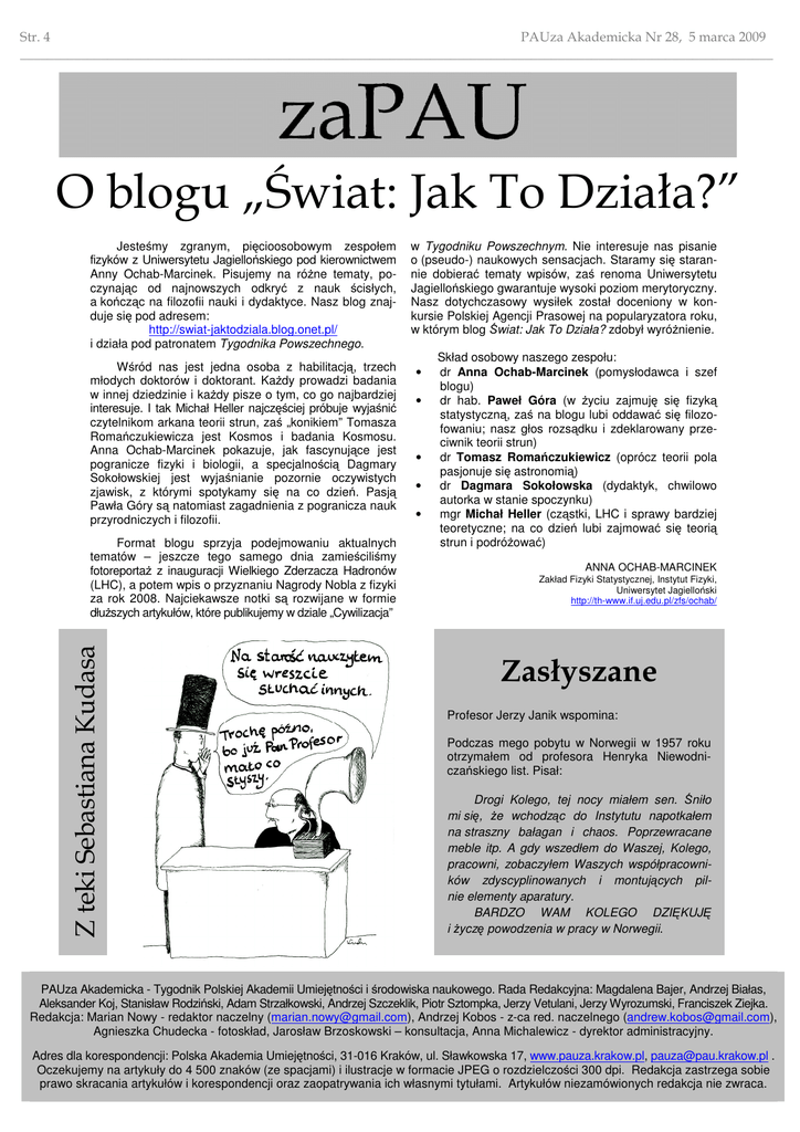 Str. 4 PAUza Akademicka Nr 28, 5 marca 2009 ________________________________________________________________________________________________________________ O blogu „Świat: Jak To Działa?” Jesteśmy zgranym, pięcioosobowym zespołem fizyków z Uniwersytetu Jagiellońskiego pod kierownictwem Anny Ochab-Marcinek. Pisujemy na różne tematy, poczynając od najnowszych odkryć z nauk ścisłych, a kończąc na filozofii nauki i dydaktyce. Nasz blog znajduje się pod adresem: http://swiat-jaktodziala.blog.onet.pl/ i działa pod patronatem Tygodnika Powszechnego. Wśród nas jest jedna osoba z habilitacją, trzech młodych doktorów i doktorant. Każdy prowadzi badania w innej dziedzinie i każdy pisze o tym, co go najbardziej interesuje. I tak Michał Heller najczęściej próbuje wyjaśnić czytelnikom arkana teorii strun, zaś „konikiem” Tomasza Romańczukiewicza jest Kosmos i badania Kosmosu. Anna Ochab-Marcinek pokazuje, jak fascynujące jest pogranicze fizyki i biologii, a specjalnością Dagmary Sokołowskiej jest wyjaśnianie pozornie oczywistych zjawisk, z którymi spotykamy się na co dzień. Pasją Pawła Góry są natomiast zagadnienia z pogranicza nauk przyrodniczych i filozofii. Z teki Sebastiana Kudasa Format blogu sprzyja podejmowaniu aktualnych tematów – jeszcze tego samego dnia zamieściliśmy fotoreportaż z inauguracji Wielkiego Zderzacza Hadronów (LHC), a potem wpis o przyznaniu Nagrody Nobla z fizyki za rok 2008. Najciekawsze notki są rozwijane w formie dłuższych artykułów, które publikujemy w dziale „Cywilizacja” w Tygodniku Powszechnym. Nie interesuje nas pisanie o (pseudo-) naukowych sensacjach. Staramy się starannie dobierać tematy wpisów, zaś renoma Uniwersytetu Jagiellońskiego gwarantuje wysoki poziom merytoryczny. Nasz dotychczasowy wysiłek został doceniony w konkursie Polskiej Agencji Prasowej na popularyzatora roku, w którym blog Świat: Jak To Działa? zdobył wyróżnienie. • • • • • Skład osobowy naszego zespołu: dr Anna Ochab-Marcinek (pomysłodawca i szef blogu) dr hab. Paweł Góra (w życiu zajmuję się fizyką statystyczną, zaś na blogu lubi oddawać się filozofowaniu; nasz głos rozsądku i zdeklarowany przeciwnik teorii strun) dr Tomasz Romańczukiewicz (oprócz teorii pola pasjonuje się astronomią) dr Dagmara Sokołowska (dydaktyk, chwilowo autorka w stanie spoczynku) mgr Michał Heller (cząstki, LHC i sprawy bardziej teoretyczne; na co dzień lubi zajmować się teorią strun i podróżować) ANNA OCHAB-MARCINEK Zakład Fizyki Statystycznej, Instytut Fizyki, Uniwersytet Jagielloński http://th-www.if.uj.edu.pl/zfs/ochab/ Zasłyszane Profesor Jerzy Janik wspomina: Podczas mego pobytu w Norwegii w 1957 roku otrzymałem od profesora Henryka Niewodniczańskiego list. Pisał: Drogi Kolego, tej nocy miałem sen. Śniło mi się, że wchodząc do Instytutu napotkałem na straszny bałagan i chaos. Poprzewracane meble itp. A gdy wszedłem do Waszej, Kolego, pracowni, zobaczyłem Waszych współpracowników zdyscyplinowanych i montujących pilnie elementy aparatury. BARDZO WAM KOLEGO DZIĘKUJĘ i życzę powodzenia w pracy w Norwegii. PAUza Akademicka - Tygodnik Polskiej Akademii Umiejętności i środowiska naukowego. Rada Redakcyjna: Magdalena Bajer, Andrzej Białas, Aleksander Koj, Stanisław Rodziński, Adam Strzałkowski, Andrzej Szczeklik, Piotr Sztompka, Jerzy Vetulani, Jerzy Wyrozumski, Franciszek Ziejka. Redakcja: Marian Nowy - redaktor naczelny ([email protected]), Andrzej Kobos - z-ca red. naczelnego ([email protected]), Agnieszka Chudecka - fotoskład, Jarosław Brzoskowski – konsultacja, Anna Michalewicz - dyrektor administracyjny. Adres dla korespondencji: Polska Akademia Umiejętności, 31-016 Kraków, ul. Sławkowska 17, www.pauza.krakow.pl, [email protected] . Oczekujemy na artykuły do 4 500 znaków (ze spacjami) i ilustracje w formacie JPEG o rozdzielczości 300 dpi. Redakcja zastrzega sobie prawo skracania artykułów i korespondencji oraz zaopatrywania ich własnymi tytułami. Artykułów niezamówionych redakcja nie zwraca.