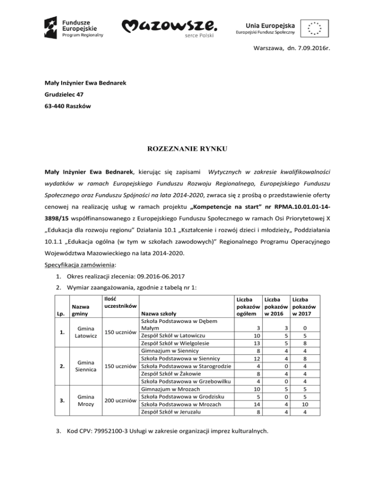Warszawa, dn. 7.09.2016r. Mały Inżynier Ewa Bednarek Grudzielec 47 63-440 Raszków ROZEZNANIE RYNKU Mały Inżynier Ewa Bednarek, kierując się zapisami Wytycznych w zakresie kwalifikowalności wydatków w ramach Europejskiego Funduszu Rozwoju Regionalnego, Europejskiego Funduszu Społecznego oraz Funduszu Spójności na lata 2014-2020, zwraca się z prośbą o przedstawienie oferty cenowej na realizację usług w ramach projektu „Kompetencje na start” nr RPMA.10.01.01-143898/15 współfinansowanego z Europejskiego Funduszu Społecznego w ramach Osi Priorytetowej X „Edukacja dla rozwoju regionu” Działania 10.1 „Kształcenie i rozwój dzieci i młodzieży„ Poddziałania 10.1.1 „Edukacja ogólna (w tym w szkołach zawodowych)” Regionalnego Programu Operacyjnego Województwa Mazowieckiego na lata 2014-2020. Specyfikacja zamówienia: 1. Okres realizacji zlecenia: 09.2016-06.2017 2. Wymiar zaangażowania, zgodnie z tabelą nr 1: Lp. Nazwa gminy 1. Gmina Latowicz 2. Gmina Siennica 3. Gmina Mrozy Ilość uczestników Nazwa szkoły Szkoła Podstawowa w Dębem Małym 150 uczniów Zespół Szkół w Latowiczu Zespół Szkół w Wielgolesie Gimnazjum w Siennicy Szkoła Podstawowa w Siennicy 150 uczniów Szkoła Podstawowa w Starogrodzie Zespół Szkół w Żakowie Szkoła Podstawowa w Grzebowilku Gimnazjum w Mrozach Szkoła Podstawowa w Grodzisku 200 uczniów Szkoła Podstawowa w Mrozach Zespół Szkół w Jeruzalu Liczba Liczba Liczba pokazów pokazów pokazów ogółem w 2016 w 2017 3 10 13 8 12 4 8 4 10 5 14 8 3. Kod CPV: 79952100-3 Usługi w zakresie organizacji imprez kulturalnych. 3 5 5 4 4 0 4 0 5 0 4 4 0 5 8 4 8 4 4 4 5 5 10 4 4. Miejsce realizacji projektu: Gmina Latowicz, Gmina Siennica, Gmina Mrozy – powiat miński, województwo mazowieckie. 5. Biuro Projektu: Mały Inżynier Ewa Bednarek, ul. Kulczyńskiego 8a, 02-777 Warszawa. 6. Opis usługi: a) Organizacja pokazów pod nazwą „Naukowe Show”, każdy pokaz długości 1 h lekcyjnej, w jednym pokazie uczestniczyć będzie maksymalnie 50 osób. b) Celem pokazów jest promowanie nauk ścisłych i technicznych poprzez ukazanie tych dziedzin w atrakcyjnej formie. Każdy pokaz powinien odbywać się z udziałem osób siedzących na widowni. c) Pokazy mają obejmować różne tematyki np. suchy lód, ciekły azot, chemia, fizyka, robotyka, nowoczesne technologie, elektryczność. Oferent powinien przygotować minimum 5 tematyk pokazów do wyboru przez Zamawiającego. 7. Niniejsze rozeznanie nie stanowi przedmiotu zamówienia publicznego w ramach przepisów ustawy z dnia 29 stycznia 2004 roku Prawo Zamówień Publicznych (Dz. U z 2010r. Nr 113, poz. 759 z późń. zm). 8. Postępowanie prowadzone jest w trybie określonym w rozdziale 6.2 Ocena kwalifikowalności wydatku, pkt.4 dokumentu Wytyczne w zakresie kwalifikowalności wydatków w ramach Europejskiego Funduszu Rozwoju Regionalnego, Europejskiego Funduszu Społecznego oraz Funduszu Spójności na lata 2014-2020 (wersja z dnia 10.04.2015). Uprzejmie prosimy o przedstawienie oferty na realizację usługi zgodnie ze wzorem z Załącznika nr 1 do dnia 9.09.2016 do godz. 16.00. Załącznik nr 1 Miejscowość ..................................... , dn. ........................ Mały Inżynier Ewa Bednarek Grudzielec 47 63-440 Raszków OFERTA Niniejszym przedstawiamy ofertę cenową na realizację usług organizacji wydarzeń naukowych w ramach projektu „Kompetencje na start” nr RPMA.10.01.01-14-3898/15, współfinansowanego z Europejskiego Funduszu Społecznego w ramach Osi Priorytetowej X „Edukacja dla rozwoju regionu” Działania 10.1 „Kształcenie i rozwój dzieci i młodzieży„ Poddziałania 10.1.1 „Edukacja ogólna (w tym w szkołach zawodowych)” Regionalnego Programu Operacyjnego Województwa Mazowieckiego na lata 2014-2020: W przypadku podmiotu prowadzącego działalność gospodarczą Nazwa oferenta Adres oferenta NIP REGON Adres do korespondencji (jeżeli inny niż adres siedziby) Osoba kontaktowa Numer telefonu Adres email Lp. Nazwa usługi 1. Organizacja i przeprowadzenie wydarzeń naukowych w ramach „Naukowego Show” dla uczniów i uczennic szkół podstawowych i gimnazjalnych gmin objętych projektem – 99 pokazów pieczęć firmy Oferowana cena w zł netto Wysokość VAT Oferowana cena w zł brutto podpis osoby/osób uprawnionej/ych W przypadku osoby fizycznej nieprowadzącej pozarolniczej działalności gospodarczej Imię i nazwisko oferenta Adres oferenta PESEL Numer telefonu Adres email Koszt całkowity za wykonanie usługi Lp. Nazwa usługi 1. Organizacja i przeprowadzenie wydarzeń naukowych w ramach „Naukowego Show” dla uczniów i uczennic szkół podstawowych i gimnazjalnych gmin objętych projektem – 99 pokazów tj. wynagrodzenie netto, podatek dochodowy, składki na ubezpieczenie społeczne i zdrowotne opłacane przez zleceniobiorcę i zleceniodawcę podpis