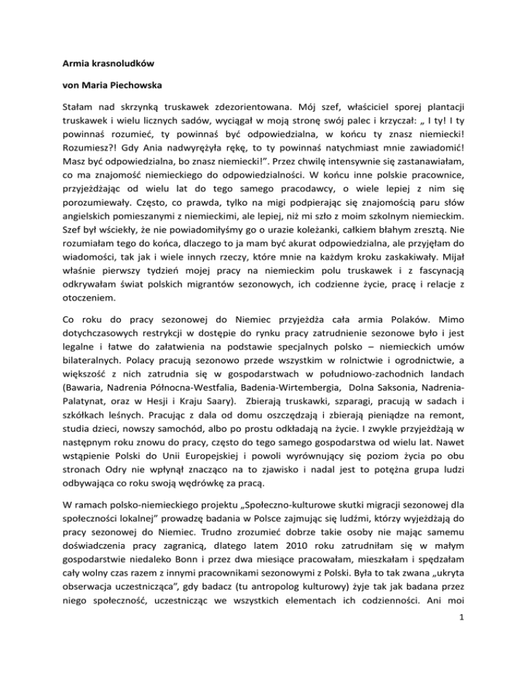 Armia krasnoludków von Maria Piechowska Stałam nad skrzynką truskawek zdezorientowana. Mój szef, właściciel sporej plantacji truskawek i wielu licznych sadów, wyciągał w moją stronę swój palec i krzyczał: „ I ty! I ty powinnaś rozumieć, ty powinnaś być odpowiedzialna, w końcu ty znasz niemiecki! Rozumiesz?! Gdy Ania nadwyrężyła rękę, to ty powinnaś natychmiast mnie zawiadomić! Masz być odpowiedzialna, bo znasz niemiecki!”. Przez chwilę intensywnie się zastanawiałam, co ma znajomość niemieckiego do odpowiedzialności. W końcu inne polskie pracownice, przyjeżdżając od wielu lat do tego samego pracodawcy, o wiele lepiej z nim się porozumiewały. Często, co prawda, tylko na migi podpierając się znajomością paru słów angielskich pomieszanymi z niemieckimi, ale lepiej, niż mi szło z moim szkolnym niemieckim. Szef był wściekły, że nie powiadomiłyśmy go o urazie koleżanki, całkiem błahym zresztą. Nie rozumiałam tego do końca, dlaczego to ja mam być akurat odpowiedzialna, ale przyjęłam do wiadomości, tak jak i wiele innych rzeczy, które mnie na każdym kroku zaskakiwały. Mijał właśnie pierwszy tydzień mojej pracy na niemieckim polu truskawek i z fascynacją odkrywałam świat polskich migrantów sezonowych, ich codzienne życie, pracę i relacje z otoczeniem. Co roku do pracy sezonowej do Niemiec przyjeżdża cała armia Polaków. Mimo dotychczasowych restrykcji w dostępie do rynku pracy zatrudnienie sezonowe było i jest legalne i łatwe do załatwienia na podstawie specjalnych polsko – niemieckich umów bilateralnych. Polacy pracują sezonowo przede wszystkim w rolnictwie i ogrodnictwie, a większość z nich zatrudnia się w gospodarstwach w południowo-zachodnich landach (Bawaria, Nadrenia Północna-Westfalia, Badenia-Wirtembergia, Dolna Saksonia, NadreniaPalatynat, oraz w Hesji i Kraju Saary). Zbierają truskawki, szparagi, pracują w sadach i szkółkach leśnych. Pracując z dala od domu oszczędzają i zbierają pieniądze na remont, studia dzieci, nowszy samochód, albo po prostu odkładają na życie. I zwykle przyjeżdżają w następnym roku znowu do pracy, często do tego samego gospodarstwa od wielu lat. Nawet wstąpienie Polski do Unii Europejskiej i powoli wyrównujący się poziom życia po obu stronach Odry nie wpłynął znacząco na to zjawisko i nadal jest to potężna grupa ludzi odbywająca co roku swoją wędrówkę za pracą. W ramach polsko-niemieckiego projektu „Społeczno-kulturowe skutki migracji sezonowej dla społeczności lokalnej” prowadzę badania w Polsce zajmując się ludźmi, którzy wyjeżdżają do pracy sezonowej do Niemiec. Trudno zrozumieć dobrze takie osoby nie mając samemu doświadczenia pracy zagranicą, dlatego latem 2010 roku zatrudniłam się w małym gospodarstwie niedaleko Bonn i przez dwa miesiące pracowałam, mieszkałam i spędzałam cały wolny czas razem z innymi pracownikami sezonowymi z Polski. Była to tak zwana „ukryta obserwacja uczestnicząca”, gdy badacz (tu antropolog kulturowy) żyje tak jak badana przez niego społeczność, uczestnicząc we wszystkich elementach ich codzienności. Ani moi 1 niemieccy gospodarze, ani współpracownicy w Polski nie znali mojej podwójnej roli, a nie chcąc być inaczej traktowana nie przyznałam się co do prawdziwego celu mojego pobytu. Niemiecki badacz Joerg Becker pisał o pracownikach sezonowych z Polski , że są niewidoczni w społeczeństwie niemieckim i zupełnie jak „armia krasnoludków przychodzą, gdy są przywoływani i odchodzą, gdy praca jest skończona”. Podobnie i ja się czułam. Nie znałam dokładnego terminu wyjazdu – wiedziałam, że będzie to jakoś w czerwcu i od połowy maja czekałam na telefon z Niemiec. Podobnie było z długością pobytu – wiedziałam, że mam umowę na 2 miesiące (którą jednak można bez problemu przedłużyć), domyślałam się, że będę dłużej niż 6 tygodni (bo na krócej nie opłaca się zatrudniać pracowników ze względów ekonomicznych). Poczucie niepewności było zresztą nieustanne, ale tak jest w pracy w rolnictwie. Nigdy nie wiadomo jaka będzie pogoda i jak dokładnie udadzą się zbiory. Trafiłam do małego gospodarstwa, w którym była plantacja truskawek i rozległe sady z jabłoniami i gruszami rozrzucone po całej okolicy. Pracowało nas 5 osób z Polski, często dołączali do nas gospodarze. Praca była ciężka fizycznie. W czasie upałów trzeba było wstać nieraz o 5, żeby nazbierać truskawek jak najwięcej zanim zrobi się naprawdę gorąco – i to bynajmniej nie z troski o nasze zdrowie, ale raczej z powodu starań o jak najwyższą jakość zebranego owocu. Zbierane w upale truskawki są miękkie i szybko się psują. Truskawki zbiera się na kolanach, w kucki, albo w głębokim skłonie. Już po godzinie boli wszystko, a przede wszystkim kręgosłup i kolana. Trudno wytrzymać dłużej, ale w czasie pracy były momenty żartów i pogawędek, chwile rozluźnienia, które jednak rzadko trwały dłużej niż parę minut. Na szczęście poza plantacją truskawek były też sady, do których jeździłyśmy po południu. Tutaj nie było tak ciężko. Tylko ręce bolały od cięcia gałązek sekatorem. Bardziej przerażała mnie monotonia i ogarniająca z każdym spędzonym tam tygodniem nuda. Pracowało się codziennie po 8 – 10 godzin. I to raczej pracownikom zależało, żeby tego czasu było jak najwięcej. Opłacani za godzinę walczyliśmy, żeby było ich najwięcej i często pomimo deszczu czy upału chcieliśmy pracować dalej. Pracowaliśmy też w soboty, ale niedziele były dniem wolnym. Była to okazja, żeby wyspać się, zrobić pranie, ugotować lepszy posiłek. Moje współpracowniczki przypominały co chwila, że nie przyjechałyśmy tu odpoczywać, tylko pracować. To zdanie jak mantra pojawiało się każdego dnia. Mieszkaliśmy w piwnicy i to było chyba jedyne co miałabym do zarzucenia moim gospodarzom