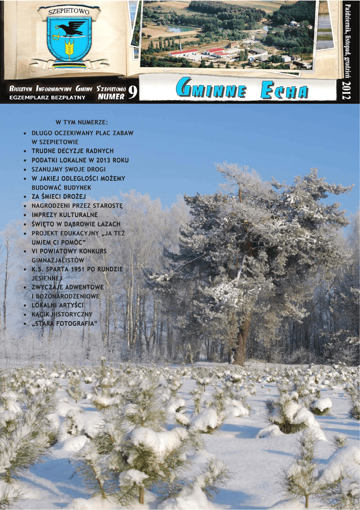 W TYM NUMERZE: • DŁUGO OCZEKIWANY PLAC ZABAW W SZEPIETOWIE • TRUDNE DECYZJE RADNYCH • PODATKI LOKALNE W 2013 ROKU • SZANUJMY SWOJE DROGI • W JAKIEJ ODLEGŁOŚCI MOŻEMY BUDOWAĆ BUDYNEK • ZA ŚMIECI DROŻEJ • NAGRODZENI PRZEZ STAROSTĘ • IMPREZY KULTURALNE • ŚWIĘTO W DĄBROWIE ŁAZACH • PROJEKT EDUKACYJNY „JA TEŻ UMIEM CI POMÓC” • VI POWIATOWY KONKURS GIMNAZJALISTÓW • K.S. SPARTA 1951 PO RUNDZIE JESIENNEJ • ZWYCZAJE ADWENTOWE I BOŻONARODZENIOWE • LOKALNI ARTYŚCI • KĄCIK HISTORYCZNY • „STARA FOTOGRAFIA” Radosnych, spokojnych, pełnych ciepła i życzliwości, spędzonych w gronie najbliższych Świąt Bożego Narodzenia. Wszelkiej pomyślności i wytrwałości w realizacji planów, wielu sukcesów w nadchodzącym 2013 roku wszystkim mieszkańcom Gminy Szepietowo oraz czytelnikom Gminnych Ech GMINNE ECHA życzą Stanisław Roch Wyszyński Burmistrz Szepietowa, Witold Moczydłowski Przewodniczący Rady Miejskiej w Szepietowie oraz Redakcja „Dziś narodził się nam Zbawiciel”. Przyszedł po to, aby przywrócić naszą więź z Bogiem. Ta Dobra Nowina przynosi radość ludziom wszystkich czasów. Dodaje otuchy i wlewa nadzieję także w nasze serca, w czasie, kiedy tak wielu ludzi pogrążonych jest w nocy beznadziejności, zwątpienia i lęku o przyszłość. Pełni wiary i radości świętujemy więc szczególny czas Bożego Narodzenia. Niech te święta dla wszystkich mieszkańców naszej Gminy będą pełne Bożego błogosławieństwa i miłości, którą przynosi ze sobą Boży Syn pod nasze dachy, w nasze rodziny i serce każdego z nas. Niech ta Boża radość i miłość przedłuża się na kolejne dni naszego świętowania i cały Rok Pański 2013. Szczególne życzenia kieruję do: - Drogich moich Parafian, - Władz samorządowych Gminy Szepietowo, - Druhów i druhen OSP Szepietowo, - Wszystkich zakładów pracy i instytucji w naszej gminie. Szepietowo, Boże Narodzenie 2012 Ks. Antoni Bardłowski 2 GMINNE ECHA W październiku br. został oddany do użytku dawno oczekiwany przez dzieci i rodziców plac zabaw na Placu Słonecznym w Szepietowie. Realizacja projektu trwała długo ze względu na długotrwałą procedurę formalno – prawną. Urządzenie placu nastąpiło przy znaczącym wsparciu środków unijnych z Programu Rozwoju Obszarów Wiejskich. Koszt urządzenia placu zabaw wyniósł 295.480 zł, z tego dofinansowanie z PROW wyniosło 192.247 zł. Głównym wykonawcą była firma NOVUM - Wyposażenie Placów Zabaw, Sławomir Chmieliński, Grom 36, 12-130 Pasym, woj. warmińsko – mazurskie. Wykonanie nasadzeń wykonawca powierzył lokalnej firmie „Gospodarstwo Ogrodnicze A.R. Żebrowscy” z Osip Lepertowizny, gm. Wysokie Mazowieckie. W zakres zagospodarowania placu weszły prace: wykonano ciągi piesze; w centralnym punkcie placu został wykonany kwiatowy wzór wpisany w okrąg o promieniu 4; nasadzenia roślinne; roślinność dobrano w taki sposób, aby nie stwarzała zagrożenia dla dzieci; urządzono plac zabaw i małą architekturę; na placu ustawiono 20 sztuk ławek parkowych oraz 8 koszy na śmieci. Wykonano dwa place zabaw, plac zabaw dla dzieci młodszych do lat 4 oraz dla dzieci starszych powyżej 4 lat. Oba place zostały ogrodzone metalowym płotem o wysokości 100 cm. Przed placem zabaw dla dzieci starszych ustawiono stojaki na rowery z 4 stoiskami. Po oddaniu do użytku park prezentuje się okazale. Dobrze by było, aby taki stan trwał jak najdłużej. Na koniec apel Rodzice i dzieci korzystajmy z obiektu w sposób właściwy, szanujmy zamontowane urządzenia, posadzone rośliny i wykonane ciągi piesze. Jeżeli są urządzenia dla młodszych dzieci o dopuszczalnej wadze, to nie mogą korzystać dzieci starsze czy osoby pełnoletnie. Dbajmy o czystość i porządek – na nieczystości są ustawione kosze na śmieci. Myślę, że posadzone rośliny będą upiększały plac i nie będą „pożyczane na swoje potrzeby”. Tak dużo urządzeń i prac można było zakupić i wykonać dzięki wsparciu ze środków unijnych. Nie wiadomo kiedy może się wydarzyć następna taka okazja. Na zdjęciach poniżej nowo oddany do użytku plac zabaw, cieszący się bardzo dużym zainteresowaniem dzieci i rodziców, mimo późnojesiennego okresu. R. Grodzki 3 GMINNE ECHA W dniu 25 października 2012 r. odbyło się wspólne posiedzenie wszystkich Komisji Rady Miejskiej, na którym wypracowano wspólne stanowisko w sprawie dalszego funkcjonowania szkół na terenie gminy Szepietowo. Zdecydowaną większością głosów podjęto decyzję, że zostaną zlikwidowane dwie szkoły podstawowe, tj. szkoły w Wylinach Rusi i Dąbrowie Moczydłach. Główny powód takiej decyzji radnych to: malejąca ilość uczniów w tych szkołach, duże koszty jednostkowe nauki ucznia oraz coraz większe wydatki na oświatę w budżecie gminy nie pokrywane subwencją oświatową. W 2011 roku wydatki na oświatę wyniosły: - szkoły podstawowe—3 675 310,00 zł - publiczne gimnazjum—2 043 256,00 zł - stołówki szkolne—143 114,00 zł - dowóz uczniów—288 007,00 zł - utrzymanie świetlic szkolnych—64 580,00 zł - inne wydatki w oświacie (zapomogi, stypendia naukowe, dokształcanie nauczycieli, odpis na ZFŚS nauczycieli emerytów) - 103 427,00 zł - stypendia socjalne—88 902,00 zł - dotacje na niepubliczne przedszkola—381 711,00 zł - dowóz uczniów niepełnosprawnych—39 338,00 zł - inne wydatki—57 321,00 zł Razem: 6 885 016,00 zł Otrzymana subwencja oświatowa—5 100 528,00 zł Różnica 1 786 388,00 zł czyli taką kwotę Gmina musiała dołożyć z tzw. środków własnych, aby zbilansować wydatki na oświatę w roku ubiegłym. Oczywiście takie wyliczenie jest pewnym uproszczeniem, ponieważ zgodnie z ustawą o dochodach jednostek samorządu terytorialnego dowóz uczniów i środki na przedszkola są to zadania własne gminy i nieujęte w naliczonej subwencji oświatowej, ale oprócz tego w budżecie należy d