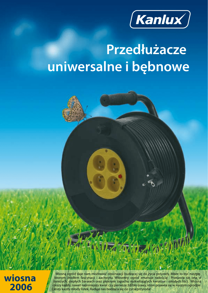 Przedłużacze uniwersalne i bębnowe wiosna 2006 Wiosną ogród daje nam możliwość obserwacji budzącej się do życia przyrody. Może to być niezgłębionym źródłem fascynacji i zachwytu. Wiosenny ogród emanuje radością! Przejawia się ona w świeżych, ciepłych barwach oraz pięknym zapachu rozkwitających kwiatów i młodych liści. Wiosną cieszy każdy, nawet najmniejszy kwiat czy pierwsze źdźbło trawy, które pojawia się w naszym ogrodzie. Cieszy każdy młody listek. Raduje nas budząca się do życia przyroda! Przedłużacze uniwersalne Aby przez najbliższe miesiące móc cieszyć się widokiem pięknego ogrodu niezbędne jest prowadzenie czasochłonnych prac pielęgnacyjnych. Szczególnie ważne jest zadbanie o należyty stan trawnika. Gęsty, krótko przystrzyżony trawnik jest jednym z najważniejszych elementów ogrodu. Także ze względów praktycznych, jest to wszak ta część ogrodu, która nie tylko dostarcza nam doznań estetycznych. Na trawie bawią się nasze dzieci, na trawniku możemy pograć w badmintona czy w piłkę. Aby trawnik stał się wizytówką naszego ogrodu musimy poświęcić mu nieco czasu. Powinniśmy zadbać o nawodnienie i usunięcie chwastów. Najwięcej jednak pracy pochłonie koszenie naszego trawnika. Zwłaszcza w okresie wiosennym niezbędna będzie szczególna pielęgnacja. Aż do początków lata trawę powinno się kosić co tydzień, później już tylko raz na dwa tygodnie. Na szczęście w walce o piękny ogród nie pozostajemy osamotnieni. Dysponujemy przecież urządzeniami elektrycznymi, takimi jak kosiarki czy nożyce, dzięki którym możemy znacznie ułatwić sobie prace ogrodowe i znacząco skrócić ich czas. Jednak aby skorzystać z urządzeń elektrycznych w ogrodzie niezbędne jest podłączenie ich do źródła zasialania. Niestety, najczęściej znaczna część trawnika, który zamierzamy skosić znajduje się poza zasięgiem kosiarki, wyposażonej jedynie w kilkumetrowy kabel przyłączeniowy. Co wtedy robić? Oczywiście należy zaopatrzyć się w dobry, bezpieczny przedłużacz Kanlux, przeznaczony, między innymi, właśnie do zasilania kosiarek. Kilkudziesięciometrowy sznur umożliwia podłączenie kosiarki bez potrzeby łączenia ze sobą wielu krótszych przedłużaczy. KF-HY3-01 20M KF-HY3-01 30M KF-HY3-01 40M Typ Kod Kanlux Rodzaj KF-HY3-01 20M KF-HY3-01 30M KF-HY3-01 40M 4400 uniwersalny 4401 uniwersalny 4402 uniwersalny 20m 2 1 mm2 H05VV-F 1 nie posiada nie posiada 2500W II 30m 2 1 mm2 H05VV-F 1 nie posiada nie posiada 1600W II 40m 2 1 mm2 H05VV-F 1 nie posiada nie posiada 1200W II Zdjęcie Długość przewodu Ilość żył Przekrój żyły Typ przewodu Liczba gniazd Zabezpieczenie termiczne Osłony torów prądowych Maksymalne obciążenie Do urządzeń klasy Znak zgodności Kanlux sp. z o.o., ul. Objazdowa 1-3 / 41-922 Radzionków Tel.: /32/ 388 74 00 fax: +48 /32/ 388 74 99 / e-mail: [email protected] Przedłużacze bębnowe Wiosna to nie tylko budząca się do życia przyroda, to także czas porządków i drobnych prac remontowych. Przy ich przeprowadzaniu niezbędny okaże się przedłużacz bębnowy Kanlux. Umożliwi on bezproblemowe korzystanie z przydatnych urządzeń elektrycznych, takich jak wiertarka, szlifierka, czy opalarka, w miejscach znacząco oddalonych od źródeł zasilania. Przedłużacz bębnowy Kanlux znakomicie sprawdzi się także przy prowadzeniu remontów i różnego rodzaju prac budowlanych. Umożliwi on również prowadzenie pracy po zapadnięciu zmroku. Do przedłużacza bębnowego Kanlux można podłączyć np. przenośną oprawę halogenową i oświetlić nią żądane miejsce. Przedłużacze bębnowe Kanlux są niezwykle wygodne w użytkowaniu. Z bębna rozwinąć można tylko taką długość kabla, jakiej potrzebujemy. Pozostała część przedłużacza pozostaje na bębnie, dzięki czemu sznur nie plącze się i nie stwarza potencjalnego niebezpieczeństwa np. potknięcia się. Przedłużacze bębnowe Kanlux wyposażone są w termiczne wyłączniki zabezpieczające przed ewentualnym przegrzaniem sznura przedłużacza. Ponadto w przedłużaczach bębnowych Kanlux zainstalowane są przesłony torów prądowych, dodatkowo chroniące przed porażeniem elektrycznym. Sposobów zastosowania przedłużaczy bębnowych Kanlux jest bardzo wiele. Począwszy od wykorzystania ich do podłączenia grilla elektrycznego latem, a skończywszy na zasileniu lampek, jakie zawiesza się na świerkach w czasie Świąt Bożego Narodzenia. Korzystając z przedłużaczy bębnowych Kanlux można bezpiecznie i wygodnie podłączyć różnorakie urządzenia elektryczne. KF-FBG-20A 25M KF-FBG-23A 40M/50M Typ Kod Kanlux Rodzaj KF-FBG-20A 25M KF-FBG-23A 40M KF-FBG-23A 50M 4395 bębnowy 4396 bębnowy 4397 bębnowy 25m 3 1,5 mm2 H05VV-F 4 posiada posiada zwinięty 1100W rozwinięty 3200W I 40m 3 1,5 mm2 H05VV-F 4 posiada posiada zwinięty 1100W rozwinięty 3200W I 50m 3 1,5 mm2 H05VV-F 4 posiada posiada zwinięty 1100W rozwinięty 3200W I Zdjęcie Długość przewodu Ilość żył Przekrój żyły Typ przewodu Liczba gniazd Zabezpieczenie termiczne Osłony torów prądowych Maksymalne obciążenie Do urządzeń klasy Znak zgodności www.kanlux.pl ISO 9001 : 2000 certificate Zestawienie zbiorcze prezentowanych przedłużaczy Typ KF-HY3-01 20M KF-HY3-01 30M KF-HY3-01 40M KF-FBG-20A 25M KF-FBG-23A 40M KF-FBG-23A 50M 4400 4401 4402 4395 4396 4397 uniwersalny uniwersalny uniwersalny bębnowy bębnowy bębnowy 20m 30m 40m 25m 40m 50m 2 2 2 3 3 3 1 mm2 1 mm2 1 mm2 1,5 mm2 1,5 mm2 1,5 mm2 Typ przewodu H05VV-F H05VV-F H05VV-F H05VV-F H05VV-F H05VV-F Liczba gniazd 1 1 1 4 4 4 Zabezpieczenie termiczne nie posiada nie posiada nie posiada posiada posiada posiada Osłony torów prądowych nie posiada nie posiada nie posiada posiada posiada posiada zwinięty 1100W zwinięty 1100W zwinięty 1100W Maksymalne obciążenie 2500W 1600W 1200W rozwinięty 3200W rozwinięty 3200W rozwinięty 3200W II II II I I I Kod K