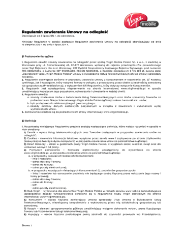 Regulamin zawierania Umowy na odległość Obowiązuje od 2 lipca 2014 r. do odwołania. Niniejszy Regulamin w całości zastępuje Regulamin zawierania Umowy na odległość obowiązujący od dnia 16 sierpnia 2012 r. do dnia 1 lipca 2014 r. §1 Postanowienia ogólne 1. Regulamin określa zasady zawierania na odległość przez spółkę Virgin Mobile Polska Sp. z o.o., z siedzibą w Warszawie przy ul. Domaniewskiej 49, 02-672 Warszawa, wpisaną do rejestru przedsiębiorców prowadzonego przez Sąd Rejonowy dla m.st. Warszawy, XIII Wydział Gospodarczy Krajowego Rejestru Sądowego, pod numerem KRS 0000415094, o numerze NIP 9512354680, REGON 146056906, o Kapitale zakładowym 6 176 400 zł, zwaną dalej „Operatorem" albo „Virgin Mobile Polska" Umowy o świadczenie Usług Telekomunikacyjnych lub Umowy sprzedaży Towarów. 2. Regulamin obowiązuje zarówno w przypadku zawarcia umowy z Konsumentem w rozumieniu art. 22 1 Kodeksu cywilnego, jak i Kupującym, który nabywa Towary w związku z prowadzoną przez siebie działalnością zawodową lub gospodarczą (Przedsiębiorcą), z wyłączeniem §15 Regulaminu, który dotyczy wyłącznie Konsumentów. 3. Regulamin jest udostępniany nieprzerwanie na stronie internetowej www.virginmobile.pl w sposób umożliwiający Kupującym jego pozyskanie, odtwarzanie i utrwalanie w każdej chwili; 4. Regulamin określa: a. zasady zawierania Umów o świadczenie Usług Telekomunikacyjnych oraz Umów sprzedaży Towarów za pośrednictwem Sklepu Internetowego Virgin Mobile Polska (@Sklep) zakres i warunki ww. umów; b. tryb postępowania reklamacyjnego i gwarancyjnego; c. zasady ochrony danych osobowych pozyskanych w związku z zawarciem i wykonaniem wyżej wymienionych umów. 5. Zamówienia składane są za pośrednictwem strony internetowej: www.virginmobile.pl. §2 Definicje 1. Na potrzeby niniejszego Regulaminu przyjęte zostają następujące definicje, które należy rozumieć w sposób w nich określony: 1) Cennik – wykaz Usług telekomunikacyjnych oraz Towarów dostępnych w przypadku zawierania umów na odległość; 2) Cookies - niewielkie informacje tekstowe, wysyłane przez serwis www i zapisywane po stronie Użytkownika (zazwyczaj na twardym dysku komputera) w przypadku zawierania umów za pośrednictwem @Sklep); 3) Dzień Roboczy – dzień w godzinach pracy Virgin Mobile Polska, z wyjątkiem sobót, niedziel, świąt oraz dni ustawowo wolnych od pracy. 4) Formularz Zamówienia – formularz elektroniczny udostępniony do wypełnienia na stronie www.virginmobile.pl, w przypadku zawierania umów za pośrednictwem @Sklep: a. w przypadku kupujących będących Konsumentami: - imię i nazwisko; - adres dostawy Towaru; - adres do faktury; - adres poczty elektronicznej; b. w przypadku kupujących niebędących Konsumentami (tj. podmiotów gospodarczych): - imię i nazwisko lub oznaczenie podmiotu nie będącego osobą fizyczną przez wskazanie jego nazwy i formy prawnej; - adres dostawy Towaru; - adres do faktury; - NIP; - adres poczty elektronicznej. 5) Klub Virgin – wydzielona dla abonentów Virgin Mobile Polska w ramach serwisu www sekcja samoobsługowa (szczegółowe zasady funkcjonowania określone są w regulaminie Klubu Virgin dostępnym na stronie internetowej www.virginmobile.pl). 6) Konsument – osoba fizyczna zawierająca Umowę sprzedaży i/lub Umowę o świadczenie Usług Telekomunikacyjnych, niezwiązaną bezpośrednio z wykonywaną przez nią działalnością gospodarczą lub zawodową; 7) Koszyk – element oprogramowania @Sklepu umożliwiający wstępne dokonanie wyboru przez Kupującego Towaru lub/i zamówienie Usługi telekomunikacyjnej; 8) Kupujący – osoba fizyczna posiadająca pełną zdolność do czynności prawnych lub Przedsiębiorca, Strona 1 Kupującym może być również osoba posiadająca ograniczoną zdolność do czynności prawnych przy czym osoba posiadająca ograniczoną zdolność do czynności prawnych może nabywać wyłącznie akcesoria oraz zestawy startowe dla usług przedpłaconych (Prepaid); 9) Obsługa Klienta (OK) – jednostki organizacyjne, których zadaniem jest m.in. udzielanie Kupującemu pomocy oraz informacji niezbędnych do realizacji umowy zawartej za pośrednictwem @Sklep. Kontakt z Obsługą Klienta możliwy jest pod numerem 799 555 222 czynne 7 dni w tygodniu, od godziny 8:00 do godziny 22:00 oraz mailowo, pisząc na adres: [email protected]; 10) Oferta - w przypadku Umowy sprzedaży w Ofercie wybranej przez Kupującego: a. wybrany przez Kupującego Starter wraz z aparatem telefonicznym lub modemem; b. wybrany przez Kupującego Starter bez aparatu telefonicznego; 11) Podmiot dostarczający przesyłkę – Poczta Polska albo firma kurierska (Kurier), której nazwa i adres podane są w niniejszym Regulaminie i której Sprzedawca, zgodnie z dyspozycją Kupującego złożoną w Formularzu Zamówienia, zlecił dostarczenie przesyłki do Kupującego; 12) Przedsiębiorca – osoby fizyczne, osoby prawne, jednostki organizacyjne nie posiadające osobowości prawnej prowadzące działalność gospodarczą oraz inne podmioty posiadające numer REGON; 13) Punkt Sprzedający Virgin Mobile Polska - autoryzowane przez Virgin Mobile Polska sklepy oraz punkty obsługi Abonentów Virgin Mobile Polska, w których oferowane są usługi Virgin Mobile Polska; 14) Regulamin – niniejszy dokument; 15) Sieć Telekomunikacyjna – sieć telekomunikacyjna w rozumieniu Prawa Telekomunikacyjnego, wykorzystywana przez Virgin Mobile Polska do świadczenia Usług Telekomunikacyjnych; 16) @Sklep - Sklep Internetowy Virgin Mobile Polska - serwis internetowy o adresie www.virginmobile.pl, umożliwiający zawieranie umów o świadczenie Usług Telekomunikacyjnych, zawarcie Umowy sprzedaży Towarów, przy pomocy, którego Sprzedawca proponuje zawarcie umowy w postaci zaproszenia do składania zamówień (prowadzone w języku polskim); 17) Sprzedawca – Virgin Mobile Polska; 18) Starter (Zestaw Startowy) - Karta SIM/US