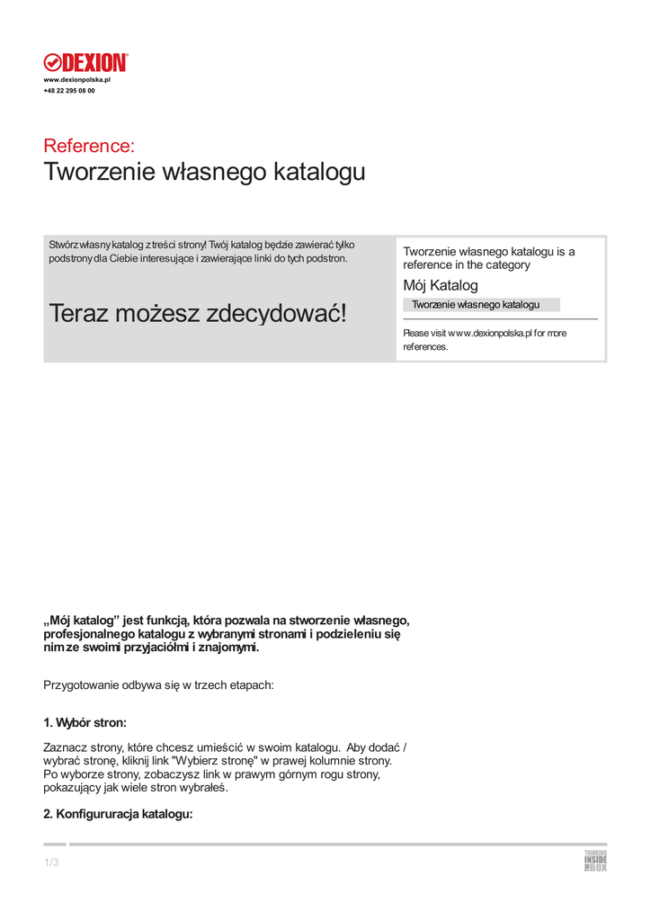 www.dexionpolska.pl +48 22 295 08 00 Reference: Tworzenie własnego katalogu Stwórz własny katalog z treści strony! Twój katalog będzie zawierać tylko podstrony dla Ciebie interesujące i zawierające linki do tych podstron. Tworzenie własnego katalogu is a reference in the category Mój Katalog Tworzenie własnego katalogu Teraz możesz zdecydować! Please visit www.dexionpolska.pl for more references. „Mój katalog” jest funkcją, która pozwala na stworzenie własnego, profesjonalnego katalogu z wybranymi stronami i podzieleniu się nim ze swoimi przyjaciółmi i znajomymi. Przygotowanie odbywa się w trzech etapach: 1. Wybór stron: Zaznacz strony, które chcesz umieścić w swoim katalogu. Aby dodać / wybrać stronę, kliknij link "Wybierz stronę" w prawej kolumnie strony. Po wyborze strony, zobaczysz link w prawym górnym rogu strony, pokazujący jak wiele stron wybrałeś. 2. Konfigururacja katalogu: 1/3 www.dexionpolska.pl +48 22 295 08 00 Po wybraniu interesujących stron, kliknij link "Mój katalog" w prawym górnym rogu. To Przeniesie do podstrony "Mój katalog", gdzie można konfigurować dalej: Sortowanie po: Możesz zmienić kolejność stron, przeciągając i upuszczając miniatury stron. Usuń: Możesz usunąć stronę, klikając przycisk X na miniaturce obrazu tej strony. Dołącz obrazy: Jeśli ta opcja jest zaznaczona, obrazy zostaną uwzględnione w generowanym pliku PDF. Zdjęcia będą zoptymalizowane do drukowania w domu. Jeśli to nie jest zaznaczone, to tylko tekst zostanie zawarty w wygenerowanym pliku PDF. Dołącz akcesoria: Jeśli ta opcja jest zaznaczona, to zostaną uwzględnione wszystkie akcesoria dostępne dla stron wybranych produktów w generowanym pliku PDF. Jeśli to nie jest zaznaczone, to tylko informacje o produkcie zostaną uwzględnione. Wyślij: Kliknij ten link, jeśli chcesz podzielić się swoją konfiguracją w katalogu. Odbiorca otrzyma e-mail z linkiem do tej strony. Odbiorca może kontynuować generowanie PDF lub kontynuować dodawanie stron lub konfigurować katalog dalej. Link: Po kliknięciu generowany jest link, do strony konfiguracji Katalogu. Można użyć tego URL do akcji swojego katalogu na mediach społecznościowych lub do tworzenia zakładek w przeglądarce w celu późniejszego wykorzystania. 3. Tworzenie i udostępnianie katalogu: UWAGA: Ta funkcja wymaga zainstalowania programu Acrobat Reader lub podobnej przeglądarki PDF na komputerze. Gdy chcesz utworzyć katalog w formacie PDF, kliknij na przycisk "Make PDF". Rozpocznie się generowanie katalogu na bieżąco, na podstawie treści z wybranych stron (w czasie rzeczywistym!). Może to potrwać od 2-20 sekund zależnie od liczby wybranych stron. Otworzy się podgląd. Z podglądu można sprawdzić w katalog przed podjęciem dalszych działań. Można powrócić do strony konfiguracyjnej, klikając poza obszarem katalogu lub na przycisk X i dokonać dalszych zmian. Są dwie opcje na dole strony podglądu: Zapisz: Kliknij ten link, aby zapisać katalog w formacie PDF na swoim komputerze. Wyślij: Kliknij ten link, aby wysłać e-mail z katalogiem (w formacie PDF), jako załącznik. Ponieważ ta funkcja używa programu Acrobat Reader, można również korzystać z funkcji tych programów: wysyłania, zapisywania i drukowania katalogu. Kliknij tutaj, aby powrócić do strony konfiguracji Mojego Katalogu 2/3 www.dexionpolska.pl +48 22 295 08 00 3/3