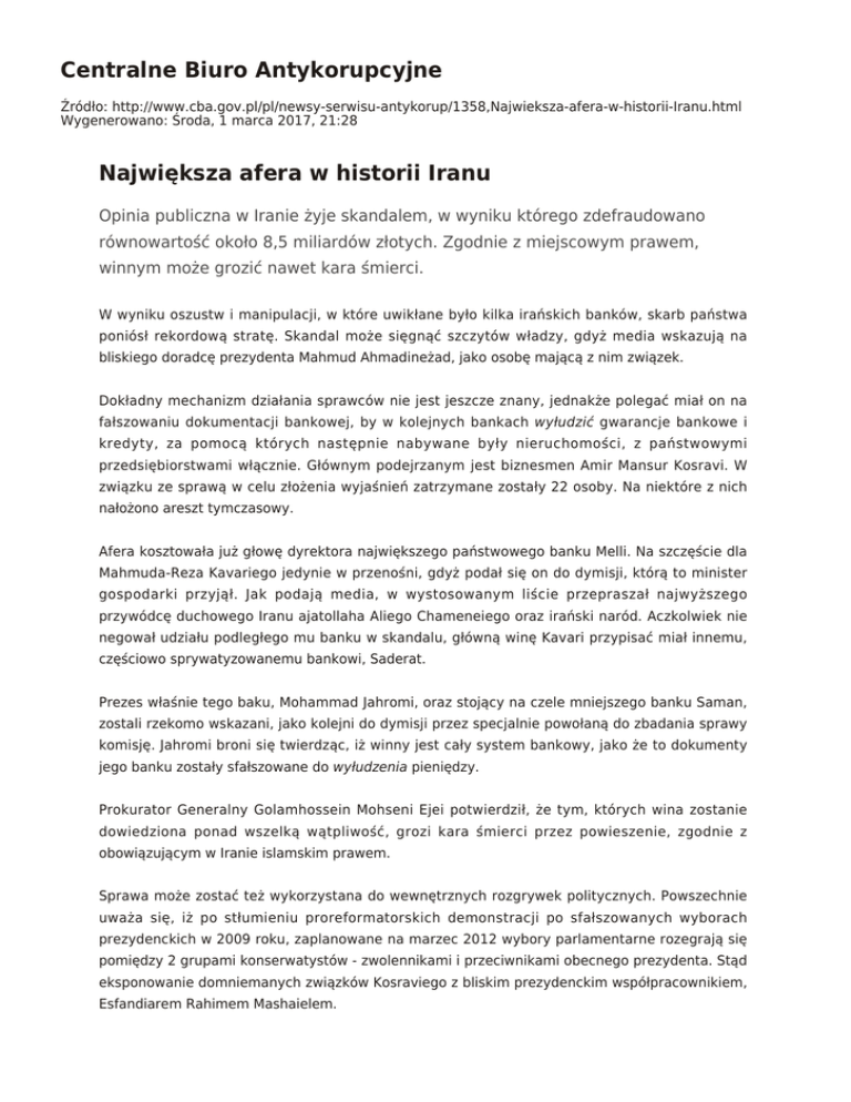 Centralne Biuro Antykorupcyjne Źródło: http://www.cba.gov.pl/pl/newsy-serwisu-antykorup/1358,Najwieksza-afera-w-historii-Iranu.html Wygenerowano: Środa, 1 marca 2017, 21:28 Największa afera w historii Iranu Opinia publiczna w Iranie żyje skandalem, w wyniku którego zdefraudowano równowartość około 8,5 miliardów złotych. Zgodnie z miejscowym prawem, winnym może grozić nawet kara śmierci. W wyniku oszustw i manipulacji, w które uwikłane było kilka irańskich banków, skarb państwa poniósł rekordową stratę. Skandal może sięgnąć szczytów władzy, gdyż media wskazują na bliskiego doradcę prezydenta Mahmud Ahmadineżad, jako osobę mającą z nim związek. Dokładny mechanizm działania sprawców nie jest jeszcze znany, jednakże polegać miał on na fałszowaniu dokumentacji bankowej, by w kolejnych bankach wyłudzić gwarancje bankowe i kredyty, za pomocą których następnie nabywane były nieruchomości, z państwowymi przedsiębiorstwami włącznie. Głównym podejrzanym jest biznesmen Amir Mansur Kosravi. W związku ze sprawą w celu złożenia wyjaśnień zatrzymane zostały 22 osoby. Na niektóre z nich nałożono areszt tymczasowy. Afera kosztowała już głowę dyrektora największego państwowego banku Melli. Na szczęście dla Mahmuda-Reza Kavariego jedynie w przenośni, gdyż podał się on do dymisji, którą to minister gospodarki przyjął. Jak podają media, w wystosowanym liście przepraszał najwyższego przywódcę duchowego Iranu ajatollaha Aliego Chameneiego oraz irański naród. Aczkolwiek nie negował udziału podległego mu banku w skandalu, główną winę Kavari przypisać miał innemu, częściowo sprywatyzowanemu bankowi, Saderat. Prezes właśnie tego baku, Mohammad Jahromi, oraz stojący na czele mniejszego banku Saman, zostali rzekomo wskazani, jako kolejni do dymisji przez specjalnie powołaną do zbadania sprawy komisję. Jahromi broni się twierdząc, iż winny jest cały system bankowy, jako że to dokumenty jego banku zostały sfałszowane do wyłudzenia pieniędzy. Prokurator Generalny Golamhossein Mohseni Ejei potwierdził, że tym, których wina zostanie dowiedziona ponad wszelką wątpliwość, grozi kara śmierci przez powieszenie, zgodnie z obowiązującym w Iranie islamskim prawem. Sprawa może zostać też wykorzystana do wewnętrznych rozgrywek politycznych. Powszechnie uważa się, iż po stłumieniu proreformatorskich demonstracji po sfałszowanych wyborach prezydenckich w 2009 roku, zaplanowane na marzec 2012 wybory parlamentarne rozegrają się pomiędzy 2 grupami konserwatystów - zwolennikami i przeciwnikami obecnego prezydenta. Stąd eksponowanie domniemanych związków Kosraviego z bliskim prezydenckim współpracownikiem, Esfandiarem Rahimem Mashaielem. Źródła: http://www.businessweek.com/news/2011-09-28/iran-bank-chief-quits-over-fraud-as-pressure-onpresident-rises.html http://www.rferl.org/content/article/24341998.html http://english.alarabiya.net/articles/2011/09/27/169003.html Opublikowano 3.10.2011 na www.antykorupcja.edu.pl oprac. Wydział Komunikacji Społecznej GSz CBA