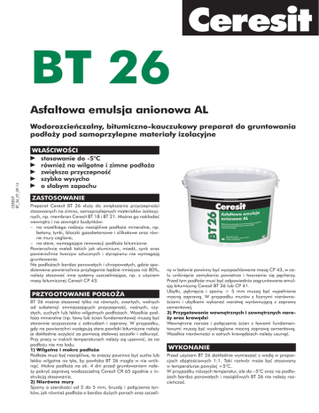 BT 26 Asfaltowa emulsja anionowa AL CERESIT BT_26_KT_09.14 Wodorozcieńczalny, bitumiczno-kauczukowy preparat do gruntowania podłoży pod samoprzylepne materiały izolacyjne WŁAŚCIWOŚCI stosowanie do -5°C również na wilgotne i zimne podłoża zwiększa przyczepność szybko wysycha o słabym zapachu ZASTOSOWANIE Preparat Ceresit BT 26 służy do zwiększania przyczepności stosowanych na zimno, samoprzylepnych materiałów izolacyjnych, np. membran Ceresit BT 18 i BT 21. Można go nakładać wewnątrz i na zewnątrz budynków: – na wszelkiego rodzaju nasiąkliwe podłoża mineralne, np. betony, tynki, bloczki gazobetonowe i silikatowe oraz równe mury ceglane, – na stare, wymagające renowacji podłoża bitumiczne. Powierzchnie metali takich jak aluminium, miedź, cynk oraz powierzchnie tworzyw sztucznych i styropianu nie wymagają gruntowania. Na podłożach bardzo porowatych i chropowatych, gdzie spodziewana powierzchnia przylegania będzie mniejsza niż 80%, należy stosować inne systemy uszczelniające, np. z użyciem masy bitumicznej Ceresit CP 43. PRZYGOTOWANIE PODŁOŻA BT 26 można stosować tylko na równych, zwartych, wolnych od substancji zmniejszających przyczepność, nośnych, czystych, suchych lub lekko wilgotnych podłożach. Wszelkie podłoża mineralne (np. ławy lub ścian fundamentowe) muszą być starannie oczyszczone z zabrudzeń i zaprawy. W przypadku, gdy na powierzchni występują stare powłoki bitumiczne należy je dokładnie oczyścić za pomocą stalowej szczotki i odkurzyć. Przy pracy w niskich temperaturach należy się upewnić, że na podłożu nie ma lodu. 1) Wilgotne i mokre podłoża Podłoże musi być nasiąkliwe, to znaczy powinno być suche lub lekko wilgotne na tyle, by powłoka BT 26 mogła w nie wniknąć. Mokre podłoża na ok. 4 dni przed gruntowaniem należy pokryć zaprawą wodoszczelną Ceresit CR 65 zgodnie z instrukcją stosowania. 2) Nierówne mury Spoiny o szerokości od 2 do 5 mm, bruzdy i połączenia tynków, jak również podłoża o bardzo dużych porach oraz szczeli- ny w betonie powinny być wyszpachlowane masą CP 43, w celu uniknięcia zamykania powietrza i tworzenia się pęcherzy. Przed tym podłoże musi być odpowiednio zagruntowane emulsją bitumiczną Ceresit BT 26 lub CP 41. Ubytki, pęknięcia i spoiny > 5 mm muszą być wypełnione mocną zaprawą. W przypadku murów z licznymi nierównościami i ubytkami wykonać warstwę wyrównującą z zaprawy cementowej. 3) Przygotowanie wewnętrznych i zewnętrznych naroży oraz krawędzi Wewnętrzne naroża i połączenia ścian z ławami fundamentowymi muszą być wyokrąglone mocną zaprawą cementową. Wszelkie nierówności o ostrych krawędziach należy usunąć. WYKONANIE Przed użyciem BT 26 dokładnie wymieszać z wodą w proporcjach objętościowych 1:1. Taki roztwór może być stosowany w temperaturze powyżej +5°C. W przypadku niższych temperatur, ale do –5°C oraz na podłożach bardzo porowatych i nasiąkliwych BT 26 nie należy rozcieńczać. UWAGA BT 26 stosować tylko w suchych warunkach, w temperaturze od –5°C do +30°C i przy względnej wilgotności powietrza poniżej 80%. Przechowywać i przewozić w temp. nie niższej niż +5°C. Świeże zabrudzenia BT 26 zmywać wodą. Stwardniały materiał można usunąć za pomocą rozpuszczalnika, np. benzyny ekstrakcyjnej. W czasie pracy stosować ubrania, rękawice i okulary ochronne. Chronić przed dziećmi. W przypadku kontaktu z oczami płukać je obficie wodą i zasięgnąć porady lekarskiej. Wszelkie dane odnoszą się do temperatury +20°C i względnej wilgotności powietrza 60%. W innych warunkach należy uwzględnić krótszy lub dłuższy czas wysychania preparatu. ZALECENIA Niniejsza karta techniczna określa zakres stosowania materiału i zalecany sposób prowadzenia robót, ale nie może zastąpić zawodowego przygotowania wykonawcy. Oprócz podanych zaleceń prace należy wykonać zgodnie ze sztuką budowlaną i zasadami BHP. Producent gwarantuje jakość wyrobu, natomiast nie ma wpływu na warunki i sposób jego użycia. W przypadku wątpliwości należy wykonać własne próby stosowania. Wraz z ukazaniem się tej karty technicznej tracą ważność karty wcześniejsze. SKŁADOWANIE Do 12 miesięcy od daty produkcji przy składowaniu w chłodnych i suchych warunkach. Chronić przed mrozem! OPAKOWANIA Pojemniki plastikowe 5 kg. DANE TECHNICZNE Baza: wodna emulsja bitumiczno-kauczukowa z wypełniaczami mineralnymi Gęstość: 1,13 kg/dm3 Odporność na temperaturę (stwardniałej powłoki): od -25°C do +120°C Odporność na mróz: do -5°C Rozcieńczalnik: woda Proporcje rozcieńczania: BT 26 : woda jak 1:1, lub bez rozcieńczania (patrz WYKONANIE) Temperatura stosowania: od -5°C do +30°C Czas potrzebny do całkowitego wyschnięcia: wymienione poniżej czasy wysychania są wartościami typowymi, zależnymi od zawilgocenia podłoża i warunków temperaturowo-wilgotnościowych podłoża temperatura/wilgotność powietrza czasy schnięcia ok. +20°C/80% +5°C/80% +5°C/95% -5°C/80% +20°C/80% +5°C/80% +5°C/95% -5°C/80% +20°C/80% +5°C/80% -5°C/95% 1 godz. 3 godz. 6 godz. 6 godz. 2 godz. 6 godz. 1 dzień 1 dzień 6 godz. 1-2 dni ok. 7 dni suche wilgotne (50% nasycenia) wilgotne (70% nasycenia) Odporność na deszcz: po ok. 1÷3 godz. Orientacyjne zużycie: od 0,15 do 0,30 kg/m2 w zależności od sposobu stosowania CERESIT BT_26_KT_09.14 Preparat równomiernie i obficie nakładać pędzlem lub poprzez natryskiwanie. Przy niskich temperaturach należy się upewnić, że podłoże nie jest pokryte lodem. Przed naklejaniem membran BT 18 lub BT 21, powłoka gruntująca musi być całkowicie wyschnięta i mieć odpowiednią przyczepność do podłoża. Czas potrzebny do całkowitego wyschnięcia zależy od takich czynników jak zawilgocenie podłoża, wilgotność względna i temperatura powietrza. Typowe przypadki opisane są w danych technicznych.
