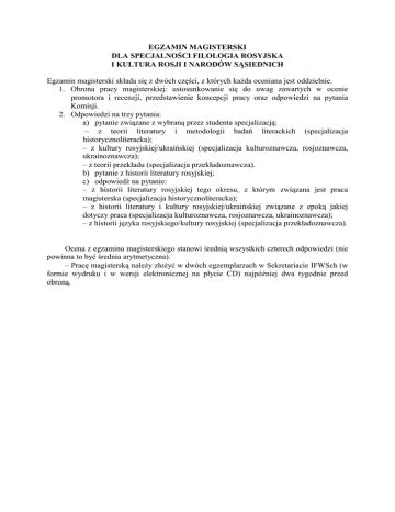 EGZAMIN MAGISTERSKI DLA SPECJALNOŚCI FILOLOGIA ROSYJSKA I KULTURA ROSJI I NARODÓW SĄSIEDNICH Egzamin magisterski składa się z dwóch części, z których każda oceniana jest oddzielnie. 1. Obrona pracy magisterskiej: ustosunkowanie się do uwag zawartych w ocenie promotora i recenzji, przedstawienie koncepcji pracy oraz odpowiedzi na pytania Komisji. 2. Odpowiedzi na trzy pytania: a) pytanie związane z wybraną przez studenta specjalizacją: – z teorii literatury i metodologii badań literackich (specjalizacja historycznoliteracka); – z kultury rosyjskiej/ukraińskiej (specjalizacja kulturoznawcza, rosjoznawcza, ukrainoznawcza); – z teorii przekładu (specjalizacja przekładoznawcza). b) pytanie z historii literatury rosyjskiej; c) odpowiedź na pytanie: – z historii literatury rosyjskiej tego okresu, z którym związana jest praca magisterska (specjalizacja historycznoliteracka); – z historii literatury i kultury rosyjskiej/ukraińskiej związane z epoką jakiej dotyczy praca (specjalizacja kulturoznawcza, rosjoznawcza, ukrainoznawcza); – z historii języka rosyjskiego/kultury rosyjskiej (specjalizacja przekładoznawcza). Ocena z egzaminu magisterskiego stanowi średnią wszystkich czterech odpowiedzi (nie powinna to być średnia arytmetyczna). – Pracę magisterską należy złożyć w dwóch egzemplarzach w Sekretariacie IFWSch (w formie wydruku i w wersji elektronicznej na płycie CD) najpóźniej dwa tygodnie przed obroną. HISTORIA LITERATURY ROSYJSKIEJ PROBLEMATYKA EGZAMINU MAGISTERSKIEGO DLA SPECJALNOŚCI FILOLOGIA ROSYJSKA (SPECJALIZACJE HISTORYCZNOLITERACKA I KULTUROZNAWCZA) ORAZ DLA SPECJALNOŚCI KULTURA ROSJI I NARODÓW SĄSIEDNICH (SPECJALIZACJA ROSJOZNAWCZA) 1. Periodyzacja dziejów literatury rosyjskiej. Charakterystyka poszczególnych okresów. Piśmiennictwo doby staroruskiej: okres Rusi Kijowsko-Nowogrodzkiej, czasy niewoli mongolskiej, Państwo Moskiewskie (XV-XVI wiek), XVII wiek. Literatura okresu Cesarstwa Rosyjskiego: wiek XVIII, wiek XIX, przełom XIX i XX wieku. Literatura okresu radzieckiego (1917-1991). Literatura Rosji współczesnej (po roku 1991). 2. Prądy literackie: barok, klasycyzm, sentymentalizm, romantyzm, realizm i jego odmiany, symbolizm, impresjonizm, akmeizm, futuryzm, imażynizm, ornamentalizm, neoklasycyzm, socrealizm, postmodernizm. 3. Najważniejsze gatunki literatury rosyjskiej: kronikarstwo, homiletyka, hagiografia, opowieść wojenna/moralizatorska/obyczajowa, nowela/opowiadanie – „skaz” jako specyficzna forma narracji, szkic fizjologiczny, powieść i jej odmiany, satyra obyczajowa/polityczna, utopia/antyutopia, poemat epicki/dygresyjny, gatunki liryczne, wiersze prozą, pamiętnikarstwo, dramat psychologiczny/obyczajowy/symboliczny, komedia obyczajowa/satyryczna. 4. Wiodące tematy i motywy literatury rosyjskiej: jednostka a społeczeństwo i władza, absurdalność i dwoistość rzeczywistości rosyjskiej, literatura a religia, problematyka moralna/filozoficzna – poszukiwanie sensu istnienia, patriotyzm, heroizm, utopijność, losy inteligencji, upadek „gniazd szlacheckich”, miłość jako próba charakteru, dialektyka wolności, piękno, sztuka i artysta, człowiek a rewolucja, człowiek wobec wojny, rzeczywistość łagrowa. 5. Typowi bohaterowie: obrońca ziemi ruskiej, mądra i wierna kobieta, pannaszlachcianka, kobieta fatalna, romantyczny buntownik „zbędny człowiek”, „mały człowiek”, sobowtór, nawrócony szlachcic, raznoczyńca-nihilista, „mąż sprawiedliwy”, dekadent, bohater/ofiara rewolucji, „zwykły sowiecki obywatel”, mądry prostaczek, więzień sumienia. 6. Rosyjscy pisarze nobliści. KULTURA ROSYJSKA PROBLEMATYKA EGZAMINU MAGISTERSKIEGO DLA SPECJALNOŚCI FILOLOGIA ROSYJSKA (SPECJALIZACJA KULTUROZNAWCZA) 1. Periodyzacja dziejów kultury rosyjskiej. Charakterystyka poszczególnych okresów: kultura Rusi Kijowsko-Nowogrodzkiej, kultura czasów niewoli mongolskiej, kultura Wielkiego Księstwa Moskiewskiego i Rusi Moskiewskiej (XV–XVI wiek), kultura Rosji XVII wieku, kultura Cesarstwa Rosyjskiego (XVIII–XIX wiek), kultura Rosji radzieckiej (wiek XX), kultura Rosji współczesnej (po roku 1991). 2. Elementy kultury ludowej (mentalność, świadomość estetyczna, gospodarstwo wiejskie, wystrój chłopskiej chaty, rzemiosło artystyczne, centra przemysłów ludowych). 3. Prawosławie i jego oddziaływanie kulturowe: wspólne dziedzictwo chrześcijaństwa, różnice pomiędzy katolicyzmem a prawosławiem; prawosławny rok liturgiczny i najważniejsze święta; architektura sakralna, symbolika świątyni; liturgia prawosławna jako synteza sztuk; ikony i ich symbolika. 4. Zabytki architektury staroruskiej XI–XVII wieku: Kijów, Nowogród Wielki, Włodzimierz, Suzdal, Moskwa, Jarosław, klasztory. Budownictwo drewniane. 5. Reformy Piotra I (przejście od światopoglądu średniowiecznego do nowożytnego; czas: kalendarz; sekularyzacja życia publicznego i prywatnego; nowe instytucje kulturalne; wybitne postacie). 6. Najważniejsze zabytki architektury Moskwy i Petersburga. 7. „Szlacheckie gniazda”, ogrody i parki: rezydencje cesarskie (Petershof, Carskie Sioło, Pawłowsk); rezydencje magnackie (Ostankino, Kuskowo); dworki szlacheckie jako centra artystyczne (Ostafjewo, Muranowo, Abramcewo). 8. Wybitni malarze rosyjscy XVIII–XIX wieku: mistrzowie portretu; malarze-romantycy (O. Kiprienski, K. Briułłow, W. Tropinin, I. Ajwazowski); pierwsi realiści (P. Fiedotow, W. Pierow); „pieriedwiżnicy”: portret (I. Kramskoj, I. Riepin, N. Jaroszenko, W. Sierow), pejzaż (A. Sawrasow, I. Szyszkin, W. Polenow, A. Quingi), malarstwo historyczne (N. Gay, W. Wiereszczagin), stylizacja baśniowa (W. Wasniecow). 9. Muzyka rosyjska XIX wieku: powstanie szkoły narodowej (M. Glinka, A. Dargomyżski); „Potężna gromadka” (A. Borodin, M. Musorgski, N. Rimski-Korsakow); neoromantyzm końca XIX wieku: P. Czajkowski. 10. Podstawowe etapy rozwoju sztuki teatralnej XVIII – początk
