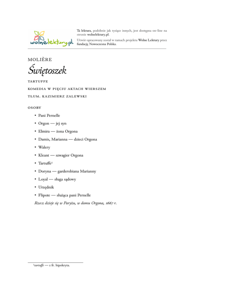 Ta lektura, podobnie jak tysiące innych, jest dostępna on-line na stronie wolnelektury.pl. Utwór opracowany został w ramach projektu Wolne Lektury przez fundację Nowoczesna Polska. MOLIÈRE Świętoszek ę ł. • Pani Pernelle • Orgon — jej syn • Elmira — żona Orgona • Damis, Marianna — dzieci Orgona • Walery • Kleant — szwagier Orgona • Tartuffe¹ • Doryna — garderobiana Marianny • Loyal — sługa sądowy • Urzędnik • Flipote — służąca pani Pernelle ze z ie e się w ¹t t e — z . hipokryta. w o o AKT PIERWSZY i e e e i i e t is o i ote . Rodzina Chodź, Flipoto, dość mam już niemiłych mi osób. Biegniesz pani tak prędko, że zdążyć nie sposób. . Zostań, moja synowo, skróć sobie tę drogę, Bez takich ceregieli² ja się obyć mogę. Dom Czcić panią, to powinność i chęć nasza szczera; Lecz dlaczego się pani tak prędko wybiera? . Bo nie mogę już patrzeć na nieład w tym domu, Gdzie, aby mnie dogodzić, nie przeszło nikomu Przez głowę. Każdy by się nieporządkiem zrażał! Na to com ja mówiła nikt tu nie uważał; Nikogo nie szanują, naraz³ mówi wielu, Jednym słowem, porządek, jak w wieży Babelu⁴. Sługa Gdy… . Tyś jest pokojówka niezbyt w pracy prędka; Lecz za to mocna w gębie i impertynentka⁵; O wszystkim umiesz gadać, kłócisz się zażarcie⁶. Lecz… . Syn Ty bo jesteś głupiec, mówię to otwarcie Jako babka, mój wnuku; to jest moje zdanie. Mówiłam twemu ojcu, że nie będzie w stanie ² e e ie e (lp. ceregiela) — zachowywanie się w sposób zgodny z konwencjami, zbyt grzeczny. z — tu: jednocześnie. ³ ⁴wie e — według biblijnej opowieści (por. Rdz ) wieża ta miała w zamierzeniu swych budowniczych sięgać szczytem nieba i stała się symbolem przeciwstawienia się ludzi Bogu. Aby udaremnić ludzkie plany, Bóg pomieszał języki budowniczych, którzy nie mogąc się ze sobą porozumieć, nie mogli także dokończyć budowy. ⁵i e t e tk — osoba zuchwała i bezczelna, lekceważąca innych. ⁶z ie — uparcie. Świętoszek Dochować się niczego z ciebie: jesteś trzpiotem⁷, Nicponiem⁸. Sam w przyszłości przekonasz się o tem. Sądzę… . Ty jego siostra, udajesz skromniutką, Potulną, taką grzeczną, usłużną, milutką, Lecz wiesz, że cicha woda, to mówią, rwie brzegi, Wiem ja, jak trzeba sądzić te twoje wybiegi. Jednak… . Matka, Żona Moja synowo, przepraszam cię bardzo, Ale chociaż w tym domu moim zdaniem gardzą, Muszę powiedzieć, że ty, zamiast do ostatka Dawać im dobry przykład z siebie, jak ich matka Nieboszka, rozrzutnicą jesteś i co rani Moje serce, ubierasz się jak wielka pani. Gdy mężowi się tylko chce podobać żona, Nie chodzi jak księżniczka świetnie wystrojona. Ależ pani, wszak także winnaś mieć w rachubie… . Pana, jako jej brata, oceniam i lubię, Ale jej mąż, a mój syn, zrobiłby rozumnie, Gdyby powiedział panu: przestań bywać u mnie. Zdania, które pan ciągle wygłaszać się trudzi, Wstręt tylko sprawiać mogą u poczciwych ludzi. Że nazbyt szczerą jestem, może mi pan powie, Lecz u mnie prosto z mostu, co w myśli, to w mowie. Tartuffe babuni, który pragnie jak najszczerzéj… Świętoszek . To zacny człowiek, jego rad słuchać należy I najbardziej mnie złości, jeszcze do tej pory, By taki jak ty wariat śmiał z nim wodzić spory. Więc ja się może wcale nie będę opierał, By ten bałwan tyranię nade mną wywierał. ⁷t z iot — osoba beztroska, niepoważna. ⁸ i o — łobuz. Świętoszek Tu rozrywki nie szukaj, nie myśl o zabawie, Chyba, że ten pan na nią zezwoli łaskawie. Gdyby chcieć skłonić głowę przed taką pochodnią, To wszystko co się robi od razu jest zbrodnią. Wszędzie się wtrąci, wyrok da na każdą stronę. . Co on osądzi, to jest dobrze osądzone. On chce was zbawić, wspierać, gdy się które chyli; Mój syn powinien kazać, byście go lubili. Nikt i nawet mój ojciec, nie ma takiej siły, Ażeby ten jegomość stał się dla mnie miły, Z wstrętnego. Kłamać nie chcę i wyznaję szczerze, Że na jego zrzędzenie złość mnie wściekła bierze. Ja już od dawna chwilę tę przeczuwam w duchu, Jak do strasznego dojdę z tym łotrem wybuchu. A toż to skandal! gdyby opowiedzieć komu! Założył tu kwaterę, jak we własnym domu; Łapserdak⁹, co jak przyszedł, buty miał podarte, A ubranie szelągów¹⁰ dziesięciu nie warte; — Dziś już do tego doszedł, że się zapomina, Wszystkim rządzi i pana udawać zaczyna. . Klnę się życiem, że dobrze by tu rzeczy stały, Gdyby pobożne jego chęci rządzić miały. Zdaniem pani, on świętym zostanie niedługo, Hipokryta, obłudnik, razem z swoim sługą. . To język! Jego razem z Wawrzyńcem tak cenię, Że nic bym im nie dała, jak na poręczenie¹¹. . Sługi nie znam, więc nie chcę o niego wieść¹² wojny, Za pana ręczę, że jest zacny i spokojny; ⁹ se k — ktoś, kto chodzi podarty, w zniszczonych ubraniach lub potocznie: nicpoń, łobuz. ¹⁰sze — dawn. drobna moneta miedziana. i ie k o ę ze ie — tylko za poręczeniem czyimś, na znak nieufności właśnie. ¹¹ i ¹²wie — tutaj: prowadzić. Świętoszek A z was każde na niego sroży się¹³ i boczy¹⁴ Za to, że on wam prawdę gorzką rzuca w oczy: Że przeciwko grzechowi opornie stać trzeba. Jedynym jego celem, zasługa dla nieba. Tak! dlaczegóż, szczególniej od pewnego czasu, Gdy kto tu przyjdzie, on wnet narobi hałasu? Za każde odwiedziny niebo tak surowe Z ust tego pana gromy ciska nam na głowę. A mówiąc między nami, nieba nas tak straszą Za to, że on zazdrosny jest o panią naszą. . Plotka Milcz, nie wiesz o czym mówisz, przecież twojej pani Te odwiedziny nie on jeden tylko gani. Ciągła stacja powozów od nocy do rana I czereda¹⁵ lokajów przed drzwiami zebrana Waszego domu, co się na chwilę nie zmienia, Na sąsiadach nie robią dobrego wrażenia. Przypuszczam, w gruncie rzeczy, że złe stąd n