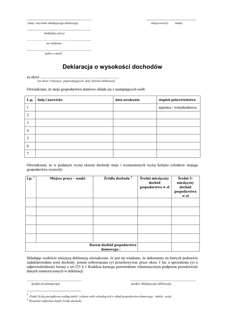 ............................................................ ............................................ (imię i nazwisko składającego deklarację) (miejscowość) (data) .................................................................... (dokładny adres) ……………………………........................ (nr telefonu) .................................................................... (adres e-mail) Deklaracja o wysokości dochodów za okres ................................................................................... (za okres 3 miesięcy poprzedzających datę złożenia deklaracji) Oświadczam, że moje gospodarstwo domowe składa się z następujących osób: L.p. Imię i nazwisko data urodzenia 1 stopień pokrewieństwa najemca / wnioskodawca 2 3 4 5 6 7 Oświadczam, że w podanym wyżej okresie dochody moje i wymienionych wyżej kolejno członków mojego gospodarstwa wynosiły: Lp. 1 Miejsce pracy – nauki Źródła dochodu 2 Średni miesięczny dochód gospodarstwa w zł Średni 3miesięczny dochód gospodarstwa w zł Razem dochód gospodarstwa domowego : Składając osobiście niniejszą deklarację oświadczam, że jest mi wiadomo, że dokumenty na których podstawie zadeklarowałam (em) dochody, jestem zobowiązana (y) przechowywać przez okres 3 lat, a uprzedzona (y) o odpowiedzialności karnej z art.233 § 1 Kodeksu karnego potwierdzam własnoręcznym podpisem prawdziwość danych zamieszczonych w deklaracji. .......................................................... (podpis przyjmującego) 1 2 ...................................................................... (podpis składającego deklarację) Podać liczbę porządkową według tabeli wykazu osób wchodzących w skład gospodarstwa domowego - tabela wyżej. Wymienić oddzielnie każde źródło dochodu. OBJAŚNIENIA Za dochód uważa się wszelkie przychody po odliczeniu kosztów ich uzyskania oraz po odliczeniu składek na ubezpieczenie emerytalne i rentowe oraz na ubezpieczenie chorobowe, określonych w przepisach o systemie ubezpieczeń społecznych, chyba że zostały już zaliczone do kosztów uzyskania przychodu. Do dochodu nie wlicza się świadczeń pomocy materialnej dla uczniów, dodatków dla sierot zupełnych, jednorazowych zapomóg z tytułu urodzenia się dziecka, dodatku z tytułu urodzenia dziecka, pomocy w zakresie dożywiania, zasiłków pielęgnacyjnych, zasiłków okresowych z pomocy społecznej, jednorazowych świadczeń pieniężnych i świadczeń w naturze z pomocy społecznej, dodatku mieszkaniowego oraz zapomogi pieniężnej, o której mowa w przepisach o zapomodze pieniężnej dla niektórych emerytów, rencistów i osób pobierających świadczenie przedemerytalne albo zasiłek przedemerytalny w 2007 r. Dochód z prowadzenia gospodarstwa rolnego ustala się na podstawie powierzchni gruntów w hektarach przeliczeniowych i przeciętnego dochodu z 1 hektara przeliczeniowego, ostatnio ogłaszanego przez Prezesa Głównego Urzędu Statystycznego, na podstawie art. 18 ustawy z dnia 15 listopada 1984 r. o podatku rolnym (Dz. U. z 1993 r. Nr 94, poz. 431, z późn. zm.). Przez gospodarstwo domowe rozumie się gospodarstwo jednoosobowe prowadzone przez jedną osobę, samodzielnie zajmującą lokal albo gospodarstwo wieloosobowe prowadzone przez osobę wspólnie z małżonkiem i innymi osobami stale z nią zamieszkującymi i gospodarującymi, które swoje prawa do zamieszkiwania w lokalu wywodzą z prawa tej osoby. Do deklaracji należy dołączyć oryginały zaświadczeń o dochodach.