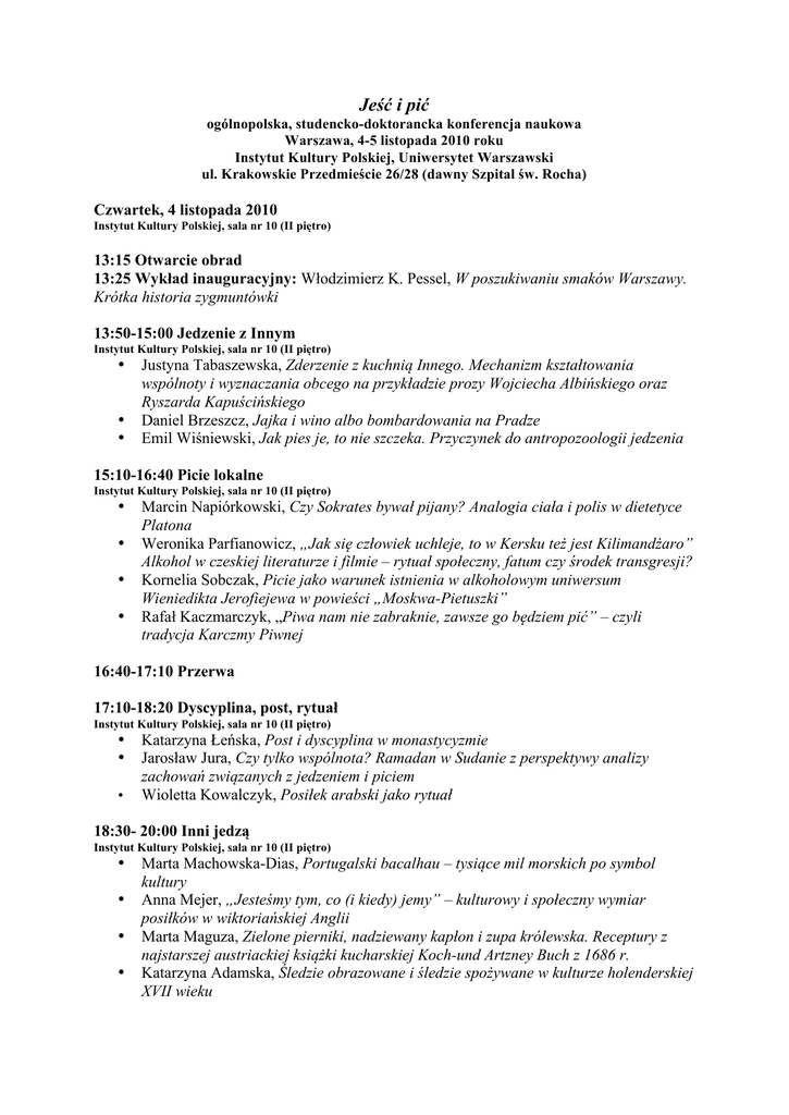 Jeść i pić ogólnopolska, studencko-doktorancka konferencja naukowa Warszawa, 4-5 listopada 2010 roku Instytut Kultury Polskiej, Uniwersytet Warszawski ul. Krakowskie Przedmieście 26/28 (dawny Szpital św. Rocha) Czwartek, 4 listopada 2010 Instytut Kultury Polskiej, sala nr 10 (II piętro) 13:15 Otwarcie obrad 13:25 Wykład inauguracyjny: Włodzimierz K. Pessel, W poszukiwaniu smaków Warszawy. Krótka historia zygmuntówki 13:50-15:00 Jedzenie z Innym Instytut Kultury Polskiej, sala nr 10 (II piętro) • • • Justyna Tabaszewska, Zderzenie z kuchnią Innego. Mechanizm kształtowania wspólnoty i wyznaczania obcego na przykładzie prozy Wojciecha Albińskiego oraz Ryszarda Kapuścińskiego Daniel Brzeszcz, Jajka i wino albo bombardowania na Pradze Emil Wiśniewski, Jak pies je, to nie szczeka. Przyczynek do antropozoologii jedzenia 15:10-16:40 Picie lokalne Instytut Kultury Polskiej, sala nr 10 (II piętro) • • • • Marcin Napiórkowski, Czy Sokrates bywał pijany? Analogia ciała i polis w dietetyce Platona Weronika Parfianowicz, „Jak się człowiek uchleje, to w Kersku też jest Kilimandżaro” Alkohol w czeskiej literaturze i filmie – rytuał społeczny, fatum czy środek transgresji? Kornelia Sobczak, Picie jako warunek istnienia w alkoholowym uniwersum Wieniedikta Jerofiejewa w powieści „Moskwa-Pietuszki” Rafał Kaczmarczyk, „Piwa nam nie zabraknie, zawsze go będziem pić” – czyli tradycja Karczmy Piwnej 16:40-17:10 Przerwa 17:10-18:20 Dyscyplina, post, rytuał Instytut Kultury Polskiej, sala nr 10 (II piętro) • • • Katarzyna Łeńska, Post i dyscyplina w monastycyzmie Jarosław Jura, Czy tylko wspólnota? Ramadan w Sudanie z perspektywy analizy zachowań związanych z jedzeniem i piciem Wioletta Kowalczyk, Posiłek arabski jako rytuał 18:30- 20:00 Inni jedzą Instytut Kultury Polskiej, sala nr 10 (II piętro) • • • • Marta Machowska-Dias, Portugalski bacalhau – tysiące mil morskich po symbol kultury Anna Mejer, „Jesteśmy tym, co (i kiedy) jemy” – kulturowy i społeczny wymiar posiłków w wiktoriańskiej Anglii Marta Maguza, Zielone pierniki, nadziewany kapłon i zupa królewska. Receptury z najstarszej austriackiej książki kucharskiej Koch-und Artzney Buch z 1686 r. Katarzyna Adamska, Śledzie obrazowane i śledzie spożywane w kulturze holenderskiej XVII wieku Piątek, 5 listopada 2010 9:00-10:30 Kuchnie polskie I Instytut Kultury Polskiej, sala nr 10 (II piętro) • • • Małgorzata Litwinowicz-Droździel, Juliusz Słowacki piecze babki, czyli antropologia ciasta Witold Zakrzewski, Żywienie w szkołach polskich na przełomie XVIII i XIX wieku Ariel Lisowski, „I ja tam z gośćmi byłem, miód i wino piłem” Opis kultury biesiadnej młodzieży z Łowicza i okolic w porównaniu z „Opisem obyczajów za panowania Augusta III” 9:00-10:30 Kuchnie polskie II Instytut Kultury Polskiej, sala nr 9 (I piętro) • • • • Zofia Boni, Kuchnia jako przestrzeń kształtująca i kształtowana przez relacje społeczne Martyna Nowicka, Obrazy jedzenia. O ilustracjach w polskich książkach kulinarnych wydanych po 1945 roku Anna Jaroszuk, 43 lata z „Kuchnią polską” Stanisława Bergera Filip Konopczyński, Sushi a sprawa polska 10:40-12:15 Jedzenie i sacrum Instytut Kultury Polskiej, sala nr 10 (II piętro) • • • • Michał Kocikowski, „Czy więc jecie, czy pijecie, czy cokolwiek czynicie, wszystko czyńcie na chwałę Boga” (1 Kor 10, 31). Jedzenie i sacrum w Nowym Testamencie Igor Piotrowski, Motet. Wprowadzenie do fenomenologii spożywania chrześcijańskiego Bogna Kosmulska, Grzegorz z Nyssy o ludzkich potrzebach – zagadnienie pokarmu cielesnego i duchowego Adam Trwoga, Protestanci przy stole. Filmy Carla Th. Dreyera a „Uczta Babette” 12:15-13:15 Przerwa obiadowa 13:15-14:50 Ciało spożywające Instytut Kultury Polskiej, sala nr 4 (parter) • Katarzyna Stańczak , Kulturoznawcze studium płci w kontekście kulinarnym • Maria Kobielska, Jedzenie, rozumienie, pisanie. O esejach Jolanty Brach-Czainy • Jakub Jakubaszek, „Usta pełne za jednym pociągnięciem.” Internetowa kultura oralna • Jacek Baranowski, Jak działa wirtualne jedzenie? O jedzeniu i piciu w sieciowych grach RPG (MMORPG) 15:00-17:10 Znaki jedzenia Instytut Kultury Polskiej, sala nr 4 (parter) • • • • Natalia Mętrak, Dieta średniowiecznego Europejczyka – „cywilizacja pszenicy” i „cywilizacja mięsa”; „cywilizacja piwa” i „cywilizacja wina” Hanna Kwiek, Kulturowe aspekty jedzenia mięsa. Konfrontacja zawartości ideowej reklamy wizualnej, filmu rysunkowego z literaturą i współczesną ikoną Olga Dawidowicz-Chymkowska, Od kanibalizmu do business lunchu. O funkcjach jedzenia w kreowaniu świata fantastycznego Barbara Maria Kownacka, Wykwintność i codzienność kulinariów w sztuce. Wybrane polskie przedstawienia • • Maciej Skowera, Rozumienie jedzenia w powieści Laury Esquivel „Przepiórki w płatkach róży” Bartłomiej Brach, Kavaria, czyli o kawiarni słów kilka 17:20-19:10 Wielkie żarcie Instytut Kultury Polskiej, sala nr 4 (parter) • Jan Borowicz, Po radosnej stronie życia – Coca-cola i kapitalizm • Iwona Ostrowska, „Delicatessen” – kanibalizm jako wizualne tabu i nadmiar • Anna Wójcik, Spożywanie orgiastyczne. Wywrotowy potencjał dekadenckich praktyk kulinarnych • Małgorzat Szubartowska, Do jedzenia, gotów, start! Zawody w jedzeniu – ludyczny charakter konsumpcji w konstruowaniu kapitalistycznej tożsamości zbiorowej • Gaweł Pasek, Jamie Oliver walczy z nawykami żywieniowymi w szkołach Wielkiej Brytanii, czyli cywilizacja zdrowia kontra kultura fast-food i konsumpcjonizm 19:15 Podsumowanie konferencji