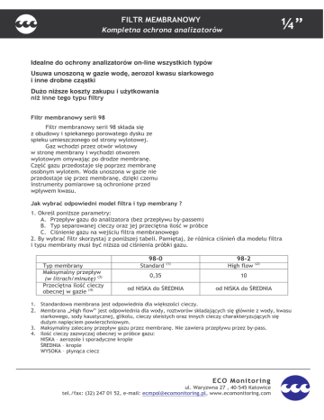 #$% & '& ( ) * + ,- Idealne do ochrony analizatorów on-line wszystkich typów Usuwa unoszon w gazie wod , aerozol kwasu siarkowego i inne drobne cz stki Du o ni sze koszty zakupu i u ytkowania % ! !& & , '" * '" * ! ' / 0 , ' -! !& ! ! 3 -45 $ " , ' & ! ! " , ' . '- " ' ! " ! "+ ! * ' 6* 8 : 3 : " 4 " 7' 9 "+ ; "' " 34 & 5 ! !& ' () '*+ , ' $ " $ , '* $ ,' . " 1 0 , ! .2 " , , ! ! & ' . '- " " ! !& , ' $ ! !& - , -* ! '2 0 " , " $ ! , . $ .4 '* ' . " ! ' & 5 7' & " "+ . ." ! !& 7' . & 9 ! , 4 " 1&* & " '' ! 45 " 1& $ - . 7 17 $ 4 <, ! ; "! !& ? *' ! " 9 & . = ! , " , , > $0 "+ 45 $ = , , ! !& ? !& F> $0 ' * $ ' , * , 7 ! "- ! " ? *' ! A 45 @ A= 8 H '" BCDE @ A8 H * " I=6 8 H "+ 2 , @ A= 8 , BCDE @ A8 . ' ," , G . ' ," , ' . $ * 0 ! " "+ $ " . & . " 1& , * " ! , , -*' 4 , ' 0 ! !& , @ A= 8 , BCDE @ A8 1 '*+ , .2 0 - @ " "+ 0 ' - $+1 0 * .2 " & " '' ! $ , * 0 '- $ !" # ! $" ! ' ? !& ! * '* " . .! .' ! .2 ! ? +! ! & , $ . ' ," . C ! .4 ? ? *' ! ? *' ! ? *' ! .4 +* ' ! ' '* /0 /1 /2 '" , * 4 ' & , " ! '*+ , $ ' &' . H $ = L 4 !" " "+ ? !& ; " .2 E -* & " '' * . 6& , 6 $ ? !& ! $ / " +2 ? !& ? !& ; " " * " ! ! & " "+ ! ! !& ) ! ! !& ! " & > $0 % " .2 * ! * , K ' , , : D9E ? " . K( & $ M3 K , , $ ' . J G :=9; = , , > $0 % ! !& = "+ " "+ - " ! - *$ '" , * 4 " !" ! , !" # M3 ! $" ! $ ! '