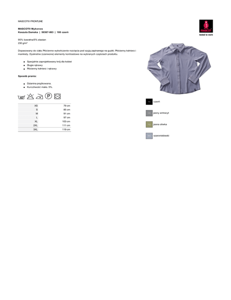 MASCOT® FRONTLINE MASCOT® Mykonos Koszula Damska | 50367-863 | 180 czerń 95% bawełna/5% elastan 230 g/m² Dopasowany do ciała. Płócienne wykończenie rozcięcia pod szyją zapinanego na guziki. Płócienny kołnierz i mankiety. Dyskretne (czerwone) elementy kontrastowe na wybranych częściach produktu. l Specjalnie zaprojektowany krój dla kobiet l Długie rękawy l Płócienny kołnierz i rękawy Sposób prania: l Dzianina prążkowana. l Kurczliwość maks. 5%. czerń XS 79 cm S 85 cm M 91 cm L 97 cm XL 103 cm 2XL 111 cm 3XL 119 cm jasny antracyt jasna oliwka szaroniebieski