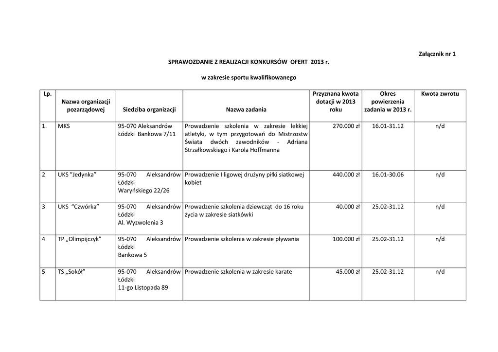 Załącznik nr 1 SPRAWOZDANIE Z REALIZACJI KONKURSÓW OFERT 2013 r. w zakresie sportu kwalifikowanego Lp. Nazwa organizacji pozarządowej Siedziba organizacji 1. MKS 95-070 Aleksandrów Łódzki Bankowa 7/11 2 UKS ”Jedynka” 3 Nazwa zadania Prowadzenie szkolenia w zakresie lekkiej atletyki, w tym przygotowań do Mistrzostw Świata dwóch zawodników - Adriana Strzałkowskiego i Karola Hoffmanna Przyznana kwota Okres dotacji w 2013 powierzenia roku zadania w 2013 r. Kwota zwrotu 270.000 zł 16.01-31.12 n/d 95-070 Aleksandrów Prowadzenie I ligowej drużyny piłki siatkowej Łódzki kobiet Waryńskiego 22/26 440.000 zł 16.01-30.06 n/d UKS “Czwórka” 95-070 Aleksandrów Prowadzenie szkolenia dziewcząt do 16 roku Łódzki życia w zakresie siatkówki Al. Wyzwolenia 3 40.000 zł 25.02-31.12 n/d 4 TP „Olimpijczyk” 95-070 Aleksandrów Prowadzenie szkolenia w zakresie pływania Łódzki Bankowa 5 100.000 zł 25.02-31.12 n/d 5 TS „Sokół” 95-070 Aleksandrów Prowadzenie szkolenia w zakresie karate Łódzki 11-go Listopada 89 45.000 zł 25.02-31.12 n/d 6 TS „Sokół” 95-070 Aleksandrów Łódzki 11-go Listopada 89 95-070 Aleksandrów Łódzki 11-go Listopada 89 Prowadzenie szkolenia drużyn seniorskich w tym III ligowej drużyny piłki nożnej 200.000 zł 16.01-30.06 n/d 7 TS „Sokół” 200.000 zł 125.000 zł 30.07-31.12 25.02-31.12 n/d 8 UKS przy MG 95-070 Aleksandrów Prowadzenie szkolenia dziewcząt w zakresie Łódzki piłki koszykowej, w tym I ligowej drużyny Waryńskiego 22/26 240.000 zł 16.01-30.06 n/d 9 UKS przy MG 95-070 Aleksandrów Prowadzenie szkolenia chłopców w grupach Łódzki wiekowych do 16 roku życia w zakresie piłki Waryńskiego 22/26 siatkowej 200.000 zł 20.000 zł 30.07-31.12 25.02-31.12 n/d 10 LKS ”Orlik” Sobień Prowadzenie szkolenia w zakresie piłki nożnej we wsi Sobień 10.000 zł 25.02-31.12 n/d Razem 1,890.000 Prowadzenie szkolenia dzieci i młodzieży w zakresie piłki nożnej, w tym szkółki Fundacji Realu Madryt - Załącznik nr 2 SPRAWOZDANIE Z REALIZACJI KONKURSÓW OFERT W ROKU 2013 r. W zakresie ochrony kultury, tradycji narodowej, pielęgnowania polskości ogłoszono i rozstrzygnięto następujące konkursy ofert: ( pożytek publiczny i wolontariat ) Lp. Nazwa organizacji pozarządowej Siedziba organizacji 1. Towarzystwo Śpiewacze im. Stanisława Moniuszki Regionalny Związek Rolników, Kółek i Organizacji Rolniczych 95-070 Upowszechnianie muzyki chóralnej o Aleksandrów Łódzki tematyce świeckiej ul. Ogrodowa 10 90-130 Łódź ul. Narutowicza 59 2. 3. 4. Nazwa zadania Prowadzenie zespołu ludowego „Aleksandrowianie” Towarzystwo 95-070 Upowszechnianie muzyki chóralnej o Śpiewacze „Lutnia” Aleksandrów Łódzki tematyce sakralnej ul. Ogrodowa 17 Ochotnicza Straż Pożarna w Aleksandrowie Łódzkim 95-070 Prowadzenie Orkiestry Dętej oraz zespołu Aleksandrów Łódzki mażoretek na terenie Gminy Aleksandrów ul. 11-go Listopada Łódzki 9 Przyznana kwota dotacji w 2013 roku Okres powierzenia zadania w 2013 r. Rozliczenie dotacji, ewentualna kwota do zwrotu 10.000 zł 10.05-31.12 n/d 14.000 zł 10.05-31.12 n/d 10.000 zł 10.05-31.12 n/d 40.000 zł 10.05-31.12 n/d 5. 6. 7. Yacht Club „Dal” 95-070 Aleksandrów Łódzki ul. Łęczycka 1 AKS „RAJ” 95-070 Aleksandrów Łódzki ul. M.Skłodowskiej -Curie Konkurs nierozstrzygnięty Organizacja szkolenia i rejsów żeglarskich dla młodzieży z terenu Gminy Aleksandrów Łódzki 15.000 zł 10.05-31.12 n/d Działania na rzecz kształtowania postaw abstynenckich i trzeźw ościowych wśród mieszkańców Gminy Aleksandrów Łódzki 60.000 zł 10.04-31.12 n/d n/d n/d Organizacja wypoczynku i czasu wolnego dla dzieci z terenu Gminy Aleksandrów Łódzki razem n/d 149.000 zł