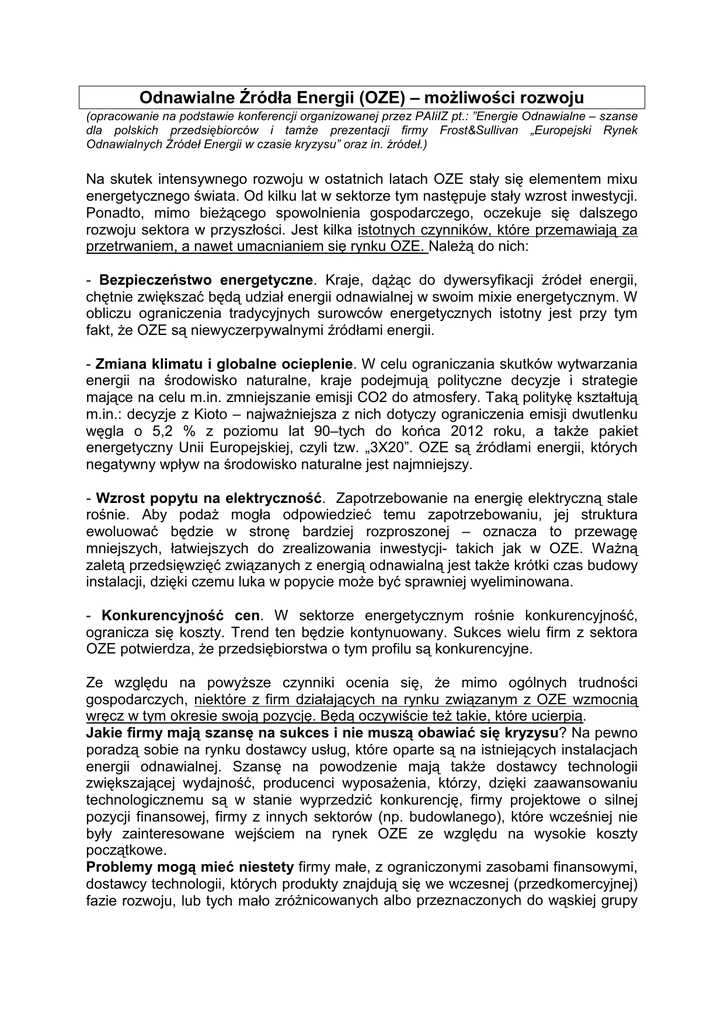 Odnawialne Źródła Energii (OZE) – moŜliwości rozwoju (opracowanie na podstawie konferencji organizowanej przez PAIiIZ pt.: ”Energie Odnawialne – szanse dla polskich przedsiębiorców i tamŜe prezentacji firmy Frost&Sullivan „Europejski Rynek Odnawialnych Źródeł Energii w czasie kryzysu” oraz in. źródeł.) Na skutek intensywnego rozwoju w ostatnich latach OZE stały się elementem mixu energetycznego świata. Od kilku lat w sektorze tym następuje stały wzrost inwestycji. Ponadto, mimo bieŜącego spowolnienia gospodarczego, oczekuje się dalszego rozwoju sektora w przyszłości. Jest kilka istotnych czynników, które przemawiają za przetrwaniem, a nawet umacnianiem się rynku OZE. NaleŜą do nich: - Bezpieczeństwo energetyczne. Kraje, dąŜąc do dywersyfikacji źródeł energii, chętnie zwiększać będą udział energii odnawialnej w swoim mixie energetycznym. W obliczu ograniczenia tradycyjnych surowców energetycznych istotny jest przy tym fakt, Ŝe OZE są niewyczerpywalnymi źródłami energii. - Zmiana klimatu i globalne ocieplenie. W celu ograniczania skutków wytwarzania energii na środowisko naturalne, kraje podejmują polityczne decyzje i strategie mające na celu m.in. zmniejszanie emisji CO2 do atmosfery. Taką politykę kształtują m.in.: decyzje z Kioto – najwaŜniejsza z nich dotyczy ograniczenia emisji dwutlenku węgla o 5,2 % z poziomu lat 90–tych do końca 2012 roku, a takŜe pakiet energetyczny Unii Europejskiej, czyli tzw. „3X20”. OZE są źródłami energii, których negatywny wpływ na środowisko naturalne jest najmniejszy. - Wzrost popytu na elektryczność. Zapotrzebowanie na energię elektryczną stale rośnie. Aby podaŜ mogła odpowiedzieć temu zapotrzebowaniu, jej struktura ewoluować będzie w stronę bardziej rozproszonej – oznacza to przewagę mniejszych, łatwiejszych do zrealizowania inwestycji- takich jak w OZE. WaŜną zaletą przedsięwzięć związanych z energią odnawialną jest takŜe krótki czas budowy instalacji, dzięki czemu luka w popycie moŜe być sprawniej wyeliminowana. - Konkurencyjność cen. W sektorze energetycznym rośnie konkurencyjność, ogranicza się koszty. Trend ten będzie kontynuowany. Sukces wielu firm z sektora OZE potwierdza, Ŝe przedsiębiorstwa o tym profilu są konkurencyjne. Ze względu na powyŜsze czynniki ocenia się, Ŝe mimo ogólnych trudności gospodarczych, niektóre z firm działających na rynku związanym z OZE wzmocnią wręcz w tym okresie swoją pozycję. Będą oczywiście teŜ takie, które ucierpią. Jakie firmy mają szansę na sukces i nie muszą obawiać się kryzysu? Na pewno poradzą sobie na rynku dostawcy usług, które oparte są na istniejących instalacjach energii odnawialnej. Szansę na powodzenie mają takŜe dostawcy technologii zwiększającej wydajność, producenci wyposaŜenia, którzy, dzięki zaawansowaniu technologicznemu są w stanie wyprzedzić konkurencję, firmy projektowe o silnej pozycji finansowej, firmy z innych sektorów (np. budowlanego), które wcześniej nie były zainteresowane wejściem na rynek OZE ze względu na wysokie koszty początkowe. Problemy mogą mieć niestety firmy małe, z ograniczonymi zasobami finansowymi, dostawcy technologii, których produkty znajdują się we wczesnej (przedkomercyjnej) fazie rozwoju, lub tych mało zróŜnicowanych albo przeznaczonych do wąskiej grupy odbiorców. Z rynku wyeliminowani mogą zostać takŜe dostawcy produktów o małej konkurencyjności cenowej, i nowi dostawcy surowców z wysokimi kosztami produkcji. Jak ocenia się potencjał Polski w zakresie rozwoju rynku OZE? Kraj nasz, wraz z krajami takimi jak Czechy, kraje nadbałtyckie, Grecja moŜna zaliczyć do rynków rozwijających się w OZE. Oznacza to, iŜ firmy, koncerny i specjaliści zajmujący się OZE stale obserwują przemiany prawne i administracyjne zachodzące w tych krajach, są gotowi na wykorzystanie nowych moŜliwości i juŜ teraz dokonują fuzji i przejęć, jeśli oczekują, Ŝe dana inwestycja przyniesie im stały dochód. Polska ma kilka mocnych stron jeśli chodzi o moŜliwości wykorzystania OZE, które powinna wykorzystać. Dotyczą one przede wszystkim wiatru i biomasy. 1. Energetyka wiatrowa Część z wspomnianych moŜliwości rozwoju OZE w Polsce wynika z posiadanego przez nasz kraj pewnego potencjału rozwoju energetyki wiatrowej. Ogólnie rzecz biorąc, Polska jest krajem średnio zasobnym w energię wiatru (zwłaszcza w porównaniu do krajów takich jak Dania, Szwecja, Francja, Wielka Brytania, Hiszpania, Holandia) Najlepsze warunki wiatrowe panują na północnych krańcach Polski, dobre są teŜ na Nizinie Mazowieckiej, w centralnej Wielkopolsce, w Beskidzie Śląskim i śywieckim, w Bieszczadach, na Pogórzu Dynowskim i we wschodniej części Doliny Sandomierskiej (patrz Rysunek 1). Wykorzystując potencjał wiatru w Polsce, moŜna by pokryć 17 % krajowego zapotrzebowania na energię elektryczną. Tymczasem, zgodnie z danymi przedstawianymi przez Polskie Stowarzyszenie Energetyki Wiatrowej, mimo iŜ produkcja energii z wiatru stale rośnie, udział generacji w krajowym zuŜyciu energii jest na razie niewielki i wynosi zaledwie 1,6 %. Moc obecnie zainstalowanych mocy w energetyce wiatrowej wynosi przy tym ok. 451 MW. Elektrownie wiatrowe zlokalizowane są głównie na północy i na południu kraju (patrz Rysunek 2). Rys 1 i 2, źródło: www.biomasa.org Wykorzystaniu potencjału w dziedzinie energetyki wiatrowej sprzyja fakt, iŜ polityka państwa nakierowana jest na rozwój energetyki wiatrowej: plany rządu do 2010 roku zakładają wzrost mocy zainstalowanej do 2000 MW i zwiększenie udziału energii z wiatru w zuŜyciu finalnym do 2,3 %. 2. Energia z biomasy Oprócz wiatru, źródłem energii odnawialnej o duŜym potencjale jest w Polsce biomasa. Potencjał ten wynika m.in. z faktu istnienia w Polsce duŜej ilości gruntów ornych, które są odpowiednie do uprawy roślin energetycznych, a