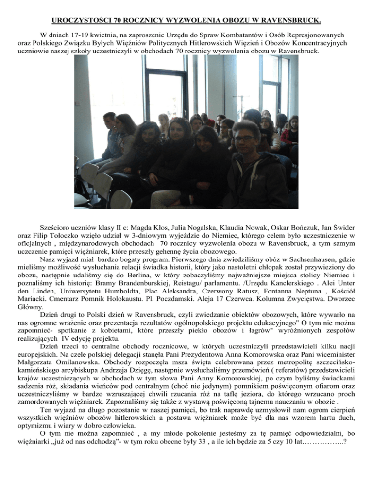 UROCZYSTOŚCI 70 ROCZNICY WYZWOLENIA OBOZU W RAVENSBRUCK. W dniach 17-19 kwietnia, na zaproszenie Urzędu do Spraw Kombatantów i Osób Represjonowanych oraz Polskiego Związku Byłych Więźniów Politycznych Hitlerowskich Więzień i Obozów Koncentracyjnych uczniowie naszej szkoły uczestniczyli w obchodach 70 rocznicy wyzwolenia obozu w Ravensbruck. Sześcioro uczniów klasy II c: Magda Kłos, Julia Nogalska, Klaudia Nowak, Oskar Bończuk, Jan Świder oraz Filip Tołoczko wzięło udział w 3-dniowym wyjeździe do Niemiec, którego celem było uczestniczenie w oficjalnych , międzynarodowych obchodach 70 rocznicy wyzwolenia obozu w Ravensbruck, a tym samym uczczenie pamięci więźniarek, które przeszły gehennę życia obozowego. Nasz wyjazd miał bardzo bogaty program. Pierwszego dnia zwiedziliśmy obóz w Sachsenhausen, gdzie mieliśmy możliwość wysłuchania relacji świadka historii, który jako nastoletni chłopak został przywieziony do obozu, następnie udaliśmy się do Berlina, w który zobaczyliśmy najważniejsze miejsca stolicy Niemiec i poznaliśmy ich historię: Bramy Brandenburskiej, Reistagu/ parlamentu. /Urzędu Kanclerskiego . Alei Unter den Linden, Uniwersytetu Humboldta, Plac Aleksandra, Czerwony Ratusz, Fontanna Neptuna , Kościół Mariacki. Cmentarz Pomnik Holokaustu. Pl. Poczdamski. Aleja 17 Czerwca. Kolumna Zwycięstwa. Dworzec Główny. Dzień drugi to Polski dzień w Ravensbruck, czyli zwiedzanie obiektów obozowych, które wywarło na nas ogromne wrażenie oraz prezentacja rezultatów ogólnopolskiego projektu edukacyjnego" O tym nie można zapomnieć- spotkanie z kobietami, które przeszły piekło obozów i łagrów" wyróżnionych zespołów realizujących IV edycję projektu. Dzień trzeci to centralne obchody rocznicowe, w których uczestniczyli przedstawicieli kilku nacji europejskich. Na czele polskiej delegacji stanęła Pani Prezydentowa Anna Komorowska oraz Pani wiceminister Małgorzata Omilanowska. Obchody rozpoczęła msza święta celebrowana przez metropolitę szczecińskokamieńskiego arcybiskupa Andrzeja Dzięgę, następnie wysłuchaliśmy przemówień ( referatów) przedstawicieli krajów uczestniczących w obchodach w tym słowa Pani Anny Komorowskiej, po czym byliśmy świadkami sadzenia róż, składania wieńców pod centralnym (choć nie jedynym) pomnikiem poświęconym ofiarom oraz uczestniczyliśmy w bardzo wzruszającej chwili rzucania róż na taflę jeziora, do którego wrzucano proch zamordowanych więźniarek. Zapoznaliśmy się także z wystawą poświęconą tajnemu nauczaniu w obozie . Ten wyjazd na długo pozostanie w naszej pamięci, bo trak naprawdę uzmysłowił nam ogrom cierpień wszystkich więźniów obozów hitlerowskich a postawa więźniarek może być dla nas wzorem hartu duch, optymizmu i wiary w dobro człowieka. O tym nie można zapomnieć , a my młode pokolenie jesteśmy za tę pamięć odpowiedzialni, bo więźniarki „już od nas odchodzą”- w tym roku obecne były 33 , a ile ich będzie za 5 czy 10 lat……………..?