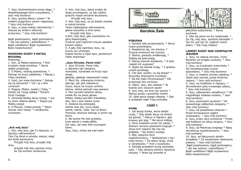 7. Jezu, bluźnierstwami przez złego, * Współwiszącego łotra wyszydzany, * Jezu mój kochany! 8. Jezu, gorzką Ŝółcią i octem * W wielkim pragnieniu swoim napawany, * Jezu mój kochany! 9. Jezu, w swej miłości niezmiernej * Jeszcze po śmierci włócznią przeorany, * Jezu mój kochany! Bądź pozdrowiony, bądź pochwalony, * dla nas zelŜony i pohańbiony! * Bądź uwielbiony! Bądź wysławiony! BoŜe nieskończony! ROZMOWA DUSZY Z MATKĄ BOLESNĄ Posłuchaj... 1. Ach, Ja Matka boleściwa, * Pod krzyŜem stoję smutliwa, * Serce Ŝałość przejmuje. 2. O Matko, niechaj prawdziwie, * Patrząc na krzyŜ Ŝałośliwie, * Płaczę z Tobą rzewliwie. 3. JuŜci, juŜ moje Kochanie * Gotuje się na skonanie! * Toć i ja z Nim umieram! 4. Pragnę, Matko, zostać z Tobą, * Dzielić się Twoją Ŝałobą * Śmierci Syna Twojego. 5. Zamknął słodką Jezus mowę, * JuŜ ku ziemi skłania głowę, * śegna juŜ Matkę swoją! 6. O Maryjo, Ciebie proszę, * Niech Jezusa rany noszę * I serdecznie rozwaŜam.. „Ach mój Jezu” 1. Ach, mój Jezu, jak Ty klęczysz, w Ogrójcu zakrwawiony! Tam Cię Anioł w smutku cieszył, skąd był świat pocieszony. Przyjdź mój Jezu, przyjdź mój Jezu, przyjdź mój Jezu pociesz mnie, bo Cię kocham serdecznie. 4 2. Ach, mój Jezu, jakeś srodze do słupa przywiązany, za tak cięŜkie grzechy nasze okrutnie biczowany. Przyjdź mój Jezu... 3. Ach, mój Jezu, co za boleść cierpisz w ostrej koronie. Twarz najświętsza zakrwawiona, głowa wszystka w krwi tonie. Przyjdź mój Jezu... 4.Ach, mój Jezu, gdy wychodzisz na górę Kalwaryjską, trzykroć pod cięŜarem krzyŜa upadasz bardzo cięŜko. 5. A gdy mój najmilszy Jezu, na krzyŜu juŜ umierasz. Dajesz ducha w Ojca ręce, grzesznym niebo otwierasz! „Jezu Chryste, Panie miły” 1. Jezu Chryste, Panie miły, o, Baranku tak cierpliwy, wzniosłeś, wzniosłeś na krzyŜ ręce swoje, gładząc, gładząc nieprawości moje. 2. Płacz Go, człowiecze mizerny, patrząc, jak jest miłosierny. Jezus, Jezus na krzyŜu umiera, słońce, słońce jasność swą zawiera. 3. Pan wyrzekł ostatnie słowa, zwisła Mu na piersi głowa; Matka, Matka pod Nim frasobliwa stoi, stoi z Ŝalu ledwie Ŝywa. 4. Zasłona się potargała, ziemia rwie się, ryczy skała, setnik, setnik, woła: Syn to BoŜy! Tłuszcza, tłuszcza wierząc w proch się korzy. 5. Na koniec Mu bok przebito, krew płynie z wodą obfito. śal nasz, Ŝal nasz dziś wyznajem łzami, Jezu, Jezu, zmiłuj się nad nami. Gorzkie śale POBUDKA 1. Gorzkie Ŝale przybywajcie, * Serca nasze przenikajcie, 2. Rozpłyńcie się, me źrenice, * Toczcie smutnych łez krynice. 3. Słońce, gwiazdy omdlewają, * śałobą się pokrywają. 4. Płaczą rzewnie Aniołowie, * A któŜ -Ŝałość ich wypowie? 5. Opoki się twarde krają, * Z grobów umarli powstają. 6. CóŜ jest, pytam, co się dzieje? * Wszystko stworzenie truchleje! 7. Na ból męki Chrystusowej * śal przejmuje bez wymowy. 8. Uderz, Jezu, bez odwłoki * W twarde serc naszych opoki! 9. Jezu mój, we krwi ran swoich * Obmyj duszę z grzechów moich! 10. Upał serca swego chłodzę, * Gdy w przepaść męki Twej wchodzę. CZĘŚĆ I HYMN 1. śal duszę ściska, serce boleść czuje, * Gdy słodki Jezus na śmierć się gotuje, * Klęczy w Ogrojcu, gdy krwawy pot leje, * Me serce mdleje. 2. Pana świętości uczeń zły całuje, * śołnierz okrutny powrózmi krępuje! * Jezus tym więzom dla nas się poddaje, * Na śmierć wydaje. 3. Bije, popycha tłum nieposkromiony, * Nielitościwie z tej i owej strony, * Za włosy targa, znosi w cierpliwości, * Król z wysokości. 4. Zsiniałe przedtem krwią zachodzą usta, * Gdy zbrojną Ŝołnierz rękawicą chlusta; * Wnet się zmieniło w płaczliwe wzdychanie, * Serca kochanie. 5. Oby się serce we łzy rozpływało, * śe Cię, mój Jezu, sprośnie obraŜało! * śal mi, ach Ŝal mi, cięŜkich moich złości, * Dla Twej miłości! LAMENT DUSZY NAD CIERPIĄCYM JEZUSEM 1. Jezu, na zabicie okrutne, Cichy Baranku od wrogów szukany, * Jezu mój kochany! 2. Jezu, za trzydzieści srebrników * Od niewdzięcznego ucznia zaprzedany, * Jezu mój kochany! 3. Jezu, w cięŜkim smutku Ŝałością, * Jakoś sam wyznał, przed śmiercią nękany, * Jezu mój kochany! 4. Jezu, na modlitwie w Ogrojcu, * Strumieniem potu krwawego zalany, * Jezu mój kochany! 5. Jezu, całowaniem zdradliwym * Od niegodnego Judasza wydany, * Jezu mój kochany! 6. Jezu, powrozami grubymi * Od swawolnego Ŝołdactwa związany, * Jezu mój kochany! 7. Jezu, od pospólstwa zelŜywie * Przed Annaszowym sądem zniewaŜany, * Jezu mój kochany! 8. Jezu, przez ulice sromotnie * Przed sąd Kajfasza za włosy targany, * Jezu mój kochany! 9. Jezu, od Malchusa srogiego * Ręką zbrodniczą wypoliczkowany, * Jezu mój kochany! 10. Jezu, od fałszywych dwóch świadków * Za zwodziciela niesłusznie podany, * Jezu mój kochany! Bądź pozdrowiony, bądź pochwalony, * dla nas zelŜony i pohańbiony! * Bądź uwielbiony! Bądź wysławiony! BoŜe nieskończony! 1 ROZMOWA DUSZY Z MATKĄ BOLESNĄ 1. Ach! Ja matka tak Ŝałosna! * Boleść mnie ściska nieznośna * Miecz me serce przenika. 2. Czemuś Matko ukochana, * CięŜko na sercu stroskana? * Czemu wszystka truchlejesz? 3. Co mnie pytasz, wszystkam w mdłości, * Mówić nie mogę z Ŝałości, * Krew mi serce zalewa. 4. Powiedz mi, o Panno moja, * Czemu blednieje twarz Twoja? * Czemu gorzkie łzy lejesz? 5. Widzę, Ŝe Syn ukochany, * W Ogrojcu cały zalany * Potu krwawym potokiem. 6. O Matko, źródło miłości, * Niech czuję gwałt Twej Ŝałości! * Dozwól mi z sobą płakać! CZĘŚĆ II POBUDKA 1. Gorzkie Ŝale przybywajcie, * Serca nasze przenikajcie, 2. Rozpłyńcie się, me źrenice, * Toczcie smutnych łez krynice. 3. Słońce, gwiazdy omdlewają, * śałobą się pokrywają. 4. Płaczą rzewnie Aniołowie, * A któŜ -Ŝałość ich wypowie? 5. Opoki się twarde krają, * Z grobów umarli powstają. 6. CóŜ jest, pytam, co si