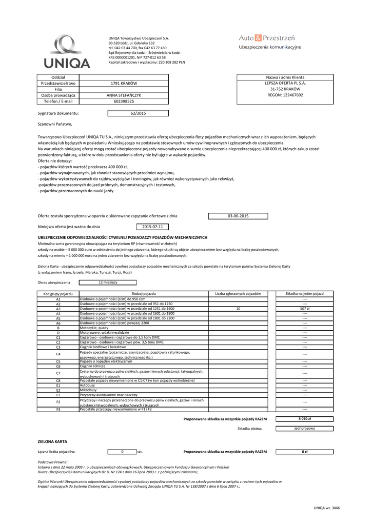 UNIQA Towarzystwo Ubezpieczeń S.A. 90-520 Łódź, ul. Gdańska 132 tel. 042 63 44 700, fax 042 63 77 430 Sąd Rejonowy dla Łodzi - Śródmieścia w Łodzi KRS 0000001201, NIP 727-012 63 58 Kapitał zakładowy i wypłacony: 220 308 282 PLN Oddział Przedstawicielstwo Filia Osoba prowadząca Telefon / E-mail Nazwa i adres Klienta LEPSZA OFERTA PL S.A. 31-752 KRAKÓW REGON: 122467692 1791 KRAKÓW ANNA STEFAŃCZYK 602398525 Sygnatura dokumentu: 62/2015 Szanowni Państwo, Towarzystwo Ubezpieczeń UNIQA TU S.A., niniejszym przedstawia ofertę ubezpieczenia floty pojazdów mechanicznych wraz z ich wyposażeniem, będących własnością lub będących w posiadaniu Wnioskującego na podstawie stosownych umów cywilnoprawnych i zgłoszonych do ubezpieczenia. Na warunkach niniejszej oferty mogą zostać ubezpieczone pojazdy nowonabywane o sumie ubezpieczenia nieprzekraczającej 400 000 zł, których zakup został potwierdzony fakturą, a które w dniu przedstawienia oferty nie był ujęte w wykazie pojazdów. Oferta nie dotyczy: - pojazdów których wartość przekracza 400 000 zł, - pojazdów wynajmowanych, jak również stanowiących przedmiot wynajmu, - pojazdów wykorzystywanych do rajdów,wyścigów i treningów, jak również wykorzystywanych jako rekwizyt, -pojazdów przeznaczonych do jazd próbnych, demonstracyjnych i testowych, - pojazdów przeznaczonych do nauki jazdy. Oferta została sporządzona w oparciu o skierowane zapytanie ofertowe z dnia Niniejsza oferta jest ważna do dnia 03-06-2015 2015-07-11 UBEZPIECZENIE ODPOWIEDZIALNOŚCI CYWILNEJ POSIADACZY POJAZDÓW MECHANICZNYCH Minimalna suma gwarancyjna obowiązująca na terytorium RP (równowartość w złotych) szkody na osobie – 5 000 000 euro w odniesieniu do jednego zdarzenia, którego skutki są objęte ubezpieczeniem bez względu na liczbę poszkodowanych, szkody na mieniu – 1 000 000 euro na jedno zdarzenie bez względu na liczbę poszkodowanych. Zielona Karta - ubezpieczenie odpowiedzialności cywilnej posiadaczy pojazdów mechanicznych za szkody powstałe na terytorium państw Systemu Zielonej Karty (z wyłączeniem Iranu, Izraela, Maroka, Tunezji, Turcji, Rosji) Okres ubezpieczenia Kod grupy pojazdu A1 A2 A3 A4 A5 A6 B D C1 C2 C3 C4 C5 C6 C7 C8 E1 E2 F1 F2 F3 12 miesięcy Rodzaj pojazdu Osobowe o pojemności (ccm) do 950 ccm Osobowe o pojemności (ccm) w przedziale od 951 do 1250 Osobowe o pojemności (ccm) w przedziale od 1251 do 1600 Osobowe o pojemności (ccm) w przedziale od 1601 do 1800 Osobowe o pojemności (ccm) w przedziale od 1801 do 2200 Osobowe o pojemności (ccm) powyżej 2200 Motocykle, quady Motorowery, wózki inwalidzkie Ciężarowo - osobowe i ciężarowe do 3,5 tony DMC Ciężarowo - osobowe i ciężarowe pow. 3,5 tony DMC Ciągniki siodłowe i balastowe Pojazdy specjalne (pożarnicze, asenizacyjne, pogotowia ratunkowego, gazowego, energetycznego, technicznego itp.) Pojazdy o napędzie elektrycznym Ciągniki rolnicze Cysterny do przewozu paliw ciekłych, gazów i innych substancji, łatwopalnych, wybuchowych i trujących Pozostałe pojazdy niewymienione w C1-C7 (w tym pojazdy wolnobieżne) Autobusy Mikrobusy Przyczepy autobusowe oraz naczepy Przyczepy i naczepy przeznaczone do przewozu paliw ciekłych, gazów i innych substancji łatwopalnych, wybuchowych i trujących Pozostałe przyczepy niewymienione w F1 i F2 Liczba zgłoszonych pojazdów 10 Składka na jeden pojazd ------507 zł ------------------------------------------------------- Proponowana składka za wszystkie pojazdy RAZEM Składka płatna: 5 070 zł jednorazowo ZIELONA KARTA Łączna liczba pojazdów: 0 szt. Proponowana składka za wszystkie pojazdy RAZEM 0 zł Podstawa Prawna: Ustawa z dnia 22 maja 2003 r. o ubezpieczeniach obowiązkowych, Ubezpieczeniowym Funduszu Gwarancyjnym i Polskim Biurze Ubezpieczycieli Komunikacyjnych Dz.U. Nr 124 z dnia 16 lipca 2003 r. z późniejszymi zmianami; Ogólne Warunki Ubezpieczenia odpowiedzialności cywilnej posiadaczy pojazdów mechanicznych za szkody powstałe w związku z ruchem tych pojazdów w krajach należących do Systemu Zielonej Karty, zatwierdzone Uchwałą Zarządu UNIQA TU S.A. Nr 138/2007 z dnia 6 lipca 2007 r.; UNIQA wz. 3446 UBEZPIECZENIE MINI ASSISTANCE Łączna liczba pojazdów: 10 szt. Podstawa Prawna: Ogólne Warunki Ubezpieczenia Mini Assistance Auto PLUS24service zatwierdzonych Uchwałą Zarządu UNIQA TU S.A. Nr 95/2012 z dnia 23 maja 2012 r. UBEZPIECZENIE AUTO CASCO 12 miesięcy Okres ubezpieczenia Łączna liczba pojazdów 0 10 Łączna Suma Ubezpieczenia w zł 0 zł 189 000 zł Zakres ubezpieczenia Ograniczony Pełny Zakres terytorialny Rzeczypospolita Polska i inne państwa położone w Europie, z zastrzeżeniem § 5 ust. 2 OWU Auto Casco Rozszerzenie zakresu pełnego na terytorium Rosji, Białorusi, Ukrainy NIE Franszyza integralna Zgodna z § 3 ust. 1 OWU Auto Casco Udział własny Zniesiony Zniesienie Potrącenia amortyzacji części do wymiany TAK Zniesienie Pomniejszenia sumy ubezpieczenia po wypłacie odszkodowania NIE Kod grupy pojazdu Rodzaj pojazdu Liczba zgłoszonych pojazdów Suma Ubezpieczenia stopa składki [%] Oferowana składka 10 189 000 zł 3,3% 6 864 zł AA Osobowe marek: Citroen, Chevrolet, Dacia, Daewoo, Fiat, FSM, FSO, Ford, Hyundai, KIA, Łada, Opel, Peugeot, Renault, Seat, Skoda, Toyota, VW (Golf, Bora, Jetta, Lupo, Polo, Fox) AB Osobowe marek: Alfa Romeo, Daihatsu, Honda, Lancia, Mazda, Nissan, Rover, Subaru, Suzuki, Volvo, VW (modele niewymienione w klasie AA) ---- AC Osobowe pozostałych marek ---- B D C1 C2 C3 Motocykle, quady Motorowery, wózki inwalidzkie Ciężarowo - osobowe i ciężarowe do 3,5 tony DMC Ciężarowo - osobowe i ciężarowe pow. 3,5 tony DMC Ciągniki siodłowe i balastowe Pojazdy specjalne (pożarnicze, asenizacyjne, pogotowia ratunkowego, gazowego, energetycznego, technicznego itp.) Pojazdy o napędzie elektrycznym Ciągniki rolnicze Cysterny do przewozu paliw ciekłych, gazów i innych substancji, łatwopalnych, wybuchowych