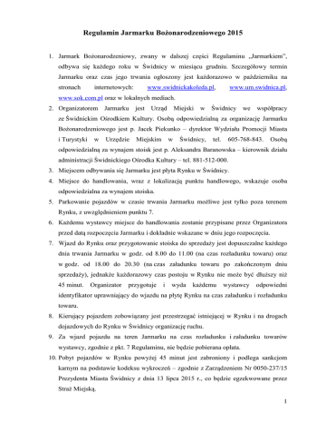 Regulamin Jarmarku Bożonarodzeniowego 2015 1. Jarmark Bożonarodzeniowy, zwany w dalszej części Regulaminu „Jarmarkiem”, odbywa się każdego roku w Świdnicy w miesiącu grudniu. Szczegółowy termin Jarmarku oraz czas jego trwania ogłoszony jest każdorazowo w październiku na stronach internetowych: www.swidnickakoleda.pl, www.um.swidnica.pl, www.sok.com.pl oraz w lokalnych mediach. 2. Organizatorem Jarmarku jest Urząd Miejski w Świdnicy we współpracy ze Świdnickim Ośrodkiem Kultury. Osobą odpowiedzialną za organizację Jarmarku Bożonarodzeniowego jest p. Jacek Piekunko – dyrektor Wydziału Promocji Miasta i Turystyki w Urzędzie Miejskim w Świdnicy, tel. 605-768-843. Osobą odpowiedzialną za wynajem stoisk jest p. Aleksandra Baranowska – kierownik działu administracji Świdnickiego Ośrodka Kultury – tel. 881-512-000. 3. Miejscem odbywania się Jarmarku jest płyta Rynku w Świdnicy. 4. Miejsce do handlowania, wraz z lokalizacją punktu handlowego, wskazuje osoba odpowiedzialna za wynajem stoiska. 5. Parkowanie pojazdów w czasie trwania Jarmarku możliwe jest tylko poza terenem Rynku, z uwzględnieniem punktu 7. 6. Każdemu wystawcy miejsce do handlowania zostanie przypisane przez Organizatora przed datą rozpoczęcia Jarmarku i dokładnie wskazane w dniu jego rozpoczęcia. 7. Wjazd do Rynku oraz przygotowanie stoiska do sprzedaży jest dopuszczalne każdego dnia trwania Jarmarku w godz. od 8.00 do 11.00 (na czas rozładunku towaru) oraz w godz. od 18.00 do 20.30 (na czas załadunku towaru po zakończonym dniu sprzedaży), jednakże każdorazowy czas postoju w Rynku nie może być dłuższy niż 45 minut. Organizator przygotuje i wyda każdemu wystawcy odpowiedni identyfikator uprawniający do wjazdu na płytę Rynku na czas załadunku i rozładunku towaru. 8. Kierujący pojazdem zobowiązany jest przestrzegać istniejącej w Rynku i na drogach dojazdowych do Rynku w Świdnicy organizację ruchu. 9. Za wjazd pojazdu na teren Jarmarku na czas rozładunku i załadunku towarów wystawcy, zgodnie z pkt. 7 Regulaminu, nie będzie pobierana opłata. 10. Pobyt pojazdów w Rynku powyżej 45 minut jest zabroniony i podlega sankcjom karnym na podstawie kodeksu wykroczeń – zgodnie z Zarządzeniem Nr 0050-237/15 Prezydenta Miasta Świdnicy z dnia 13 lipca 2015 r., co będzie egzekwowane przez Straż Miejską. 1 11. Podczas Jarmarku dopuszcza się handel artykułami różnymi – zarówno spożywczymi, jak i przemysłowymi. 12. Handel odbywa się wyłącznie w domkach wystawienniczych przygotowanych i udostępnionych przez Organizatora. Zabrania się wystawiania samodzielnych stoisk. Wyjątek stanowi stoisko z choinkami (żywymi lub sztucznymi), których sprzedaż odbywa się w wyznaczonym przez Organizatora miejscu oraz stoiska zewnętrzne zaakceptowane przez Organizatora. 13. W celu zapewnienia różnorodności produktów, podczas trwania Jarmarku dopuszcza się handel asortymentem takiego samego rodzaju maksymalnie przez dwóch wystawców. Wystawców, ze względu na oferowany asortyment, wybiera Organizator, według kolejności zgłoszeń wystawców. 14. Nie dopuszcza się handlu towarami, które stanowić mogą zagrożenie dla zdrowia i życia. 15. Stoiska oraz punkty gastronomiczno–handlowe powinny być wyposażone, indywidualnie przez najmujących, w podręczny sprzęt gaśniczy. 16. Świdnicki Ośrodek Kultury, od handlujących i wystawców, pobiera: - opłatę w wysokości 100 zł brutto dziennie (w tym opłata targowa oraz zryczałtowana opłata za energię elektryczną) za 1 stoisko w domkach wystawienniczych przygotowanych i udostępnionych przez Organizatora; opłata ta musi zostać wniesiona w całości nie później niż w dniu rozpoczęcia Jarmarku - opłatę dzienną za stoisko z choinkami (żywymi lub sztucznymi) w wysokości dziennej stawki opłaty targowej, zgodnie z uchwałą Nr III/39/03 Rady Miejskiej w Świdnicy z dnia 7 lutego 2003 r. w sprawie opłaty targowej - kaucję, w wysokości 300 zł, która musi zostać wpłacona niezwłocznie po otrzymaniu potwierdzenia przyjęcia zgłoszenia, nie później niż trzy dni przed datą rozpoczęcia Jarmarku. Kaucja zostanie zwrócona w ostatnim dniu trwania Jarmarku, pod warunkiem wywiązania się z zapisów umowy dot. wynajmu stoiska na cele sprzedaży. 17. Stawka dzienna opłaty targowej, zgodnie z uchwałą Nr III/39/03 Rady Miejskiej w Świdnicy z dnia 7 lutego 2003 r. w sprawie opłaty targowej, wynosi: a) za stoisko o powierzchni do 2 m2 – 5 zł, b) za stoisko o powierzchni powyżej 2 m2 do 4 m2 – 6 zł, c) za stoisko o powierzchni powyżej 4 m2 do 6 m2 – 8 zł, d) za stoisko o powierzchni powyżej 6 m2 do 10 m2 – 10 zł, e) za stoisko o powierzchni powyżej 10 m2 za każdy następny metr – 2,50 zł, 2 18. Z opłat, o których mowa w pkt 17 zwolnione są fundacje i stowarzyszenia, organizacje pozarządowe, placówki oświatowe, którym stoiska oddawane są w użyczenie na czas wystawiania się podczas Jarmarku. 19. Podczas trwania Jarmarku, i po jego zakończeniu, wystawcy zobowiązani są do utrzymania czystości pod groźbą kary z art. 145 kodeksu wykroczeń. 20. Kwestie sporne wynikające z uczestnictwa w Jarmarku rozstrzyga wyłącznie Organizator. 21. Osoby zainteresowane udziałem w Jarmarku, w charakterze wystawców, zobowiązane są do wypełnienia „Formularza zgłoszeniowego”, który dostępny jest do pobrania na stronie internetowej www.swidnickakoleda.pl , w Świdnickim Ośrodku Kultury oraz w Wydziale Promocji Miasta i Turystyki – Urząd Miejski w Świdnicy, p. 303. 22. Zgłoszenie uczestnictwa w Jarmarku przyjmowane jest drogą elektroniczną (skan podpisanego zgłoszenia) na adres [email protected] lub należy je złożyć osobiście w siedzibie Świdnickiego Ośrodka Kultury (Świdnica, Rynek 43) – osobą odpowiedzialną za przyjmowanie zgłoszeń jest p. Aleksandra Baranowska. 23. O udziale w Jarmarku decyduje kolejność zgłoszeń. O wpisaniu na listę uczes