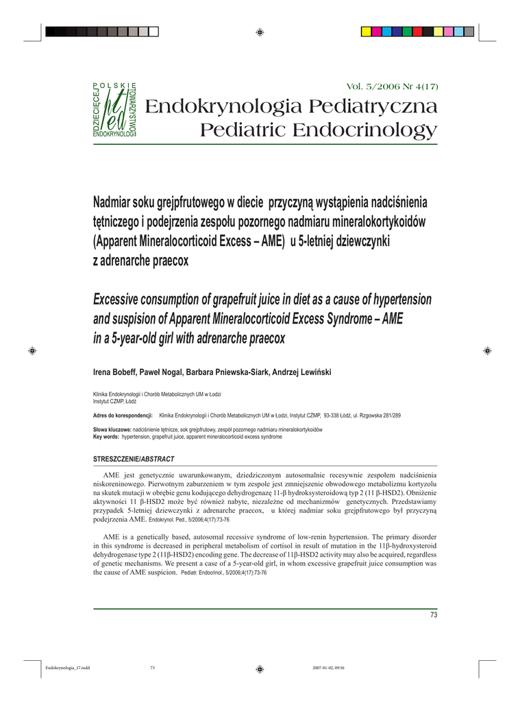 Vol. 5/2006 Nr 4(17) Endokrynologia Pediatryczna Pediatric Endocrinology Nadmiar soku grejpfrutowego w diecie przyczyną wystąpienia nadciśnienia tętniczego i podejrzenia zespołu pozornego nadmiaru mineralokortykoidów (Apparent Mineralocorticoid Excess – AME) u 5-letniej dziewczynki z adrenarche praecox Excessive consumption of grapefruit juice in diet as a cause of hypertension and suspision of Apparent Mineralocorticoid Excess Syndrome – AME in a 5-year-old girl with adrenarche praecox Irena Bobeff, Paweł Nogal, Barbara Pniewska-Siark, Andrzej Lewiński Klinika Endokrynologii i Chorób Metabolicznych UM w Łodzi Instytut CZMP, Łódź Adres do korespondencji: Klinika Endokrynologii i Chorób Metabolicznych UM w Łodzi, Instytut CZMP, 93-338 Łódź, ul. Rzgowska 281/289 Słowa kluczowe: nadciśnienie tętnicze, sok grejpfrutowy, zespół pozornego nadmiaru mineralokortykoidów Key words: hypertension, grapefruit juice, apparent mineralocorticoid excess syndrome STRESZCZENIE/ABSTRACT AME jest genetycznie uwarunkowanym, dziedziczonym autosomalnie recesywnie zespołem nadciśnienia niskoreninowego. Pierwotnym zaburzeniem w tym zespole jest zmniejszenie obwodowego metabolizmu kortyzolu na skutek mutacji w obrębie genu kodującego dehydrogenazę 11-β hydroksysteroidową typ 2 (11 β-HSD2). Obniżenie aktywności 11 β-HSD2 może być również nabyte, niezależne od mechanizmów genetycznych. Przedstawiamy przypadek 5-letniej dziewczynki z adrenarche praecox, u której nadmiar soku grejpfrutowego był przyczyną podejrzenia AME. Endokrynol. Ped., 5/2006;4(17):73-76 AME is a genetically based, autosomal recessive syndrome of low-renin hypertension. The primary disorder in this syndrome is decreased in peripheral metabolism of cortisol in result of mutation in the 11β-hydroxysteroid dehydrogenase type 2 (11β-HSD2) encoding gene. The decrease of 11β-HSD2 activity may also be acquired, regardless of genetic mechanisms. We present a case of a 5-year-old girl, in whom excessive grapefruit juice consumption was the cause of AME suspicion. Pediatr. Endocrinol., 5/2006;4(17):73-76 73 Endokrynologia_17.indd 73 2007-01-02, 09:56 Endokrynol. Ped., 5/2006;4(17):73-76 Praca kazuistyczna Wstęp Opis przypadku Genetycznie uwarunkowany zespół nadciśnienia niskoreninowego (dziedziczenie autosomalne, recesywne) znany jest jako zespół pozornego nadmiaru mineralokortykoidów (AME). Przyczyną tego zespołu jest mutacja w obrębie genu kodującego dehydrogenazę 11β hydroksysteroidową typu 2 (11β-HSD2) – izoenzym obecny głównie w cewkach nerkowych i odpowiedzialny za przekształcenie kortyzolu w nieczynny kortyzon. Upośledzona konwersja kortyzolu do kortyzonu w komórkach cewek nerkowych prowadzi do węwnątrzkomórkowego gromadzenia kortyzolu, choć stężenie tego hormonu w surowicy jest prawidłowe. Kortyzol (F) nagromadzony w dużych ilościach w cewkach nerkowych blokuje dostęp aldosteronu do receptora mineralokortykoidowego (RM), lecz kompleks F-RM nie podlega kontroli układu renina-angiotensyna i jest to przyczyną wystąpienia objawów nadmiaru mineralokortykoidów. W AME dochodzi także do zmiany metabolizmu kortyzolu w wątrobie, co skutkuje wydłużeniem czasu półtrwania kortyzolu. Zwiększenie wydalania z moczem 5α-tetrahydrokortyzolu (allo-THF) i zmniejszenie wydalania tetrahydrokortyzonu (THE) powoduje znaczący wzrost współczynnika allo-THF+THF/THE, uważanego za wskaźnik diagnostyczny tej choroby. Obniżenie aktywności 11β-HSD2 może mieć również inną przyczynę, niezależną od mechanizmów genetycznych [1]. W pracy zaprezentowano przypadek 5-letniej dziewczynki, u której nadmiar soku grejpfrutowego był przyczyną nadciśnienia tętniczego i podejrzenia AME. 5-letnia dziewczynka, do tej pory zdrowa, zgłosiła się do Poradni Endokrynologicznej w Instytucie CZMP z powodu pojawienia się niewielkiego owłosienia wzdłuż warg sromowych i pod jedną pachą. Urodziła się z ciąży II, przebiegającej prawidłowo, z masą ciała 3850 g, długością 58 cm, oceniona wg skali Apgar na 10 pkt. Dziewczynka ma 12-letniego, zdrowego brata. Dotychczas nie było z dzieckiem żadnych problemów zdrowotnych. Z wywiadu wiadomo, że matka i babcia dziecka od wieku szkolnego leczą się z powodu nadciśnienia tętniczego. Przy przyjęciu stwierdzono: wzrost 112,8 cm (50–75 pc), masą ciała 22,4 kg, RR – 120/80 mm Hg (>97 pc), sutki niepowiększone (thelarche Io), rozwój owłosienia łonowego oceniono według skali Tunnera na IIo (pubarche IIo), owłosienie pachowe obecne po prawej stronie (axilarche dx +). Dziewczynka została przyjęta do Kliniki Endokrynologii ICZMP w celu wykonania badań diagnostycznych. W wykonanym radiogramie kośćca ręki lewej, ocenionym według atlasu Greulicha-Pyle’a stwierdzono, że wiek kostny dziecka jest zgodny z wiekiem kalendarzowym. W badaniu ultrasonograficznym miednicy mniejszej wykazano, że macica ma wymiary 21 x 9 x 8 mm, echo endometrium linijne, prawy jajnik o wym. 16 x 9 x 9 mm, bez widocznych form pęcherzykowych, nie uwidoczniono struktur jajnika lewego. Stężenia hormonów w surowicy, ocenione w warunkach podstawowych, przedstawiono w tabeli I. Wykazano podwyższone stężenie androstendionu i DHEA-S w surowicy. W wykonanym teście stymulacyjnym z GnRH (preparat Relisorm w dawce 50 μg/m2 pow. ciała) Tabela I. Stężenia hormonów w warunkach podstawowych Table I. Results of baseline hormonal tests Wyniki / Results Norma /Reference values TSH (μIU/mL) 2,77 0,27-4,2 FT4 (ng/dL) 1,48 1,0-1,8 Estradiol (pg/mL) <5,00 <20,00 Testosteron (ng/mL) <0,06 0,06-0,82 Androstendion (ng/mL) 0,8 0,04-0,47 17OH-progesteron (ng/mL) 0,25 0,13-0,96 DHEA-S (μg/dL) 95,21 2,8-85,2 74 Endokrynologia_17.indd 74 2007-01-02, 09:56 Bobeff I. i inni – Nadmiar soku grejpfrutowego w diecie przyczyną wystąpienia nadciśnienia tętniczego... Tabela II. Test z GnRH Table II. Results of GnRH test 0’ 30’ 60’ LH (mIU/mL) 0,157 6,38 6,0