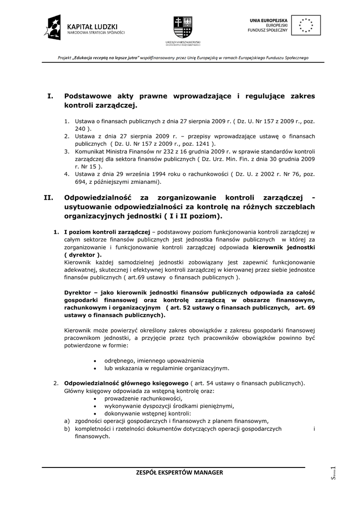 ZESPÓŁ EKSPERTÓW MANAGER I. Podstawowe akty prawne