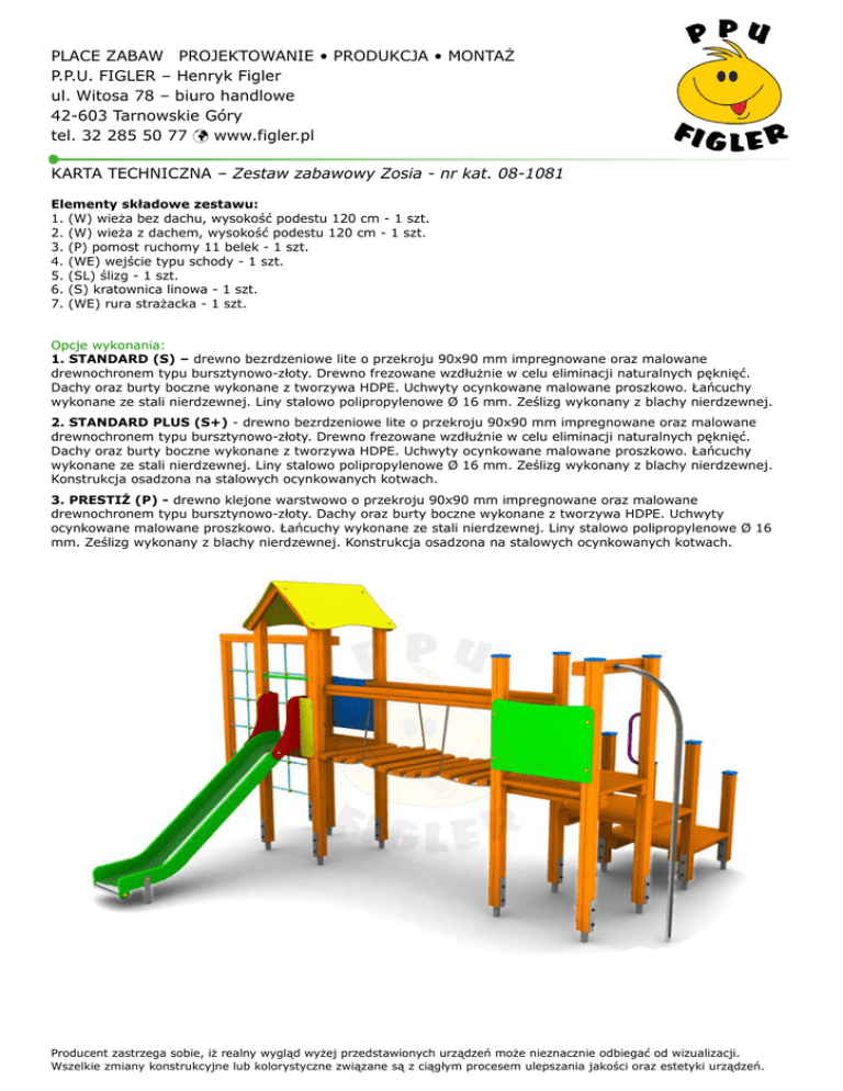 PLACE ZABAW PROJEKTOWANIE • PRODUKCJA • MONTAŻ P.P.U. FIGLER – Henryk Figler ul. Witosa 78 – biuro handlowe 42-603 Tarnowskie Góry tel. 32 285 50 77 www.figler.pl KARTA TECHNICZNA – Zestaw zabawowy Zosia - nr kat. 08-1081 Elementy składowe zestawu: 1. (W) wieża bez dachu, wysokość podestu 120 cm - 1 szt. 2. (W) wieża z dachem, wysokość podestu 120 cm - 1 szt. 3. (P) pomost ruchomy 11 belek - 1 szt. 4. (WE) wejście typu schody - 1 szt. 5. (SL) ślizg - 1 szt. 6. (S) kratownica linowa - 1 szt. 7. (WE) rura strażacka - 1 szt. Opcje wykonania: 1. STANDARD (S) – drewno bezrdzeniowe lite o przekroju 90x90 mm impregnowane oraz malowane drewnochronem typu bursztynowo-złoty. Drewno frezowane wzdłużnie w celu eliminacji naturalnych pęknięć. Dachy oraz burty boczne wykonane z tworzywa HDPE. Uchwyty ocynkowane malowane proszkowo. Łańcuchy wykonane ze stali nierdzewnej. Liny stalowo polipropylenowe Ø 16 mm. Ześlizg wykonany z blachy nierdzewnej. 2. STANDARD PLUS (S+) - drewno bezrdzeniowe lite o przekroju 90x90 mm impregnowane oraz malowane drewnochronem typu bursztynowo-złoty. Drewno frezowane wzdłużnie w celu eliminacji naturalnych pęknięć. Dachy oraz burty boczne wykonane z tworzywa HDPE. Uchwyty ocynkowane malowane proszkowo. Łańcuchy wykonane ze stali nierdzewnej. Liny stalowo polipropylenowe Ø 16 mm. Ześlizg wykonany z blachy nierdzewnej. Konstrukcja osadzona na stalowych ocynkowanych kotwach. 3. PRESTIŻ (P) - drewno klejone warstwowo o przekroju 90x90 mm impregnowane oraz malowane drewnochronem typu bursztynowo-złoty. Dachy oraz burty boczne wykonane z tworzywa HDPE. Uchwyty ocynkowane malowane proszkowo. Łańcuchy wykonane ze stali nierdzewnej. Liny stalowo polipropylenowe Ø 16 mm. Ześlizg wykonany z blachy nierdzewnej. Konstrukcja osadzona na stalowych ocynkowanych kotwach. Producent zastrzega sobie, iż realny wygląd wyżej przedstawionych urządzeń może nieznacznie odbiegać od wizualizacji. Wszelkie zmiany konstrukcyjne lub kolorystyczne związane są z ciągłym procesem ulepszania jakości oraz estetyki urządzeń. PLACE ZABAW PROJEKTOWANIE • PRODUKCJA • MONTAŻ P.P.U. FIGLER – Henryk Figler ul. Witosa 78 – biuro handlowe 42-603 Tarnowskie Góry tel. 32 285 50 77 www.figler.pl KARTA TECHNICZNA – Zestaw zabawowy Zosia - nr kat. 08-1081 Strefa bezpieczeństwa: Wymiary urządzenia 610x435x280 cm Wysokość swobodnego upadku max 200 cm Strefa bezpieczeństwa 960x785 cm Producent zastrzega sobie, iż realny wygląd wyżej przedstawionych urządzeń może nieznacznie odbiegać od wizualizacji. Wszelkie zmiany konstrukcyjne lub kolorystyczne związane są z ciągłym procesem ulepszania jakości oraz estetyki urządzeń.