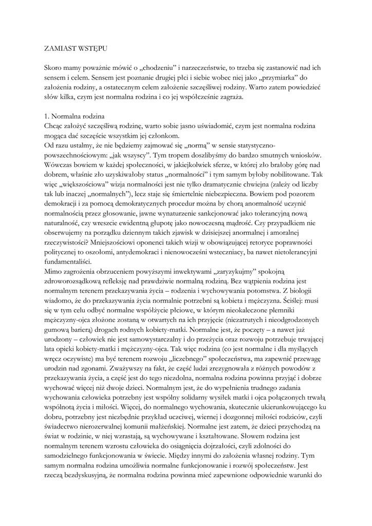 ZAMIAST WSTĘPU Skoro mamy poważnie mówić o „chodzeniu” i narzeczeństwie, to trzeba się zastanowić nad ich sensem i celem. Sensem jest poznanie drugiej płci i siebie wobec niej jako „przymiarka” do założenia rodziny, a ostatecznym celem założenie szczęśliwej rodziny. Warto zatem powiedzieć słów kilka, czym jest normalna rodzina i co jej współcześnie zagraża. 1. Normalna rodzina Chcąc założyć szczęśliwą rodzinę, warto sobie jasno uświadomić, czym jest normalna rodzina mogąca dać szczęście wszystkim jej członkom. Od razu ustalmy, że nie będziemy zajmować się „normą” w sensie statystycznopowszechnościowym: „jak wszyscy”. Tym tropem doszlibyśmy do bardzo smutnych wniosków. Wówczas bowiem w każdej społeczności, w jakiejkolwiek sferze, w której zło brałoby górę nad dobrem, właśnie zło uzyskiwałoby status „normalności” i tym samym byłoby nobilitowane. Tak więc „większościowa” wizja normalności jest nie tylko dramatycznie chwiejna (zależy od liczby tak lub inaczej „normalnych”), lecz staje się śmiertelnie niebezpieczna. Bowiem pod pozorem demokracji i za pomocą demokratycznych procedur można by chorą anormalność uczynić normalnością przez głosowanie, jawne wynaturzenie sankcjonować jako tolerancyjną nową naturalność, czy wreszcie ewidentną głupotę jako nowoczesną mądrość. Czy przypadkiem nie obserwujemy na porządku dziennym takich zjawisk w dzisiejszej anormalnej i amoralnej rzeczywistości? Mniejszościowi oponenci takich wizji w obowiązującej retoryce poprawności politycznej to oszołomi, antydemokraci i nienowocześni wsteczniacy, ba nawet nietolerancyjni fundamentaliści. Mimo zagrożenia obrzuceniem powyższymi inwektywami „zaryzykujmy” spokojną zdroworozsądkową refleksję nad prawdziwie normalną rodziną. Bez wątpienia rodzina jest normalnym terenem przekazywania życia – rodzenia i wychowywania potomstwa. Z biologii wiadomo, że do przekazywania życia normalnie potrzebni są kobieta i mężczyzna. Ściślej: musi się w tym celu odbyć normalne współżycie płciowe, w którym nieokaleczone plemniki mężczyzny-ojca złożone zostaną w otwartych na ich przyjęcie (niezatrutych i nieodgrodzonych gumową barierą) drogach rodnych kobiety-matki. Normalne jest, że poczęty – a nawet już urodzony – człowiek nie jest samowystarczalny i do przeżycia oraz rozwoju potrzebuje trwającej lata opieki kobiety-matki i mężczyzny-ojca. Tak więc rodzina (co jest normalne i dla myślących wręcz oczywiste) ma być terenem rozwoju „liczebnego” społeczeństwa, ma zapewnić przewagę urodzin nad zgonami. Zważywszy na fakt, że część ludzi zrezygnowała z różnych powodów z przekazywania życia, a część jest do tego niezdolna, normalna rodzina powinna przyjąć i dobrze wychować więcej niż dwoje dzieci. Normalnym jest, że do wypełnienia trudnego zadania wychowania człowieka potrzebny jest wspólny solidarny wysiłek matki i ojca połączonych trwałą wspólnotą życia i miłości. Więcej, do normalnego wychowania, skutecznie ukierunkowującego ku dobru, potrzebny jest niezbędnie przykład uczciwej, wiernej i dozgonnej miłości rodziców, czyli świadectwo nierozerwalnej komunii małżeńskiej. Normalne jest zatem, że dzieci przychodzą na świat w rodzinie, w niej wzrastają, są wychowywane i kształtowane. Słowem rodzina jest normalnym terenem wzrostu człowieka do osiągnięcia dojrzałości, czyli zdolności do samodzielnego funkcjonowania w świecie. Między innymi do założenia własnej rodziny. Tym samym normalna rodzina umożliwia normalne funkcjonowanie i rozwój społeczeństw. Jest rzeczą bezdyskusyjną, że normalna rodzina powinna mieć zapewnione odpowiednie warunki do normalnego – godnego – życia i wypełniania swej rodzicielskiej i wspólnotowej misji. Chodzi tu zarówno o warunki finansowe, mieszkaniowe, jak też szeroko rozumiane środki zapewniające poczucie stabilności i bezpieczeństwa (również psychicznego). Tak więc normalna rodzina powinna zawsze i wszędzie odczuwać (to odczucie powinno wynikać z realiów), że jest najważniejszą komórką społeczną, od której zależą losy społeczności, w której funkcjonuje. Leży to w najlepiej rozumianym interesie (w konsekwencji również ekonomicznym) każdej społeczności, każdego państwa. Normalną rzeczą jest, a raczej powinna być, troska każdego państwa o normalną rodzinę jako największy skarb, najważniejszą instytucję zapewniającą byt państwa, a nawet jego przetrwanie. To wszystko, co wyżej napisano, wynika, wprost z normalnego myślenia. Jeżeli dodamy do tego naukę Kościoła głoszącą, że: „Małżeństwo bowiem nie jest wynikiem jakiegoś przypadku albo owocem ewolucji ślepych sił przyrody, Bóg Stwórca ustanowił je mądrze i opatrznościowo (...) małżonkowie (...) dążą do takiej wspólnoty osób, aby doskonaląc się w niej wzajemnie, współpracować jednocześnie z Bogiem w wydaniu na świat i wychowaniu nowych ludzi...” (Humanae vitae III, 1.28) to oczywistym staje się, że: przyszłość świata idzie przez rodzinę (Jan Paweł II Familiaris consortio 75,) dodajmy: normalną rodzinę. 2. Atak na normalną rodzinę Nikt przy zdrowych zmysłach nie zaneguje faktu, że mama, tato i dzieci to rodzina. W dzisiejszym świecie trwa jednak zmasowany atak sił zła na rodzinę. Próbuje się sztucznie poszerzać jej definicję, nazywając rodziną związki tymczasowe (konkubinaty), a nawet sprzeczne z naturą człowieka (wynaturzone) związki homoseksualne. Godzi się w jedność i nierozerwalność małżeństwa, propagując rozwody na życzenie, czy przyznając specjalne prawa konkubinatom i rozbitym rodzinom. Oczywiście należy wspomagać rodziny źle funkcjonujące, lecz tworzenie praw, które czynią materialnie opłacalnym rozwód, jest śmiertelnie niebezpieczne dla jedności i nierozerwalności małżeństwa. N