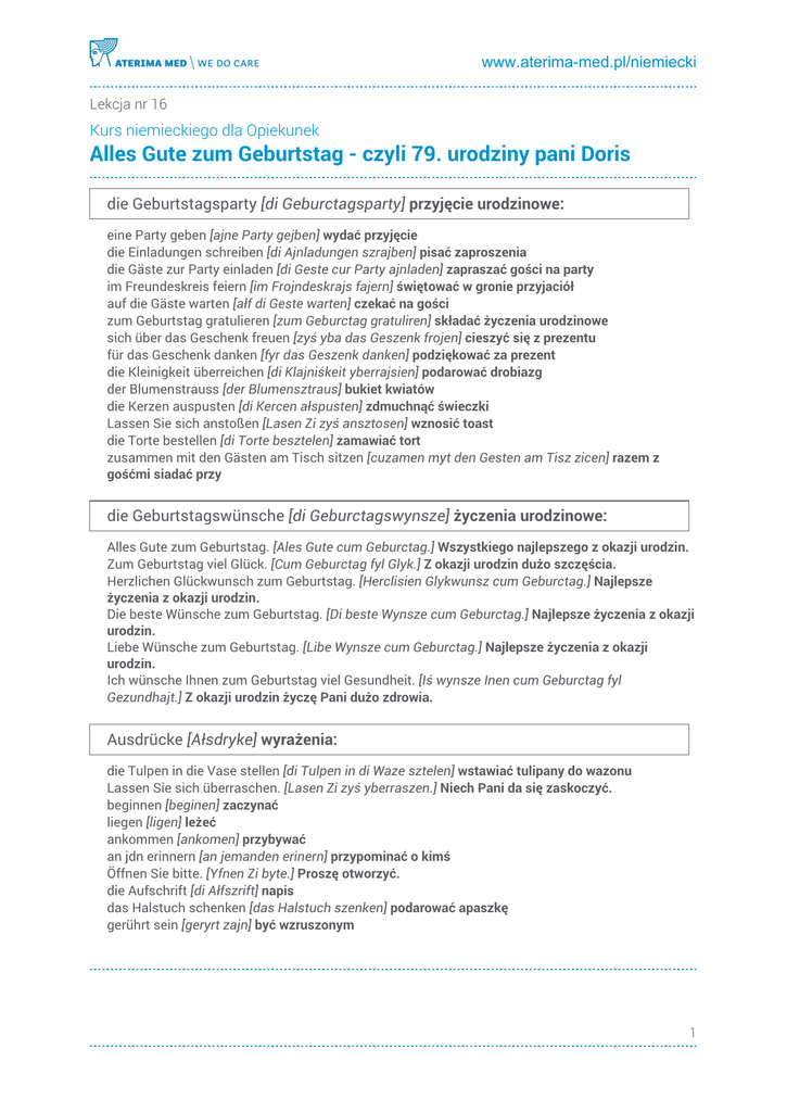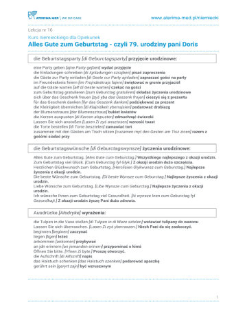 www.aterima-med.pl/niemiecki Lekcja nr 16 Kurs niemieckiego dla Opiekunek Alles Gute zum Geburtstag - czyli 79. urodziny pani Doris die Geburtstagsparty [di Geburctagsparty] przyjęcie urodzinowe: eine Party geben [ajne Party gejben] wydać przyjęcie die Einladungen schreiben [di Ajnladungen szrajben] pisać zaproszenia die Gäste zur Party einladen [di Geste cur Party ajnladen] zapraszać gości na party im Freundeskreis feiern [im Frojndeskrajs fajern] świętować w gronie przyjaciół auf die Gäste warten [ałf di Geste warten] czekać na gości zum Geburtstag gratulieren [zum Geburctag gratuliren] składać życzenia urodzinowe sich über das Geschenk freuen [zyś yba das Geszenk frojen] cieszyć się z prezentu für das Geschenk danken [fyr das Geszenk danken] podziękować za prezent die Kleinigkeit überreichen [di Klajniśkeit yberrajsien] podarować drobiazg der Blumenstrauss [der Blumensztraus] bukiet kwiatów die Kerzen auspusten [di Kercen ałspusten] zdmuchnąć świeczki Lassen Sie sich anstoßen [Lasen Zi zyś ansztosen] wznosić toast die Torte bestellen [di Torte besztelen] zamawiać tort zusammen mit den Gästen am Tisch sitzen [cuzamen myt den Gesten am Tisz zicen] razem z gośćmi siadać przy die Geburtstagswünsche [di Geburctagswynsze] życzenia urodzinowe: Alles Gute zum Geburtstag. [Ales Gute cum Geburctag.] Wszystkiego najlepszego z okazji urodzin. Zum Geburtstag viel Glück. [Cum Geburctag fyl Glyk.] Z okazji urodzin dużo szczęścia. Herzlichen Glückwunsch zum Geburtstag. [Herclisien Glykwunsz cum Geburctag.] Najlepsze życzenia z okazji urodzin. Die beste Wünsche zum Geburtstag. [Di beste Wynsze cum Geburctag.] Najlepsze życzenia z okazji urodzin. Liebe Wünsche zum Geburtstag. [Libe Wynsze cum Geburctag.] Najlepsze życzenia z okazji urodzin. Ich wünsche Ihnen zum Geburtstag viel Gesundheit. [Iś wynsze Inen cum Geburctag fyl Gezundhajt.] Z okazji urodzin życzę Pani dużo zdrowia. Ausdrücke [Ałsdryke] wyrażenia: die Tulpen in die Vase stellen [di Tulpen in di Waze sztelen] wstawiać tulipany do wazonu Lassen Sie sich überraschen. [Lasen Zi zyś yberraszen.] Niech Pani da się zaskoczyć. beginnen [beginen] zaczynać liegen [ligen] leżeć ankommen [ankomen] przybywać an jdn erinnern [an jemanden erinern] przypominać o kimś Öffnen Sie bitte. [Yfnen Zi byte.] Proszę otworzyć. die Aufschrift [di Ałfszrift] napis das Halstuch schenken [das Halstuch szenken] podarować apaszkę gerührt sein [geryrt zajn] być wzruszonym 1 www.aterima-med.pl/niemiecki Materiał stanowi własność firmy ATERIMA Sp. z o.o. Sp. K. ul. Puszkarska 7f, 30-644 Kraków. Reprodukcja, rozpowszechnianie lub inne wykorzystywanie całości lub części materiału w jakiejkolwiek formie dla celów innych, niż cele niekomercyjne i osobiste jest zakazane. 2 Powered by TCPDF (www.tcpdf.org)