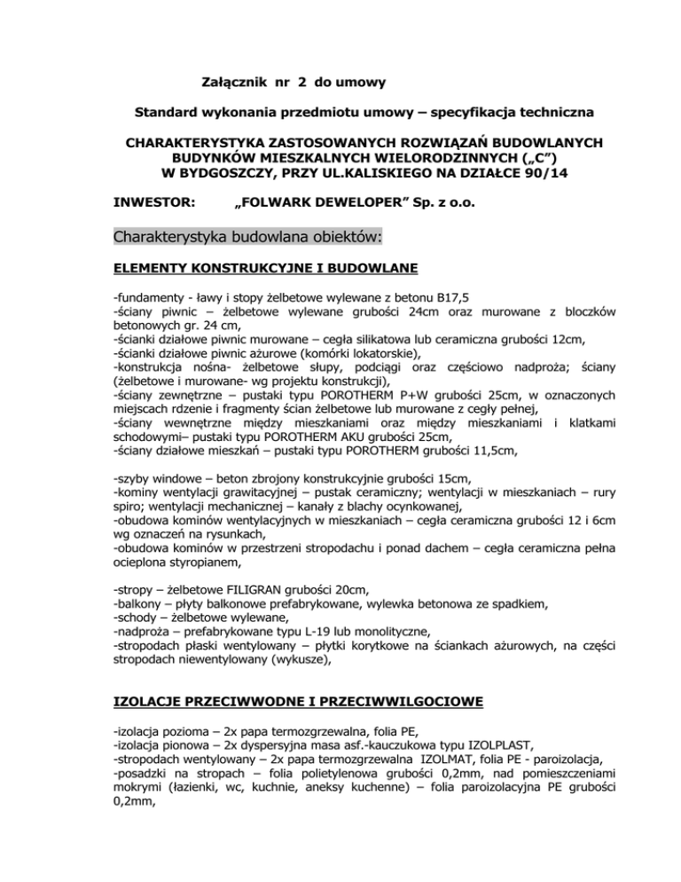 Załącznik nr 2 do umowy Standard wykonania przedmiotu umowy – specyfikacja techniczna CHARAKTERYSTYKA ZASTOSOWANYCH ROZWIĄZAŃ BUDOWLANYCH BUDYNKÓW MIESZKALNYCH WIELORODZINNYCH („C”) W BYDGOSZCZY, PRZY UL.KALISKIEGO NA DZIAŁCE 90/14 INWESTOR: „FOLWARK DEWELOPER” Sp. z o.o. Charakterystyka budowlana obiektów: ELEMENTY KONSTRUKCYJNE I BUDOWLANE -fundamenty - ławy i stopy żelbetowe wylewane z betonu B17,5 -ściany piwnic – żelbetowe wylewane grubości 24cm oraz murowane z bloczków betonowych gr. 24 cm, -ścianki działowe piwnic murowane – cegła silikatowa lub ceramiczna grubości 12cm, -ścianki działowe piwnic ażurowe (komórki lokatorskie), -konstrukcja nośna- żelbetowe słupy, podciągi oraz częściowo nadproża; ściany (żelbetowe i murowane- wg projektu konstrukcji), -ściany zewnętrzne – pustaki typu POROTHERM P+W grubości 25cm, w oznaczonych miejscach rdzenie i fragmenty ścian żelbetowe lub murowane z cegły pełnej, -ściany wewnętrzne między mieszkaniami oraz między mieszkaniami i klatkami schodowymi– pustaki typu POROTHERM AKU grubości 25cm, -ściany działowe mieszkań – pustaki typu POROTHERM grubości 11,5cm, -szyby windowe – beton zbrojony konstrukcyjnie grubości 15cm, -kominy wentylacji grawitacyjnej – pustak ceramiczny; wentylacji w mieszkaniach – rury spiro; wentylacji mechanicznej – kanały z blachy ocynkowanej, -obudowa kominów wentylacyjnych w mieszkaniach – cegła ceramiczna grubości 12 i 6cm wg oznaczeń na rysunkach, -obudowa kominów w przestrzeni stropodachu i ponad dachem – cegła ceramiczna pełna ocieplona styropianem, -stropy – żelbetowe FILIGRAN grubości 20cm, -balkony – płyty balkonowe prefabrykowane, wylewka betonowa ze spadkiem, -schody – żelbetowe wylewane, -nadproża – prefabrykowane typu L-19 lub monolityczne, -stropodach płaski wentylowany – płytki korytkowe na ściankach ażurowych, na części stropodach niewentylowany (wykusze), IZOLACJE PRZECIWWODNE I PRZECIWWILGOCIOWE -izolacja pozioma – 2x papa termozgrzewalna, folia PE, -izolacja pionowa – 2x dyspersyjna masa asf.-kauczukowa typu IZOLPLAST, -stropodach wentylowany – 2x papa termozgrzewalna IZOLMAT, folia PE - paroizolacja, -posadzki na stropach – folia polietylenowa grubości 0,2mm, nad pomieszczeniami mokrymi (łazienki, wc, kuchnie, aneksy kuchenne) – folia paroizolacyjna PE grubości 0,2mm, -ściany łazienek – folia w płynie na podłogę i ściany do wys. min.15cm, IZOLACJE TERMICZNE I AKUSTYCZNE -stropodach wentylowany – wełna mineralna półtwarda gr.20cm, -stropodach niewentylowany - wełna mineralna gr.20cm -strop nad garażami – izolacja termiczna i gazoszczelna – styropian gr.5cm tynkowany, -ściany zewnętrzne kondygnacji nadziemnych – styropian frezowany EPS 80 grubości 12cm, -ściany piwnic w gruncie – styropian ekstrudowany np. STYROFOAM, gr. 8cm, -ściany piwnic 30cm ponad gruntem – styropian EPS 80 grubości 8cm (do poziomu spodu stropu), -gzymsy – styropian EPS 80 grubości 5cm, -kominy wentylacyjne ponad dachem – styropian EPS 80 grubości 5cm, -stropy międzykondygnacyjne – styropian EPS 200 grubości 3cm (warstwa instalacyjna) + styropian elastyczny STYROFLEX grubości 28/25mm, -ściany mieszkań – POROTHEM AKU 25cm, -przejścia instalacyjne rurowe przez ściany oddzielenia przeciwpożarowego izolowane pianką termopęczniejącą o odpowiednich parametrach przeciwpożarowych. WYKOŃCZENIE ZEWNĘTRZNE -opaska wokół budynku żwir szerokości 30cm, zakończony krawężnikiem 20x6cm, -ściany zewnętrzne – bezspoinowy system ocieplenia np. CAPAROL CAPATECT SILIKAT SI z warstwą styropianu frezowanego EPS 80 grubości 12cm. Wszystkie naroża wzmocnione kątownikiem, a ościeża włókniną techniczną. Warstwa wierzchnia – tynk silikatowy np. CAPAROL CAPATECT SI SILIKAT o strukturze „baranek” i uziarnieniu 2,0mm w kolorze białym. Tynki malowane farbami silikatowymi np. CAPAROL zgodnie z kolorystyką elewacji. W oznaczonych miejscach (strefa kondygnacji piwnic oraz fragmenty ścian powyżej w bud.”B”) przyklejone płytki elewacyjne klinkierowe. -murki, ogrodzenia, schody zewnętrzne – murki oporowe, żelbetowe i betonowe z elementów prefabrykowanych. Podest przed wejściem do lokalu usługowego – kostka betonowa w kolorze szarym. Ogrodzenie – prefabrykowane słupki stalowe ocynkowane z siatką. -wycieraczki zewnętrzne – ruszty stalowe ocynkowane w zagłębieniu, WYKOŃCZENIE WEWNĘTRZNE Mieszkania w projektowanych budynkach będą oddawane do użytku w wersji „standard” wykończenia i wyposażenia pomieszczeń. wersja „standard”: -posadzki cementowe zatarte „na ostro”, nie pylące, jako bezpośredni podkład pod dowolnie układaną warstwę wierzchnią, -ściany łazienek – tynk cementowo-wapienny, -ściany pozostałych pomieszczeń w mieszkaniach – tynk gipsowy nie gruntowany, -sufity – przecierka gipsowa, -otwory drzwi wewnątrz lokalowych przygotowane do montażu ościeżnic drewnianych i skrzydeł drzwiowych, -łazienki i kuchnie – gotowe przyłącza do montażu przyborów i urządzeń, bez białego montażu, Posadzki: -piwnice: *garaże – na warstwie ubitego piasku beton towarowy B10 gr.15cm wyrównany i zawibrowany pneumatyczną łatą wibracyjną, papa asfaltowa, beton B10 ze spadkiem 1% gr.5-11cm lub elementy prefabrykowane. *podłoga piwnic - na warstwie ubitego piasku beton towarowy B10 o grubości 15cm, wyrównany i zawibrowany pneumatyczną łatą wibracyjną, styropian EPS100, izolacja z folii PE, gładź cementowa na ostro, w obrębie komórek lokatorskich posadzka cementowa. *posadzki w lokalu usługowym - posadzki cementowe zatarte „na ostro”, nie pylące, jako bezpośredni podkład pod dowolnie układaną warstwę wierzchnią, *podłoga klatki schodowej i przedsionka – warstwy posadzkowe – jak na następnych kondygnacjach, -kondygnacje nadziemne: *klatki schodowe, korytarze, przedsionki – płytki gres