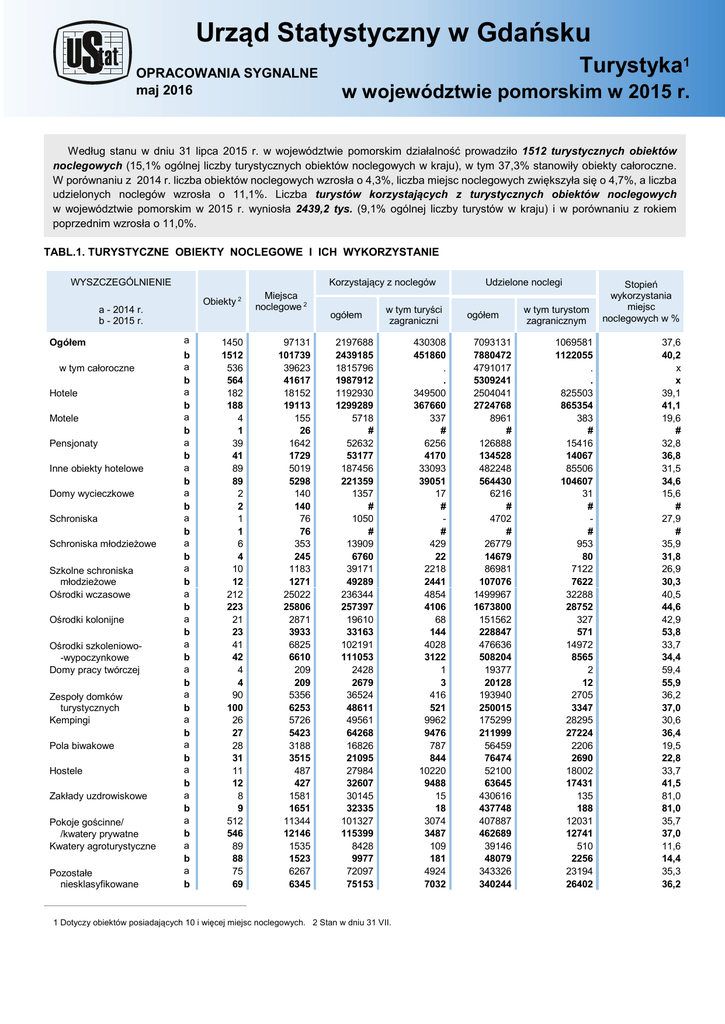 Urząd Statystyczny w Gdańsku OPRACOWANIA SYGNALNE maj 2016 Turystyka1 w województwie pomorskim w 2015 r. Według stanu w dniu 31 lipca 2015 r. w województwie pomorskim działalność prowadziło 1512 turystycznych obiektów noclegowych (15,1% ogólnej liczby turystycznych obiektów noclegowych w kraju), w tym 37,3% stanowiły obiekty całoroczne. W porównaniu z 2014 r. liczba obiektów noclegowych wzrosła o 4,3%, liczba miejsc noclegowych zwiększyła się o 4,7%, a liczba udzielonych noclegów wzrosła o 11,1%. Liczba turystów korzystających z turystycznych obiektów noclegowych w województwie pomorskim w 2015 r. wyniosła 2439,2 tys. (9,1% ogólnej liczby turystów w kraju) i w porównaniu z rokiem poprzednim wzrosła o 11,0%. TABL.1. TURYSTYCZNE OBIEKTY NOCLEGOWE I ICH WYKORZYSTANIE Korzystający z noclegów WYSZCZEGÓLNIENIE Obiekty a - 2014 r. b - 2015 r. Ogółem w tym całoroczne Hotele Motele Pensjonaty Inne obiekty hotelowe Domy wycieczkowe Schroniska Schroniska młodzieżowe Szkolne schroniska młodzieżowe Ośrodki wczasowe Ośrodki kolonijne Ośrodki szkoleniowo-wypoczynkowe Domy pracy twórczej Zespoły domków turystycznych Kempingi Pola biwakowe Hostele Zakłady uzdrowiskowe Pokoje gościnne/ /kwatery prywatne Kwatery agroturystyczne Pozostałe niesklasyfikowane a b a b a b a b a b a b a b a b a b a b a b a b a b a b a b a b a b a b a b a b a b a b 2 1450 1512 536 564 182 188 4 1 39 41 89 89 2 2 1 1 6 4 10 12 212 223 21 23 41 42 4 4 90 100 26 27 28 31 11 12 8 9 512 546 89 88 75 69 Miejsca noclegowe 2 97131 101739 39623 41617 18152 19113 155 26 1642 1729 5019 5298 140 140 76 76 353 245 1183 1271 25022 25806 2871 3933 6825 6610 209 209 5356 6253 5726 5423 3188 3515 487 427 1581 1651 11344 12146 1535 1523 6267 6345 ogółem w tym turyści zagraniczni 2197688 2439185 1815796 1987912 1192930 1299289 5718 # 52632 53177 187456 221359 1357 # 1050 # 13909 6760 39171 49289 236344 257397 19610 33163 102191 111053 2428 2679 36524 48611 49561 64268 16826 21095 27984 32607 30145 32335 101327 115399 8428 9977 72097 75153 1 Dotyczy obiektów posiadających 10 i więcej miejsc noclegowych. 2 Stan w dniu 31 VII. 430308 451860 . . 349500 367660 337 # 6256 4170 33093 39051 17 # # 429 22 2218 2441 4854 4106 68 144 4028 3122 1 3 416 521 9962 9476 787 844 10220 9488 15 18 3074 3487 109 181 4924 7032 Udzielone noclegi ogółem 7093131 7880472 4791017 5309241 2504041 2724768 8961 # 126888 134528 482248 564430 6216 # 4702 # 26779 14679 86981 107076 1499967 1673800 151562 228847 476636 508204 19377 20128 193940 250015 175299 211999 56459 76474 52100 63645 430616 437748 407887 462689 39146 48079 343326 340244 w tym turystom zagranicznym 1069581 1122055 . . 825503 865354 383 # 15416 14067 85506 104607 31 # # 953 80 7122 7622 32288 28752 327 571 14972 8565 2 12 2705 3347 28295 27224 2206 2690 18002 17431 135 188 12031 12741 510 2256 23194 26402 Stopień wykorzystania miejsc noclegowych w % 37,6 40,2 x x 39,1 41,1 19,6 # 32,8 36,8 31,5 34,6 15,6 # 27,9 # 35,9 31,8 26,9 30,3 40,5 44,6 42,9 53,8 33,7 34,4 59,4 55,9 36,2 37,0 30,6 36,4 19,5 22,8 33,7 41,5 81,0 81,0 35,7 37,0 11,6 14,4 35,3 36,2 Wśród turystycznych obiektów noclegowych w województwie pomorskim najwięcej było pokoi gościnnych i kwater prywatnych, a ich liczba zwiększyła się o 6,6% w porównaniu z lipcem 2014 r. Obiekty hotelowe (tj. hotele, motele, pensjonaty i inne obiekty hotelowe) stanowiły 21,1% ogólnej liczby obiektów i było ich o 1,6% więcej niż w 2014 r. W grupie obiektów hotelowych przeważały hotele, których liczba wzrosła o 3,3% w stosunku do 2014 r. W porównaniu z 2014 r. zmniejszyła się liczba moteli, schronisk młodzieżowych, pozostałych niesklasyfikowanych obiektów oraz kwater agroturystycznych. STRUKTURA TURYSTYCZNYCH OBIEKTÓW NOCLEGOWYCH WEDŁUG RODZAJÓW OBIEKTU W 2015 R. (Stan w dniu 31 VII) 6,6% 5,9% 12,4% 2,7% 14,7% 4,6% 36,1% 2,8% 5,8% Hotele Pensjonaty Inne obiekty hotelowe Ośrodki wczasowe Ośrodki szkoleniowo-wypoczynkowe Zespoły domków turystycznych Pokoje gościnne/kwatery prywatne Kwatery agroturystyczne Pozostałe niesklasyfikowane Pozostałe 8,4% Największą liczbą miejsc noclegowych dysponowały ośrodki wczasowe i hotele - odpowiednio 25,4% i 18,8% ogólnej liczby miejsc noclegowych w województwie. W porównaniu z 2014 r. największy wzrost liczby miejsc noclegowych odnotowano w ośrodkach kolonijnych (o 37,0%) oraz w zespołach domków turystycznych (o 16,7%). Podobnie jak w lipcu 2014 r. każdy turystyczny obiekt noclegowy dysponował średnio 67 miejscami noclegowymi. W obiektach hotelowych na jeden obiekt przypadały przeciętnie 82 miejsca noclegowe, natomiast w pozostałych obiektach noclegowych − 63 miejsca. LICZBA MIEJSC NOCLEGOWYCH WEDŁUG POWIATÓW W 2015 R. (Stan w dniu 31 VII) pucki lęborski SŁUPSK wejherowski GDYNIA słupski SOPOT GDAŃSK Pod względem liczby miejsc noclegowych sytuacja przedstawiała się podobnie, gdzie największy udział w ogólnej liczbie miejsc noclegowych w województwie pomorskim miał powiat pucki (23,1%), Gdańsk (13,5%), powiat nowodworski (12,5%), powiat słupski (11,9%), oraz powiat lęborski (9,7%). kartuski nowodworski gdański bytowski malborski kościerski tczewski sztumski starogardzki chojnicki człuchowski kwidzyński 0 1,0 2,5 5,0 10,0 20,0 Ponad 70% zasobów bazy noclegowej zlokalizowanych było w powiatach o dużych walorach turystycznych, położonych w pasie nadmorskim, tj. w puckim (494 obiekty), nowodworskim (169 obiektów), lęborskim (148 obiektów), słupskim (144 obiekty) oraz w Gdańsku (122 obiekty). 25,0 tys. wykres interaktywny W porównaniu z 2014 r. liczba turystycznych obiektów noclegowych zmniejszyła się w powiatach: lęborskim, chojnickim, kwidzyńskim, malborskim i tczewskim. Największy spadek liczby miejsc noclegowych odnotowano natomiast w powiecie gdańskim (o 6,5%). TABL. 2. TURYSTYCZNE OBIEKTY NOCLEGOWE WEDŁUG POWIATÓW W 2015 R. Obiekty a WYSZCZEGÓLNIENIE WOJEWÓDZTWO Miejsca noclegow