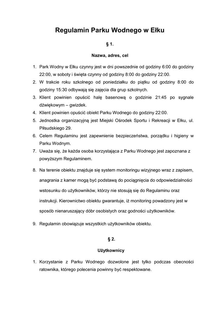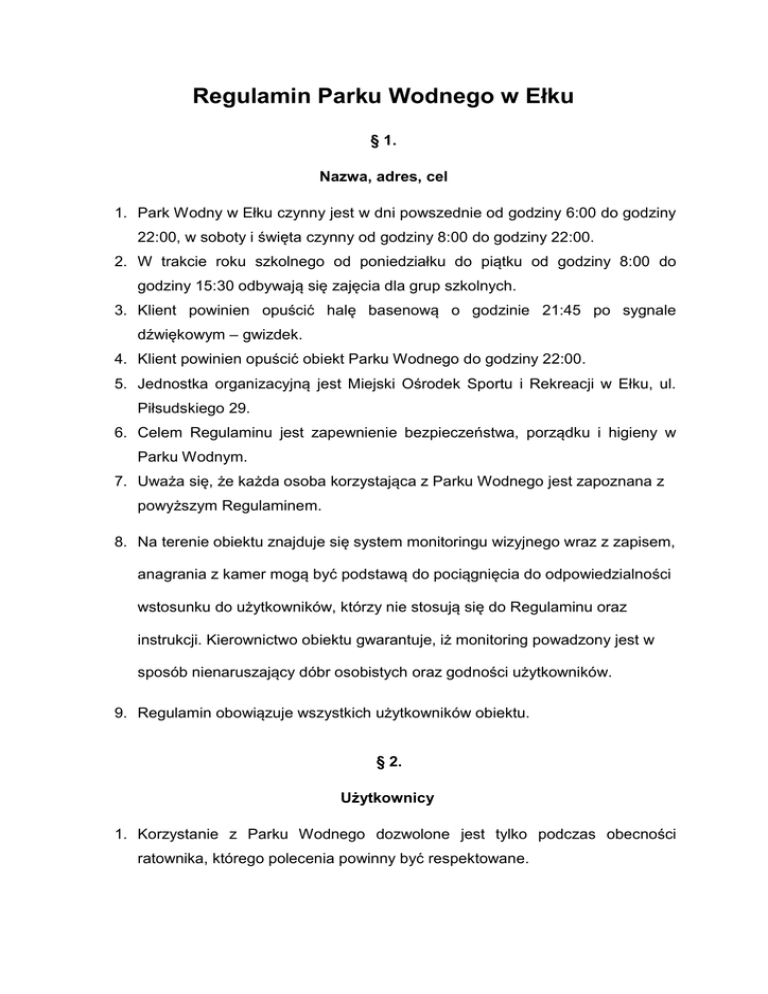 Regulamin Parku Wodnego w Ełku § 1. Nazwa, adres, cel 1. Park Wodny w Ełku czynny jest w dni powszednie od godziny 6:00 do godziny 22:00, w soboty i święta czynny od godziny 8:00 do godziny 22:00. 2. W trakcie roku szkolnego od poniedziałku do piątku od godziny 8:00 do godziny 15:30 odbywają się zajęcia dla grup szkolnych. 3. Klient powinien opuścić halę basenową o godzinie 21:45 po sygnale dźwiękowym – gwizdek. 4. Klient powinien opuścić obiekt Parku Wodnego do godziny 22:00. 5. Jednostka organizacyjną jest Miejski Ośrodek Sportu i Rekreacji w Ełku, ul. Piłsudskiego 29. 6. Celem Regulaminu jest zapewnienie bezpieczeństwa, porządku i higieny w Parku Wodnym. 7. Uważa się, że każda osoba korzystająca z Parku Wodnego jest zapoznana z powyższym Regulaminem. 8. Na terenie obiektu znajduje się system monitoringu wizyjnego wraz z zapisem, anagrania z kamer mogą być podstawą do pociągnięcia do odpowiedzialności wstosunku do użytkowników, którzy nie stosują się do Regulaminu oraz instrukcji. Kierownictwo obiektu gwarantuje, iż monitoring powadzony jest w sposób nienaruszający dóbr osobistych oraz godności użytkowników. 9. Regulamin obowiązuje wszystkich użytkowników obiektu. § 2. Użytkownicy 1. Korzystanie z Parku Wodnego dozwolone jest tylko podczas obecności ratownika, którego polecenia powinny być respektowane. 2. W razie niebezpieczeństwa użytkownik powinien wzywać pomocy słowami „ratunku”, „ratownik”. 3. Użytkownikiem jest osoba, która posiada ważną kartę wstępu (transponder, klucz do szafki) i przebywa na terenie Parku Wodnego w godzinach określonych w § 1 pkt. 1. 4. Pobyt na terenie Parku Wodnego służy wypoczynkowi, odprężeniu i przyjemności. W związku z powyższym każdy użytkownik obowiązany jest zachować się kulturalnie i nie zakłócać spokoju innym użytkownikom. 5. Użytkowanie obiektu dostępne jest dla każdego, z wyłączeniem osób: a) które znajdują się w stanie wskazującym na spożycie alkoholu lub innych podobnie działających środków odurzających, b) z chorobami zakaźnymi, wysypkami na skórze oraz otwartymi ranami. 6. Osoby ze skłonnościami do ataków skurczów lub utraty przytomności oraz niepełnosprawne powinny przebywać na terenie obiektu pod opieką osoby pełnoletniej. 7. O każdym spostrzeżonym wypadku lub zranieniu należy niezwłocznie informować personel obiektu w celu udzielenia natychmiastowej pomocy medycznej. 8. Dzieci do lat 7 włącznie mogą przebywać na terenie obiektu oraz kąpać się tylko pod opieką osób pełnoletnich.Osoby te ponoszą odpowiedzialność za powierzone ich opiece dzieci i odpowiadają za wszelkie szkody przez nie wyrządzone. 9. Dzieci do lat 3 włącznie korzystające z Parku Wodnego powinny posiadać na sobie jednorazowe pieluchomajtki do kąpieli. 10. Zabawy z użyciem sprzętu typu: rękawki, koła, kapoki mogą odbywać się tylko w części „płytkiej” basenu rekreacyjnego zgodnie z zaleceniami zapisanymi na atestowanym sprzęcie. 11. Dorośli mogą zabierać ze sobą do kabiny przebieralni dzieci tylko wtedy, gdy są prawowitymi opiekunami. 12. Sauna infrared, sauna sucha, łaźnie parowe czynne są zgodnie z harmonogramem pracy umieszczonym przy wejściu do nich. 13. Korzystać ze zjeżdżalni mogą te osoby, które zapoznały się z regulaminem zjeżdżalni i potrafią pływać. 14. Korzystanie z atrakcji wodnych odbywa się na własne ryzyko użytkowników. Osoby o niestabilnym stanie zdrowia powinny korzystać z atrakcji ze szczególnąostrożnością (lub po konsultacji ze swoim lekarzem). 15. Atrakcje wodne włącza ratownik na życzenie użytkownika. 16. Uwaga! Atrakcje zasilane są wodą basenową, która jest pobierana przez kosze ssawne zlokalizowane w ścianach i na dnie basenu. Istnieje możliwość przyssania: włosów, odstającej garderoby. Pamiętaj!Używaj stroju ściśle przylegającego do ciała, a w przypadku długich włosów wskazany jest czepek. 17. Na torach basenu sportowego obowiązuje ruch prawostronny. 18. Maksymalna liczba osób pływających na jednym torze sportowym nie może przekraczać 10 osób, na torze wypłyconym 12 osób. 19. Podczas uroczystości, imprez, zawodów itp. kierownicy imprez i kierownicy ekip są odpowiedzialni za to, aby wszyscy uczestnicy i goście przestrzegali postanowień niniejszego Regulaminu. 20. Wszelka działalność zarobkowa na terenie Parku Wodnego możliwa jest tylko za zgodą i wiedzą kierownictwa Parku Wodnego. 21. W przypadku dużej frekwencji personel Parku Wodnego może ograniczyć ilość wejść na obiekt. 22. Użytkownik zobowiązany jest zapoznać się ze sposobem regulowania należności. 23. Otrzymana karta wstępu (transponder, klucz) podlega rozliczeniu i zwrotowi w kasie Parku Wodnego przy opuszczaniu obiektu. 24. Za niewykorzystanie karty wstępu oraz w przypadku wydalenia użytkownika z obiektu, uiszczone opłaty nie są zwracane. 25. W przypadku zagubienia karty wstępu (transpondera, klucza) użytkownik zobowiązany jest uiścić karę umowną w kwocie 25,00 złotych brutto w kasie. 26. Trybuny udostępniane są zgodnie z informacją zamieszczoną przy wejściu na trybuny. Użytkownicy grupowi § 3. 1. Grupa zorganizowana to zespół osób uprawiających ćwiczenia ruchowe w wodzie pod nadzorem i kierunkiem trenera, instruktora pływania, nauczyciela, opiekuna lub innej osoby z adekwatnymi uprawnieniami. 2. W zajęciach zorganizowanych w grupach nie może brać udziału więcej niż 15 uczestników. 3. Opiekun grupy zorganizowanej zobowiązany jest do sprawowania nadzoru nad grupą przebywającą w wodzie. przebywać w niecce basenowej. W tym czasie opiekun nie może 4. Zajęcia mogą odbywać się tylko w obecności ratownika, który może w przypadku stwierdzenia nieprzestrzegania Regulaminu zakazać dalszego korzystania z Parku Wodnego. 5. Do obowiązków kierownika kolonii, obozów i innych placówek wypoczynku dzieci i młodzieży, k