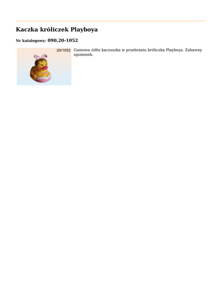 Kaczka króliczek Playboya Nr katalogowy: 090,20-1052 Gumowa żółta kaczuszka w przebraniu króliczka Playboya. Zabawny upominek.