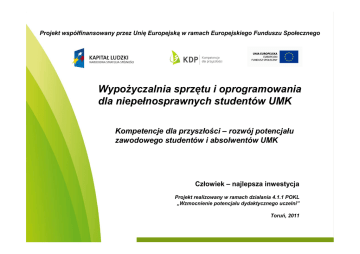 Projekt współfinansowany przez Unię Europejską w ramach Europejskiego Funduszu Społecznego Wypożyczalnia sprzętu i oprogramowania dla niepełnosprawnych studentów UMK Kompetencje dla przyszłości – rozwój potencjału zawodowego studentów i absolwentów UMK Człowiek – najlepsza inwestycja Projekt realizowany w ramach działania 4.1.1 POKL „Wzmocnienie potencjału dydaktycznego uczelni” Toruń, 2011 Wypożyczalnia sprzętu i oprogramowania dla niepełnosprawnych studentów UMK • Wypożyczalnię prowadzi Samodzielna Sekcja ds. Studentów Niepełnosprawnych • Regulamin wypożyczalni dostępny jest na stronie internetowej www.kdp.umk.pl Projekt współfinansowany przez Unię Europejską w ramach Europejskiego Funduszu Społecznego Wypożyczalnia sprzętu i oprogramowania dla niepełnosprawnych studentów UMK Na dzień dzisiejszy wypożyczalnia dysponuje sprzętem na który składa się m.in.: • 11 laptopów Projekt współfinansowany przez Unię Europejską w ramach Europejskiego Funduszu Społecznego Wypożyczalnia sprzętu i oprogramowania dla niepełnosprawnych studentów UMK •2 notatniki brajlowskie przeznaczone do sporządzania notatek głosowych podczas wykładów. Oprócz sporządzania notatek głosowych i odczytywania sporządzonych notatek można za ich pomocą odsłuchiwać książki mówione oraz dokumenty utworzone w formacie Daisy. Projekt współfinansowany przez Unię Europejską w ramach Europejskiego Funduszu Społecznego Wypożyczalnia sprzętu i oprogramowania dla niepełnosprawnych studentów UMK •6 klawiatur dla osób słabowidzących (ZoomText) Projekt współfinansowany przez Unię Europejską w ramach Europejskiego Funduszu Społecznego Wypożyczalnia sprzętu i oprogramowania dla niepełnosprawnych studentów UMK •2 klawiatury dla osób piszących jedną ręką Projekt współfinansowany przez Unię Europejską w ramach Europejskiego Funduszu Społecznego Wypożyczalnia sprzętu i oprogramowania dla niepełnosprawnych studentów UMK •drukarka brajlowska z szafą dźwiękoszczelną Projekt współfinansowany przez Unię Europejską w ramach Europejskiego Funduszu Społecznego Wypożyczalnia sprzętu i oprogramowania dla niepełnosprawnych studentów UMK •skaner przeznaczony do skanowania grubych materiałów, np. książek przystosowany do przetwarzania tekstu drukowanego do postaci cyfrowej. Projekt współfinansowany przez Unię Europejską w ramach Europejskiego Funduszu Społecznego Wypożyczalnia sprzętu i oprogramowania dla niepełnosprawnych studentów UMK Wypożyczalnia dysponuje również następującym oprogramowaniem: • Duxbury Braille Translator – aplikacja do tłumaczenia zwykłego tekstu na język Braille’a Projekt współfinansowany przez Unię Europejską w ramach Europejskiego Funduszu Społecznego Wypożyczalnia sprzętu i oprogramowania dla niepełnosprawnych studentów UMK •ZoomText Magnifier Pen Drive – aplikacja powiększa i uwydatnia wszystko, co znajduje się na ekranie komputera, automatycznie czyta dokumenty. Zaletą wersji USB jest możliwość instalacji programu na wielu komputerach i wykorzystywania tak gdzie jest w danej chwili potrzebny. Projekt współfinansowany przez Unię Europejską w ramach Europejskiego Funduszu Społecznego Wypożyczalnia sprzętu i oprogramowania dla niepełnosprawnych studentów UMK •Program Windows-Eyes PL pro Site -pozwala osobie niewidomej korzystać komputera działającego pod systemem Windows. Osoba niewidoma korzysta z klawiatury w celu obsługi systemu i programów natomiast wszystkie powiadomienia i teksty są odczytywane przez syntezator mowy lub wyświetlane na zewnętrznym monitorze brajlowskim. Dzięki temu możliwe jest przeglądanie Internetu, odtwarzanie multimediów, tworzenie dokumentów odbieranie poczty. Projekt współfinansowany przez Unię Europejską w ramach Europejskiego Funduszu Społecznego Wypożyczalnia sprzętu i oprogramowania dla niepełnosprawnych studentów UMK •Abby FineReader Professional 9.0 - inteligentne oprogramowanie pozwalające przekształcać zeskanowane dokumenty, pliki PDF i zdjęcia z aparatu cyfrowego do postaci umożliwiającej edycję i przeszukiwanie. Zaawansowane funkcje rozpoznawania dają użytkownikowi możliwość uwolnienia danych zawartych w dokumentach i obrazach, równocześnie eliminując potrzebę ręcznego przepisywania i formatowania. Projekt współfinansowany przez Unię Europejską w ramach Europejskiego Funduszu Społecznego Wypożyczalnia sprzętu i oprogramowania dla niepełnosprawnych studentów UMK Sprzęt i oprogramowanie zakupione zostało ze środków projektu „Kompetencje dla przyszłości - rozwój potencjału zawodowego studentów i absolwentów UMK" realizowanego w ramach Poddziałania 4.1.1 Programu Operacyjnego Kapitał Ludzki Projekt współfinansowany przez Unię Europejską w ramach Europejskiego Funduszu Społecznego Wypożyczalnia sprzętu i oprogramowania dla niepełnosprawnych studentów UMK Więcej informacji na temat wypożyczalni uzyskają Państwo w Samodzielnej Sekcji ds. Studentów Niepełnosprawnych oraz na stronie www.kdp.umk.pl Projekt współfinansowany przez Unię Europejską w ramach Europejskiego Funduszu Społecznego