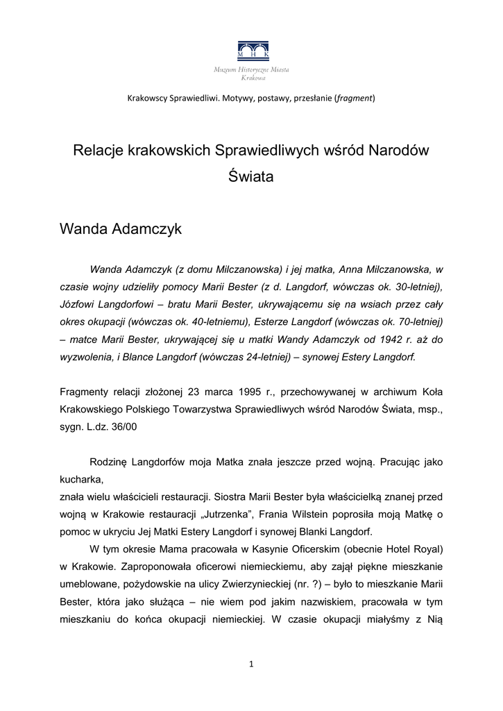 Krakowscy Sprawiedliwi. Motywy, postawy, przesłanie (fragment) Relacje krakowskich Sprawiedliwych wśród Narodów Świata Wanda Adamczyk Wanda Adamczyk (z domu Milczanowska) i jej matka, Anna Milczanowska, w czasie wojny udzieliły pomocy Marii Bester (z d. Langdorf, wówczas ok. 30-letniej), Józfowi Langdorfowi – bratu Marii Bester, ukrywającemu się na wsiach przez cały okres okupacji (wówczas ok. 40-letniemu), Esterze Langdorf (wówczas ok. 70-letniej) – matce Marii Bester, ukrywającej się u matki Wandy Adamczyk od 1942 r. aż do wyzwolenia, i Blance Langdorf (wówczas 24-letniej) – synowej Estery Langdorf. Fragmenty relacji złożonej 23 marca 1995 r., przechowywanej w archiwum Koła Krakowskiego Polskiego Towarzystwa Sprawiedliwych wśród Narodów Świata, msp., sygn. L.dz. 36/00 Rodzinę Langdorfów moja Matka znała jeszcze przed wojną. Pracując jako kucharka, znała wielu właścicieli restauracji. Siostra Marii Bester była właścicielką znanej przed wojną w Krakowie restauracji „Jutrzenka”, Frania Wilstein poprosiła moją Matkę o pomoc w ukryciu Jej Matki Estery Langdorf i synowej Blanki Langdorf. W tym okresie Mama pracowała w Kasynie Oficerskim (obecnie Hotel Royal) w Krakowie. Zaproponowała oficerowi niemieckiemu, aby zajął piękne mieszkanie umeblowane, pożydowskie na ulicy Zwierzynieckiej (nr. ?) – było to mieszkanie Marii Bester, która jako służąca – nie wiem pod jakim nazwiskiem, pracowała w tym mieszkaniu do końca okupacji niemieckiej. W czasie okupacji miałyśmy z Nią 1 Krakowscy Sprawiedliwi. Motywy, postawy, przesłanie (fragment) kontakty – po wojnie raz Ją spotkałam w Krakowie i powiedziała mi, że Jej Matka Estera Langdorf mieszka razem z Nią w Warszawie. Na wsiach – w Karsach i Szczurowej (pow. brzeski) ukrywał się Józef Langdorf. Na Woli Przemykowskiej i w Brzesku Blanka Langdorf – im też pomagała dowożąc żywność, ciepłą odzież i dokumenty. Często jeździłam z Mamą na te wsie. Nieraz z żydowskimi opaskami na rękawach wchodziłyśmy do getta i tam Żydzi umawiali się z Mamą, że na wypadek likwidacji getta w Brzesku, któraś z nas przyjedzie ich uwolnić ze skrytki – pokazali nam wejście z kuchni pod podłogą do piwnicy. Pamiętam jak raz w zimie dostałam wiadomość, że rano w tym dniu zostało zlikwidowane getto w Brzesku. Natychmiast pojechałam pociągiem do Brzeska – Mama wcześniej wyjechała na Wolę Przemykowską. W skrytce nie było nikogo – nie wiem do dzisiaj, czy ktoś z tych osób się uratował. Od 1945 r. ukrywała się u nas Blanka Langdorf (obecnie Maria Długowiejska, a Jej teściowa Estera Langdorf była u nas o rok wcześniej – do końca okupacji). W tym czasie mieszkałyśmy z Mamą przy placu Na Groblach nr 19 miesz. nr 20, I piętro – oficyna. Po prawej stronie od drzwi wejściowych – na drzwiach do spiżarki na długim metalowym wieszaku wisiały niedbale: płaszcze, szlafroki, torby i inne rzeczy – spiżarka służyła jako schowek na wypadek rewizji. Mieszkałyśmy bardzo biednie. Na środku pokoju w okrągłym, żelaznym piecyku (zwanym kozą) tliły się obierzyny z ziemniaków papiery i stare szmaty. Nie było na zakup węgla, a żywność była na kartki i często brakowało jej. Przywożona czasem przez nas ze wsi żywność była wymieniana za starą odzież czy buty, papierosy i za drożdże. Jednej nocy zimą 1943 r. gestapo przeprowadziło rewizję w naszym mieszkaniu. Ktoś nas zadenuncjował. Skrytki nie odnaleźli – ale mnie aresztowano, podejrzewając, że jestem Żydówką. Byłam zadowolona, że aresztowano mnie, bo wzięłam ze sobą swoje przedwojenne zdjęcia do komunii i świadectwa ze Szkoły 2 Krakowscy Sprawiedliwi. Motywy, postawy, przesłanie (fragment) Podstawowej z adnotacją: wyznanie rzymsko-katolickie. Po dwunastu godzinach i wylegitymowaniu – wypuszczono. Wszystkie osoby wymienione przeżyły wojnę. Estera i Józef Langdorf zmarli po wojnie. Z Blanką Langdorf obecnie Marią Długowiejską utrzymuję kontakty i odwiedzam Ją, często dzwonimy do siebie. [...] Irena Wallisch Fragmenty relacji złożonej 11 sierpnia 2000 r., przechowywanej w archiwum Koła Krakowskiego Polskiego Towarzystwa Sprawiedliwych wśród Narodów Świata, msp., sygn. L.dz. 51/00, L. dz. 56/00 [...] Wojna zastała mnie i męża w Polsce, we Lwowie. W końcu 1939 r. po ucieczce ze Lwowa przed Sowietami, zamieszkaliśmy w Krakowie. W czasie okupacji niemieckiej w Krakowie, dokąd uciekliśmy zostawiając wszystko na wschodzie, nie znaliśmy żadnych Żydów, w przeciwieństwie do sytuacji we Lwowie, gdzie miałam wiele przyjaciółek Żydówek, szczególnie na Uniwersytecie. Po zamieszkaniu w Krakowie szukałam kuchenki gazowej. Powiedziano mi, że mogę ją nabyć u pani Szenitzer. Tam przypadkowo znajdowała się pani Mandelberger. W pewien czas potem, kiedy zaczęła się ostra nagonka na Żydów, zapukano do drzwi mojego mieszkania przy ul. Batorego. We drzwiach stała pani Mandelberger i pamiętam doskonale, że powiedziała te słowa: „Nie znam żadnych katolików w Krakowie, tylko moją fryzjerkę i Panią. Widziałam Pani oczy i wiem, że Pani mnie nie odrzuci”. Powiedziałam: „Na pewno nie – proszę wejść”. Na co pani Mandleberger odpowiedziała: „Na dole czekamoja córka”. Obie panie weszły do tylnego pokoju. Dwa pokoje zajmował niemiecki sędzia, który pozwolił nam zostać w tylnym pokoju w celu pokrywania kosztów mieszkania. 3 Krakowscy Sprawiedliwi. Motywy, postawy, przesłanie (fragment) Obie panie zamieszkały w naszym pokoju. Na jednym łóżku spaliśmy z mężem, na drugim pani Mandelberger z córką. Ta sytuacja była bardzo trudna, bo ja nie mogłam wyjść z domu, aby Niemiec nie natknął się na panią Mandelberger, i trwała przez dwa tygodnie. Potem jedna uproszona przez mnie pani wzięła je na dwa tygodnie. Ja przez ten czas szukałam dla pań Mandelberger schronienia. Najpierw znalazłam prowi