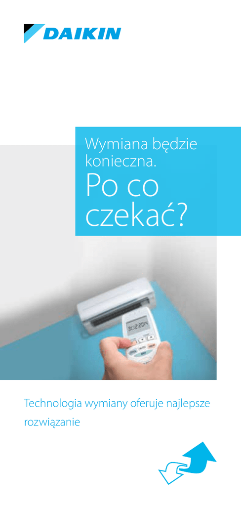 Wymiana będzie konieczna. Po co czekać? Technologia wymiany oferuje najlepsze rozwiązanie Nadszedł czas na wymianę systemu 01.01 na czynnik 2 015 chłodniczy R22 Dlaczego należy działać już teraz? Nie ma możliwości naprawiania klimatyzatorów na czynnik chłodniczy R22 Niskie koszty eksploatacji Wkład w ochronę środowiska Zwiększenie komfortu UE* zdecydowała, że od dnia 1 stycznia 2015 roku, używanie czynnika chłodniczego R22 zostało zakazane, co uniemożliwa serwisowanie i konserwowanie systemów na czynnik chłodniczy R22 - jest to powód do podjęcia szybkich działań. Jeżeli nadal korzystasz z systemu na czynnik chłodniczy R22, nadszedł czas poznania technologii zamiennej. * Dyrektywa UE: Regulacja [KE] nr 2037/2000 Czym jest R22? R22 to czynnik chłodniczy powszechnie wykorzystywany w systemach klimatyzacyjnych. Ze względu na jego szkodliwy wpływ na środowisko oraz warstwę ozonową, Protokół Montrealski zmodyfikowany przez UE nakazał zakończenie dostaw czynnika chłodniczego R22 do 2015 roku. Daikin Emura Zmiana na lepsze! Zwiększ swój komfort, korzystając z nowatorskiego wzornictwa, niskich poziomów głośności, kontroli wifi i innych funkcji… • Najlepsze wzornictwo i funkcjonalność Aktualizacja do systemu R-410A lub R32 zapewni dostęp do szerokiej gamy innowacyjnych jednostek wewnętrznych, które przodują pod względem wzornictwa, komfortu i funkcjonalności, np. wielokrotnie nagradzana Daikin Emura. • Bardzo cicha praca Jednostki wewnętrzne firmy Daikin działają bardzo cicho. Poziom mocy akustycznej spada do 19dBA! • Zawsze pod kontrolą, z każdego miejsca! Kontrola WIFI możliwa dla prawie wszystkich jednostek split. Możliwość sterowania jednostką wewnętrzną z dowolnego miejsca za pośrednictwem smartfona lub tabletu. Nexura FTXS-K Oszczędność na instalacji nowego R-410A lub R32 Całkowicie płaska • Zaawansowane technologie Teraz jest najlepszy czas na wykorzystanie naszych zaawansowanych technologii, na przykład nowej Ururu Sarara, która łączy w sobie funkcje nawilżania, osuszania, wentylacji i oczyszczania. Ururu Sarara wyposażono także w automatycznie czyszczące się filtry, charakteryzuje ją udoskonalony wzorzec nawiewu powietrza wykorzystujący efekt Coandy oraz czujniki przekierowujące nawiew powietrza do pustych miejsc, aby uniknąć przeciągów. • Zmiana jest nieunikniona… … ale to zmiana na lepsze. Nasze nowe jednostki znajdują się w czołówce pod względem wzornictwa oraz efektywności, dzięki czemu w mniejszym stopniu oddziałują na środowisko. Decydując się teraz na wymianę, skorzystasz z większych poziomów komfortu, najnowszej technologii oraz niższych kosztów eksploatacyjnych. kaseta Ile można zaoszczędzić wymieniając system? Wykonaj test na stronie daikineurope.com Oszczędności na kosztach eksploatacyjnych Porównanie w oparciu o EER (efektywność produktu w trybie chłodzenia) -33% oszczędności Roczne zużycie energii R22 R-410A Porównanie w oparciu o SEER (efektywność produktu zgodnie z bieżącymi przepisami sezonowymi produktu w trybie chłodzenia) -50% oszczędności Roczne zużycie energii R22 R-410A Czy wiesz, jaki czynnik chłodniczy znajduje się w Twoim systemie klimatyzacji? Gdzie znajdują się informacje Informacje szczegółowe na temat urządzenia znajdują się na tabliczce znamionowej na jednostce zewnętrznej lub w instrukcji obsługi. Daikin Europe N.V. Naamloze Vennootschap Zandvoordestraat 300 · 8400 Oostende Belgia · www.daikin.eu · BE 0412 120 336 · RPR Oostende (odpowiedzialny wydawca) ECPPL15-01802/15 Niniejsza publikacja została przygotowana w formie informacyjnej i nie stanowi oferty wiążącej Daikin Europe N.V. Treść publikacji powstała w oparciu o najlepszą wiedzę Daikin Europe N.V. Nie udzielamy pośredniej i bezpośredniej gwarancji na kompletność, dokładność, rzetelność lub przydatność do określonego celu treści oraz produktów i usług przedstawionych w niniejszym wydawnictwie. Dane techniczne mogą ulec zmianie bez wcześniejszego powiadomienia. Daikin Europe N.V. nie ponosi odpowiedzialności za jakiekolwiek szkody bezpośrednie lub pośrednie, wynikające z lub związane z użyciem i/lub sposobem interpretacji niniejszej publikacji. Firma Daikin Europe N.V. posiada prawa autorskie całości przedstawionej treści. Przygotowano przez La Movida, Belgia.