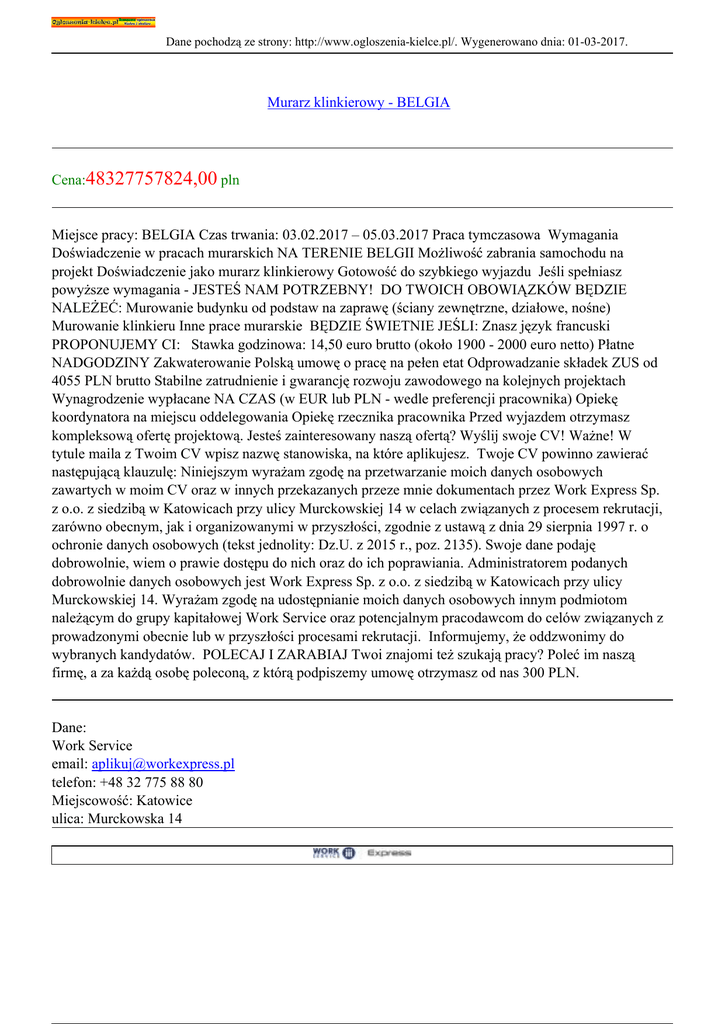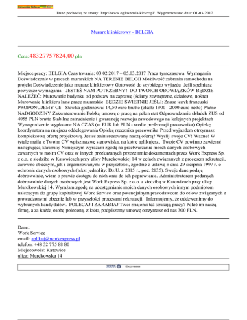 Dane pochodzą ze strony: http://www.ogloszenia-kielce.pl/. Wygenerowano dnia: 01-03-2017. Murarz klinkierowy - BELGIA Cena:48327757824,00 pln Miejsce pracy: BELGIA Czas trwania: 03.02.2017 – 05.03.2017 Praca tymczasowa Wymagania Doświadczenie w pracach murarskich NA TERENIE BELGII Możliwość zabrania samochodu na projekt Doświadczenie jako murarz klinkierowy Gotowość do szybkiego wyjazdu Jeśli spełniasz powyższe wymagania - JESTEŚ NAM POTRZEBNY! DO TWOICH OBOWIĄZKÓW BĘDZIE NALEŻEĆ: Murowanie budynku od podstaw na zaprawę (ściany zewnętrzne, działowe, nośne) Murowanie klinkieru Inne prace murarskie BĘDZIE ŚWIETNIE JEŚLI: Znasz język francuski PROPONUJEMY CI: Stawka godzinowa: 14,50 euro brutto (około 1900 - 2000 euro netto) Płatne NADGODZINY Zakwaterowanie Polską umowę o pracę na pełen etat Odprowadzanie składek ZUS od 4055 PLN brutto Stabilne zatrudnienie i gwarancję rozwoju zawodowego na kolejnych projektach Wynagrodzenie wypłacane NA CZAS (w EUR lub PLN - wedle preferencji pracownika) Opiekę koordynatora na miejscu oddelegowania Opiekę rzecznika pracownika Przed wyjazdem otrzymasz kompleksową ofertę projektową. Jesteś zainteresowany naszą ofertą? Wyślij swoje CV! Ważne! W tytule maila z Twoim CV wpisz nazwę stanowiska, na które aplikujesz. Twoje CV powinno zawierać następującą klauzulę: Niniejszym wyrażam zgodę na przetwarzanie moich danych osobowych zawartych w moim CV oraz w innych przekazanych przeze mnie dokumentach przez Work Express Sp. z o.o. z siedzibą w Katowicach przy ulicy Murckowskiej 14 w celach związanych z procesem rekrutacji, zarówno obecnym, jak i organizowanymi w przyszłości, zgodnie z ustawą z dnia 29 sierpnia 1997 r. o ochronie danych osobowych (tekst jednolity: Dz.U. z 2015 r., poz. 2135). Swoje dane podaję dobrowolnie, wiem o prawie dostępu do nich oraz do ich poprawiania. Administratorem podanych dobrowolnie danych osobowych jest Work Express Sp. z o.o. z siedzibą w Katowicach przy ulicy Murckowskiej 14. Wyrażam zgodę na udostępnianie moich danych osobowych innym podmiotom należącym do grupy kapitałowej Work Service oraz potencjalnym pracodawcom do celów związanych z prowadzonymi obecnie lub w przyszłości procesami rekrutacji. Informujemy, że oddzwonimy do wybranych kandydatów. POLECAJ I ZARABIAJ Twoi znajomi też szukają pracy? Poleć im naszą firmę, a za każdą osobę poleconą, z którą podpiszemy umowę otrzymasz od nas 300 PLN. Dane: Work Service email: [email protected] telefon: +48 32 775 88 80 Miejscowość: Katowice ulica: Murckowska 14
