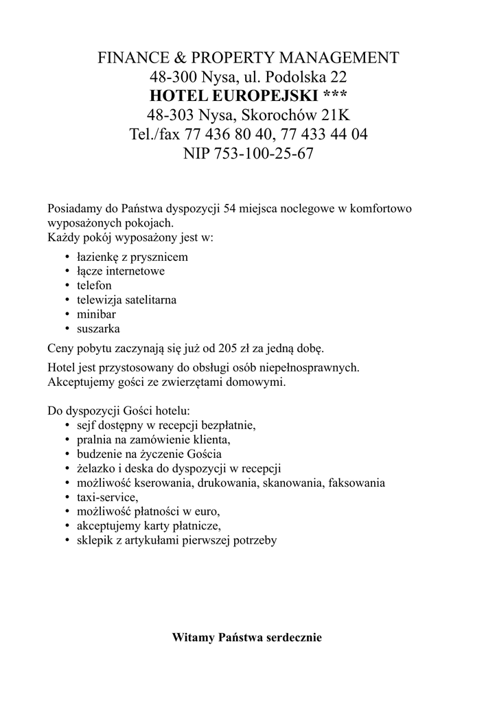 FINANCE & PROPERTY MANAGEMENT 48-300 Nysa, ul. Podolska 22 HOTEL EUROPEJSKI *** 48-303 Nysa, Skorochów 21K Tel./fax 77 436 80 40, 77 433 44 04 NIP 753-100-25-67 Posiadamy do Państwa dyspozycji 54 miejsca noclegowe w komfortowo wyposażonych pokojach. Każdy pokój wyposażony jest w: • • • • • • łazienkę z prysznicem łącze internetowe telefon telewizja satelitarna minibar suszarka Ceny pobytu zaczynają się już od 205 zł za jedną dobę. Hotel jest przystosowany do obsługi osób niepełnosprawnych. Akceptujemy gości ze zwierzętami domowymi. Do dyspozycji Gości hotelu: • sejf dostępny w recepcji bezpłatnie, • pralnia na zamówienie klienta, • budzenie na życzenie Gościa • żelazko i deska do dyspozycji w recepcji • możliwość kserowania, drukowania, skanowania, faksowania • taxi-service, • możliwość płatności w euro, • akceptujemy karty płatnicze, • sklepik z artykułami pierwszej potrzeby Witamy Państwa serdecznie W Hotelu Europejskim Dziękujemy Państwu za obdarzenie nas zaufaniem i wybranie naszego hotelu jako miejsca pobytu. Personel dołoży wszelkich starań aby czas spędzony w hotelu upłynął Państwu w miłej i spokojnej atmosferze. Restauracja hotelu poleca Państwu wyśmienitą europejską kuchnię, jak również tradycyjne polskie potrawyprzygotowane z najwyższej jakości produktów. Wychodząc naprzeciw najbardziej wyrafinowanym gustom naszych Gości, Vip Cognac Club oferuje bogaty wybór alkoholi, drinków i koktajli. Klasyczna elegancka restauracja, intymna atmosfera klubu pozwolą Państwu odpocząć po dniu pełnym zajęć lub męczącej podróży. Kompetentny i dyskretny personel zapewni Państwu sprawną obsługę i służyć będzie pomocą i radą. Z życzeniami udanego pobytu Dyrekcja Hotelu Europejskiego w Skorochowie REGULAMIN HOTELOWY Dyrekcja Hotelu bedzie wysoko cenić Państwa współpracę w przestrzeganiu tego regulaminu, który służyc ma zapewnieniu spokojnego i bezpiecznego pobytu naszych Gości. §1 1. Pokój hotelu wynajmowany jest na doby. Doba hotelowa trwa od godziny 14.00 do godziny 12 dnia następnego 2. Jeśli Gość nie określił czasu pobytu najmując pokój, przyjmuje się, że pokój został wynajęty na jedną dobę. §2 1. Życzenie przedłużenia pobytu poza okres wskazany w dniu przybycia, Gość hotelowy powinien zgłosić w recepcji do godziny 12.00 dnia w którym upływa termin najmu pokoju. 2. Hotel uwzgledni życzenie przedłużenia pobytu w miare posiadanych możliwości. §3 1. Gość hotelowy nie może przekazać pokoju innym osobom, nawet jeśli nie upłynął okres, za który uiscił należna za pobyt opłatę 2. Osoby niezameldowane w Hotelu, moga przebywać w pokoju hotelowym od godziny 7.00 do godziny 22.00 3. Hotel może odmówić przyjecia Gościa, który podczas poprzedniego pobytu rażąco naruszył regulamin hotelowy wyrządzajac szkodę w mieniu hotelowym lub Gości albo szkodę na osobie Gości, pracowników hotelu lub innych osób przebywających w Hotelu; albo też w inny sposób zakłócił spokojny pobyt Gości lub funkcjonowanie Hotelu Europejskiego. §4 1. Hotel świadczy usługi zgodnie ze swoją kategorią i standardem. W przypadku zastrzeżeń dotyczących jakości usług, Gość proszony jest o jak najszybsze zgłaszanie ich w recepcji, co umożliwi Hotelowi niezwłoczną reakcję. 2. Hotel ma obowiązek zapewnić: 1) warunki pełnego nieskrępowanego wypoczynku Gościa, 2) bezpieczeństwo pobytu, w tym bezpieczeństwo zachowania tajemnicy informacji o Gościu 3) profesjonalną i uprzejmą obsługę w zakresie wszystkich usług świadczonych w Hotelu, 4) sprzątanie w pokoju i wykonywanie niezbędnej naprawy urządzeń podczas nieobecności Gościa, a w Jego obecności tylko wówczas gdy wyrazi takie życzenie, 5) sprawną pod wzgledem technicznym obsługę; w przypadku wystąpienia usterek które nie będą mogły być usunięte, Hotel dołoży starań, aby w miarę posiadanych możliwości – zamienić pokój lub w inny sposób załagodzić niedogodności. §5 Na życzenie Gościa Hotel świadczy nieodpłatnie następujace usługi: 1) udzielenie informacji związanych z pobytem i podróżą 2) budzenie o oznaczonej godzinie 3) przechowywanie pieniędzy i przedmiotówwartościowych w czasie pobytu Gościa w Hotelu 4) przechowywanie bagażu w terminach innych niz daty pobytu Gościa oraz rzeczy nie majacych cech bagażu osobistego 5) sprzątanie pokoju §6 1. Hotel nie ponosi odpowiedzialności za uszkodzenie lub utratę rzeczy wniesionych przez osoby korzystajace z jego usług w zakresie określonym przepisami art. 846-852 Kodeksu Cywilnego. 2. Gość powinien zawiadomić recepcję hotelową o wystąpieniu szkody, nizwłocznie po jej stwierdzeniu §7 Hotel nie ponosi odpowiedzialności za uszkodzenie lub utratę samochodu lub innego pojazdu należącego do Gościa, jeśli pozostawiony został w innym miejscu niż hotelowy parking strzeżony. §8 1. W Hotelu obowiązuje zachowanie ciszy od godziny 22.00 do godziny 7.00 dnia następnego. 2. Zachowanie Gości i osób korzystajacych z usług Hotelu nie powinno zakłócac spokojnego pobytu innych Gości. Hotel może odmówić dalszego świadczenia usług osobie, która narusza tą zasadę. §9 1. Każdorazowo opuszczajac pokój, Gośc powinien sprawdzić zamknięcie drzwi i pozostawic klucz w recepcji. Recepcja wydaje klucz na podstawie karty pobytu. 2. Gość hotelowy ponosi odpowiedzialność materialną za wszelkiego rodzaju uszkodzenia lub zniszczenia przedmiotów, wyposażenia lub urządzeń technicznych Hotelu powstałe z jego winy lub winy odwiedzajacych go osób. 3. Ze względu na bezpieczeństwo przeciwpożarowe zabronione jest używanie w pokojach hotelowych grzałek, żelazek elektrycznych i innych urządzeń nie stanowiących wyposażenia pokoju. §10 Przedmioty osobistego użytku pozostawione przez wyjeżdżającego Gościa w pokoju Hotelowym będą odesłane na adres przez Gościa wskazany