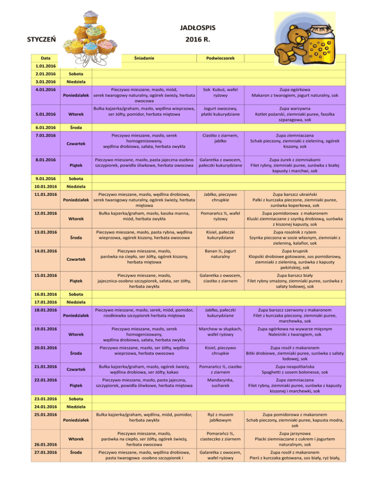 JADŁOSPIS STYCZEŃ 2016 R. Data Dzień 1.01.2016 Piątek 2.01.2016 Sobota 3.01.2016 Niedziela 4.01.2016 Wtorek 6.01.2016 Środa 7.01.2016 Czwartek Piątek 9.01.2016 Sobota 10.01.2016 Niedziela 11.01.2016 12.01.2016 13.01.2016 Bułka kajzerka/graham, masło, wędlina wieprzowa, ser żółty, pomidor, herbata miętowa Jogurt owocowy, płatki kukurydziane Zupa warzywna Kotlet pożarski, ziemniaki puree, fasolka szparagowa, sok Pieczywo mieszane, masło, serek homogenizowany, wędlina drobiowa, sałata, herbata zwykła Ciastko z ziarnem, jabłko Zupa ziemniaczana Schab pieczony, ziemniaki z zieleniną, ogórek kiszony, sok Pieczywo mieszane, masło, pasta jajeczna osobno szczypiorek, powidła śliwkowe, herbata owocowa Galaretka z owocem, pałeczki kukurydziane Zupa żurek z ziemniakami Filet rybny, ziemniaki puree, surówka z białej kapusty i marchwi, sok Jabłko, pieczywo chrupkie Zupa barszcz ukraiński Pałki z kurczaka pieczone, ziemniaki puree, surówka koperkowa, sok Pomarańcz ½, wafel ryżowy Zupa pomidorowa z makaronem Kluski ziemniaczane z szynką drobiową, surówka z kiszonej kapusty, sok Środa Pieczywo mieszane, masło, pasta rybna, wędlina wieprzowa, ogórek kiszony, herbata owocowa Kisiel, pałeczki kukurydziane Zupa rosolnik z ryżem Szynka pieczona w sosie własnym, ziemniaki z zieleniną, kalafior, sok Pieczywo mieszane, masło, parówka na ciepło, ser żółty, ogórek kiszony, herbata miętowa Banan ½, jogurt naturalny Zupa krupnik Klopsiki drobiowe gotowane, sos pomidorowy, ziemniaki z zieleniną, surówka z kapusty pekińskiej, sok Pieczywo mieszane, masło, jajecznica-osobno szczypiorek, sałata, ser żółty, herbata zwykła Galaretka z owocem, ciastko z ziarnem Zupa barszcz biały Filet rybny smażony, ziemniaki puree, surówka z sałaty lodowej, sok Pieczywo mieszane, masło, serek, miód, pomidor, rzodkiewka szczypiorek herbata miętowa Jabłko, pałeczki kukurydziane Zupa barszcz czerwony z makaronem Filet z kurczaka pieczony, ziemniaki puree, marchewka, sok Pieczywo mieszane, masło, serek homogenizowany, wędlina drobiowa, sałata, herbata zwykła Marchew w słupkach, wafel ryżowy Zupa ogórkowa na wywarze mięsnym Naleśniki z twarogiem, sok Pieczywo mieszane, masło, ser żółty, wędlina wieprzowa, herbata owocowa Kisiel, pieczywo chrupkie Zupa rosół z makaronem Bitki drobiowe, ziemniaki puree, surówka z sałaty lodowej, sok Bułka kajzerka/graham, masło, ogórek świeży, wędlina drobiowa, ser żółty, kakao Pomarańcz ½, ciastko z ziarnem Zupa neapolitańska Spaghetti z sosem bolonesse, sok Pieczywo mieszane, masło, pasta jajeczna, szczypiorek, powidła śliwkowe, herbata miętowa Mandarynka, sucharek Zupa ziemniaczana Filet rybny, ziemniaki puree, surówka z kapusty kiszonej i marchewki, sok Bułka kajzerka/graham, wędlina, miód, pomidor, herbata zwykła Ryż z musem jabłkowym Zupa pomidorowa z makaronem Schab pieczony, ziemniaki puree, kapusta modra, sok Pieczywo mieszane, masło, parówka na ciepło, ser żółty, ogórek świeży, herbata owocowa Pomarańcz ½, ciasteczko z ziarnem Zupa jarzynowa Placki ziemniaczane z cukrem i jogurtem naturalnym, sok Pieczywo mieszane, masło, wędlina drobiowa, pasta twarogowa -osobno szczypiorek i Galaretka z owocem, wafel ryżowy Zupa rosół z makaronem Pierś z kurczaka gotowana, sos biały, ryż biały, Piątek 16.01.2016 Sobota 17.01.2016 Niedziela 18.01.2016 Poniedziałek 19.01.2016 Wtorek 20.01.2016 Środa Czwartek Piątek 23.01.2016 Sobota 24.01.2016 Niedziela Poniedziałek Wtorek 26.01.2016 27.01.2016 Zupa ogórkowa Makaron z twarogiem, jogurt naturalny, sok Bułka kajzerka/graham, masło, kaszka manna, miód, herbata zwykła 15.01.2016 25.01.2016 Sok Kubuś, wafel ryżowy Wtorek Czwartek 22.01.2016 Obiad Pieczywo mieszane, masło, wędlina drobiowa, Poniedziałek serek twarogowy naturalny, ogórek świeży, herbata miętowa 14.01.2016 21.01.2016 Podwieczorek Pieczywo mieszane, masło, miód, Poniedziałek serek twarogowy naturalny, ogórek świeży, herbata owocowa 5.01.2016 8.01.2016 Śniadanie Środa rzodkiewka, herbata miętowa 28.01.16 Czwartek 29.01.2016 Piątek 30.01.2016 Sobota 31.01.2016 Niedziela marchewka gotowana, sok Bułka kajzerka/graham, wędlina wieprzowa, dżem, ogórek kiszony, herbata zwykła Budyń waniliowy, banan Zupa barszcz czerwony z makaronem Klopsiki drobiowe gotowane w sosie koperkowym na słodko-kwaśno, ziemniaki puree, surówka z sałaty lodowej, sok Pieczywo mieszane, pasta jajeczna-osobno szczypiorek, powidła śliwkowe, herbata zwykła z cytryną Jogurt naturalny z mussli Zupa owocowa z makaronem Paluszki rybne, ziemniaki puree, surówka z białej kapusty, sok